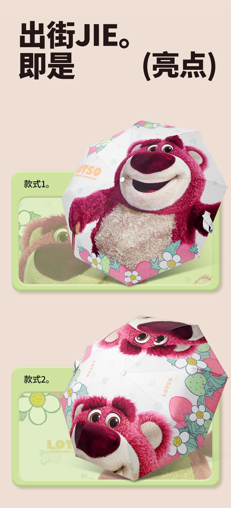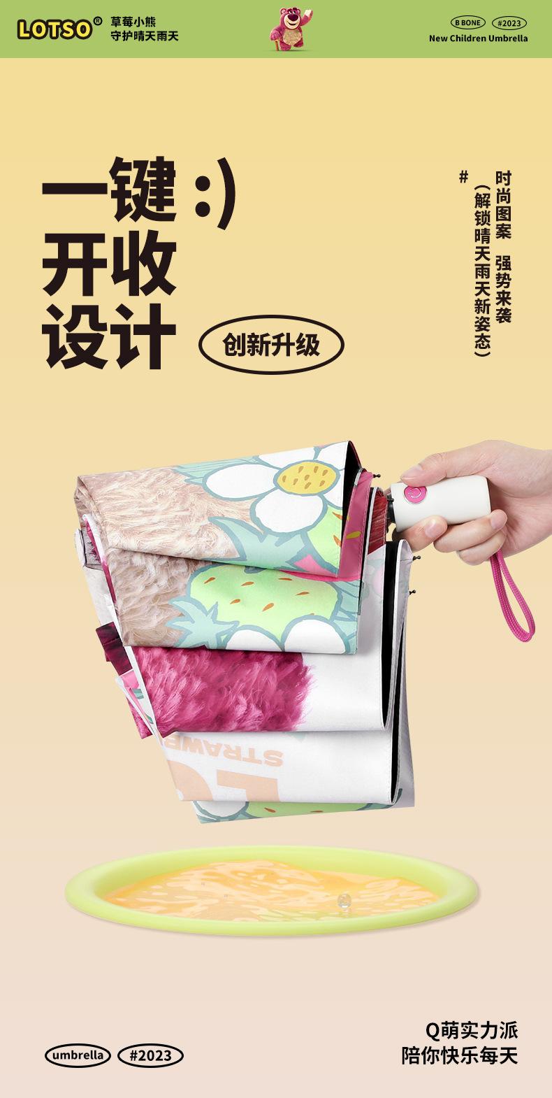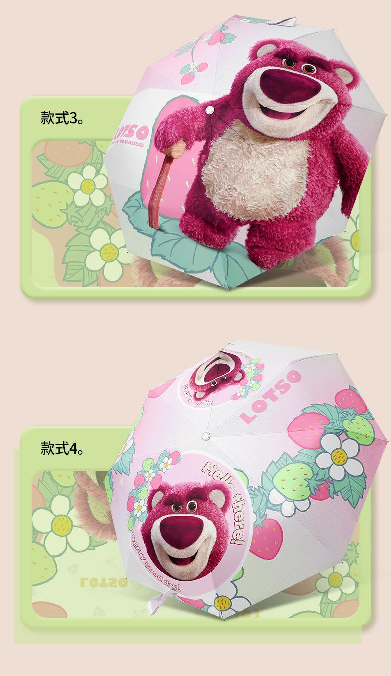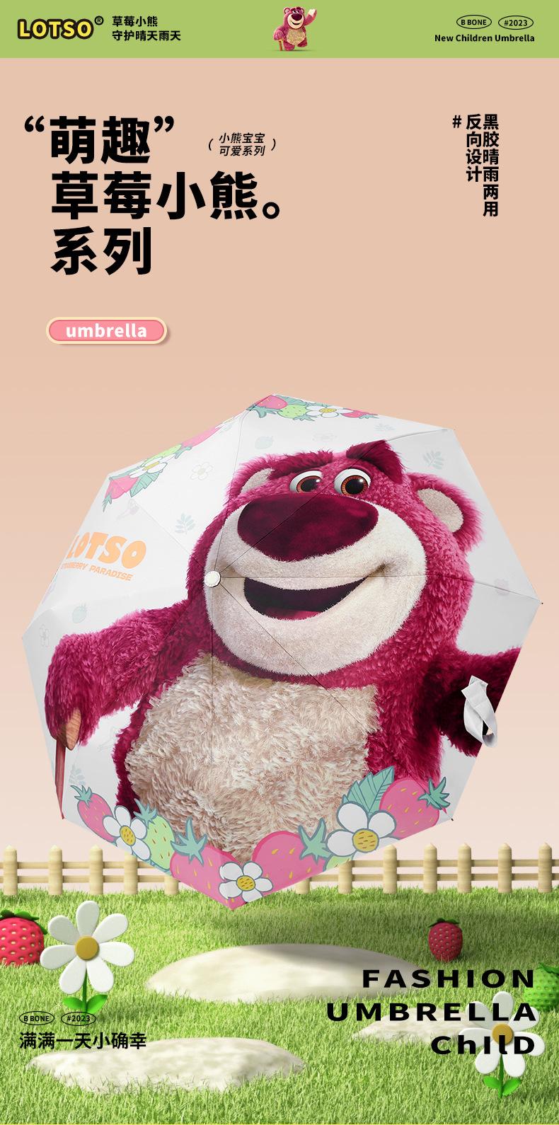 Tri-fold automatic strawberry bear-white background, Tri-fold automatic strawberry bear-pink bottom, Hand Open...