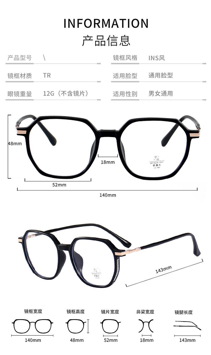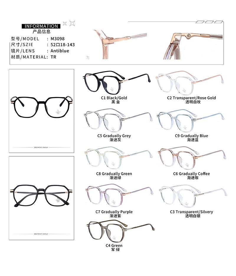 Gafas M3098 TR90 ligeras con montura lateral brillante y antiluz azul para mujer, gafas planas para miopía sin maquillaje