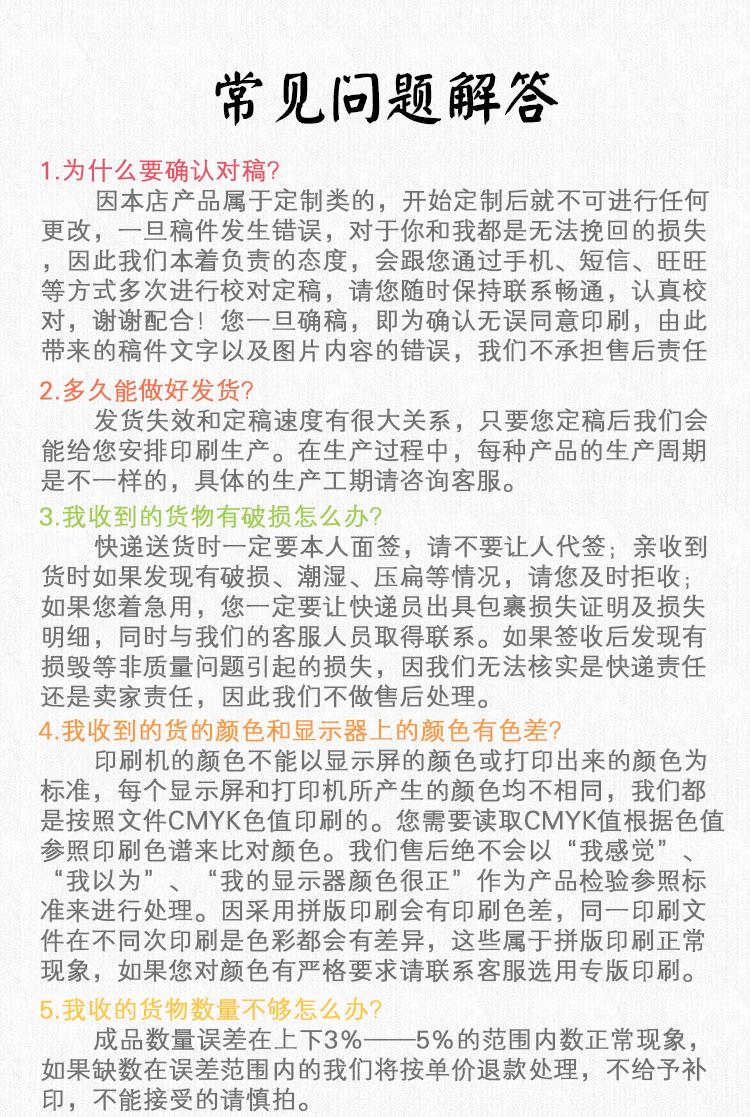 Tras recibir el material impreso, recibí los siguientes comentarios: "Es diferente a lo que esperaba", "Creo que el color es demasiado oscuro o demasiado claro", "Lo que vi en la computadora no es así", "¿Qué color imprimió la imprenta anterior?", "El papel es diferente al que tenía antes", etc. Estas solicitudes de reembolso y descuentos se basan en la imaginación y la subjetividad. Dado que la impresión de cada imprenta es diferente, los lotes de impresión de una misma imprenta son diferentes y la presentación es distinta, no podemos usar esto como excusa. Es cierto; solo puede seguir los procedimientos de impresión normales. Si tiene alguna objeción, tenga cuidado al imprimir.