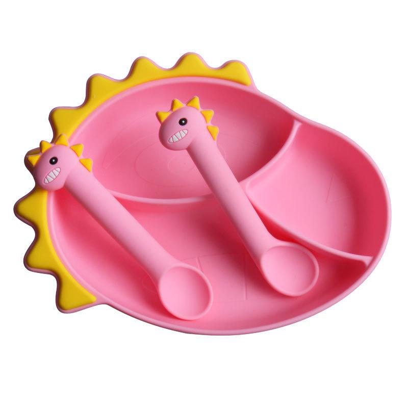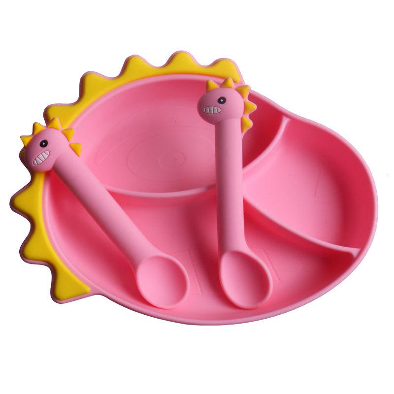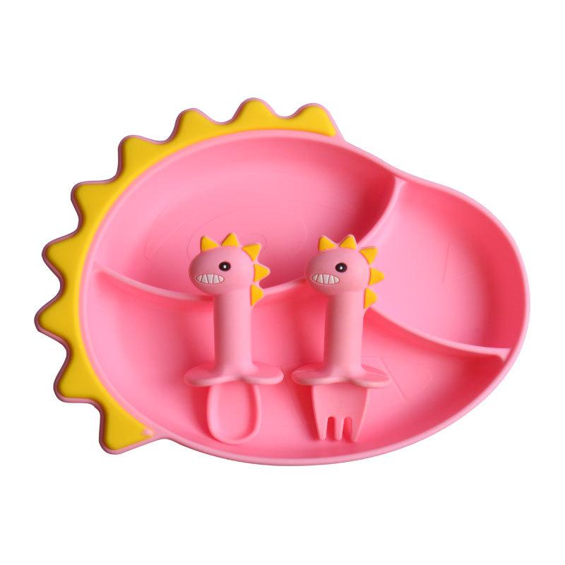Dark green: dinosaur dinner plate + dinosaur silicone short fork and spoon, Pink: dinosaur dinner plate + dino...