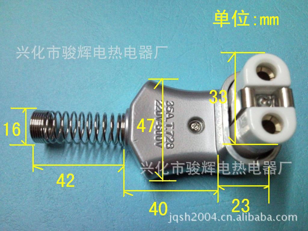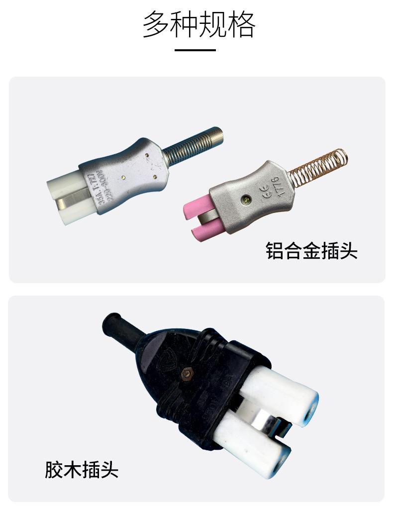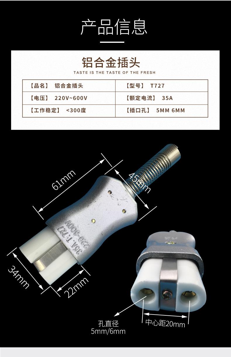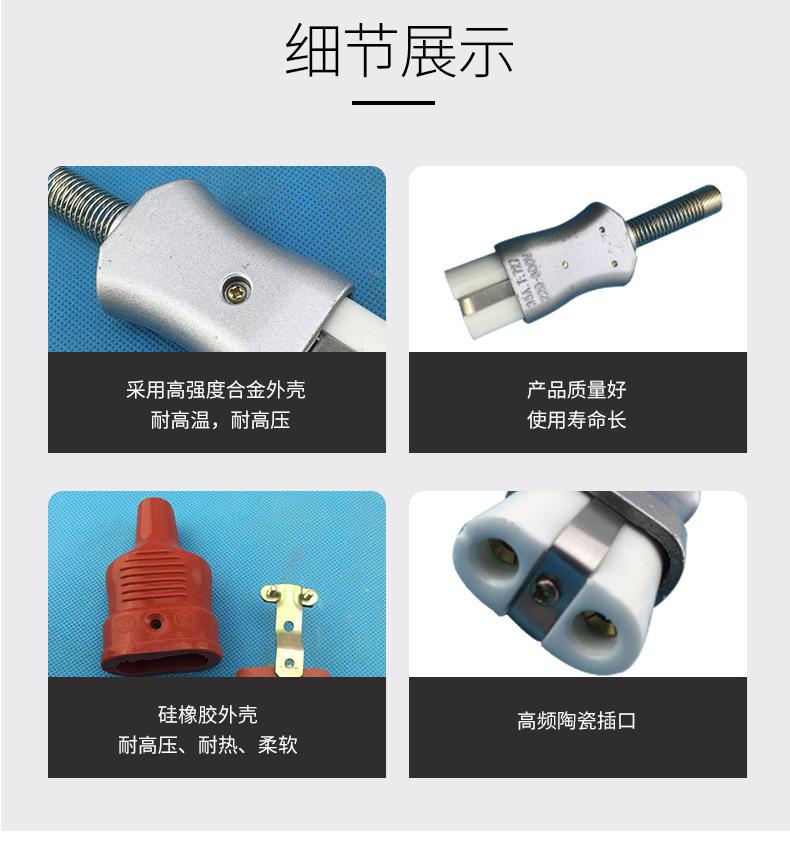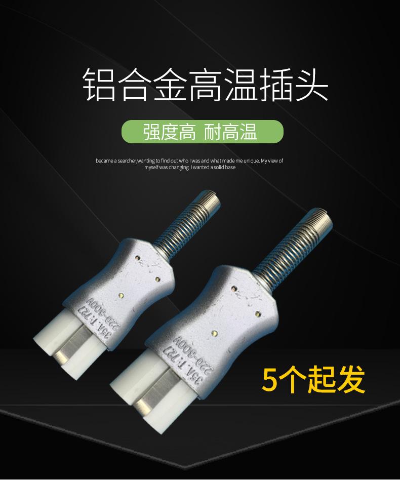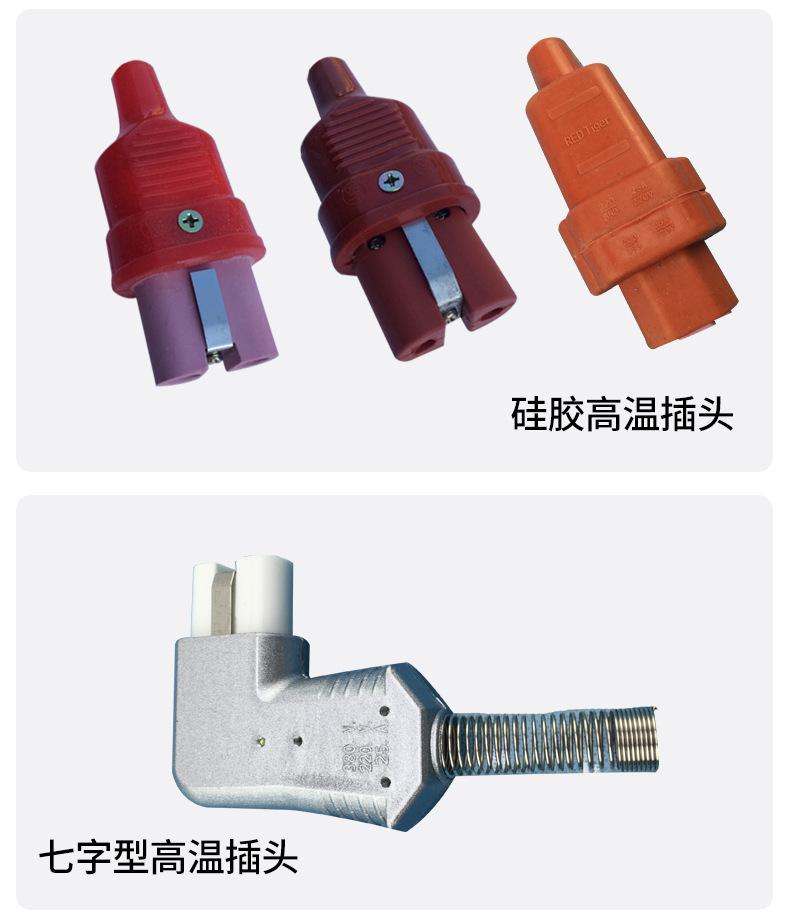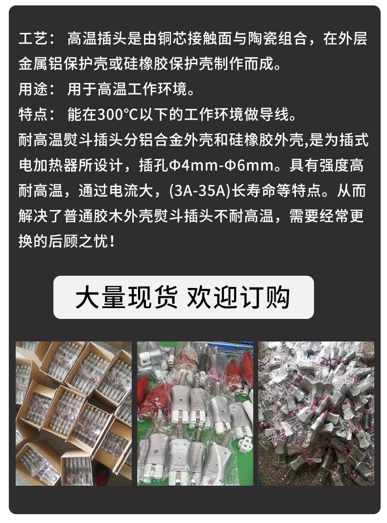 Características del producto: 1. La carcasa de goma de silicona es resistente a altas temperaturas, por debajo de 200°C, y alto voltaje (220V~600V). La junta suave de fluorocaucho de 25A es resistente a ácidos, álcalis y a prueba de roturas. Las especificaciones del conector son ¢5 y ¢6mm. Garantía de calidad y larga vida útil. 2. La carcasa especial de aleación de aluminio de alta resistencia y resistente a altas temperaturas se fabrica introduciendo datos extranjeros. Es resistente a altas temperaturas, por debajo de 500~C, y alto voltaje (220V a 600V). Tiene una larga vida útil y cada tamaño de orificio es ¢5, ¢6mm. Ámbito de aplicación: Ampliamente utilizado en maquinaria de plástico, maquinaria alimentaria, industria química y otras industrias de apoyo y varios cableados de enchufes de alimentación de alta temperatura. Observaciones: 1. Utilice tela de alta temperatura para envolver los cables engarzados de los diversos enchufes para calentadores eléctricos anteriores, y añada tarjetas de cableado para el cableado. 2. ① Cable de alta temperatura (o cable de goma de silicona) ② Goma de silicona ③ Porcelana de alta botella ④ Cerámica 95 ⑤ Plástico pulverizado de aleación de aluminio ⑥ Resorte niquelado ⑦ Baquelita (cable de fibra de vidrio) ⑧ Pulido de aleación de aluminio