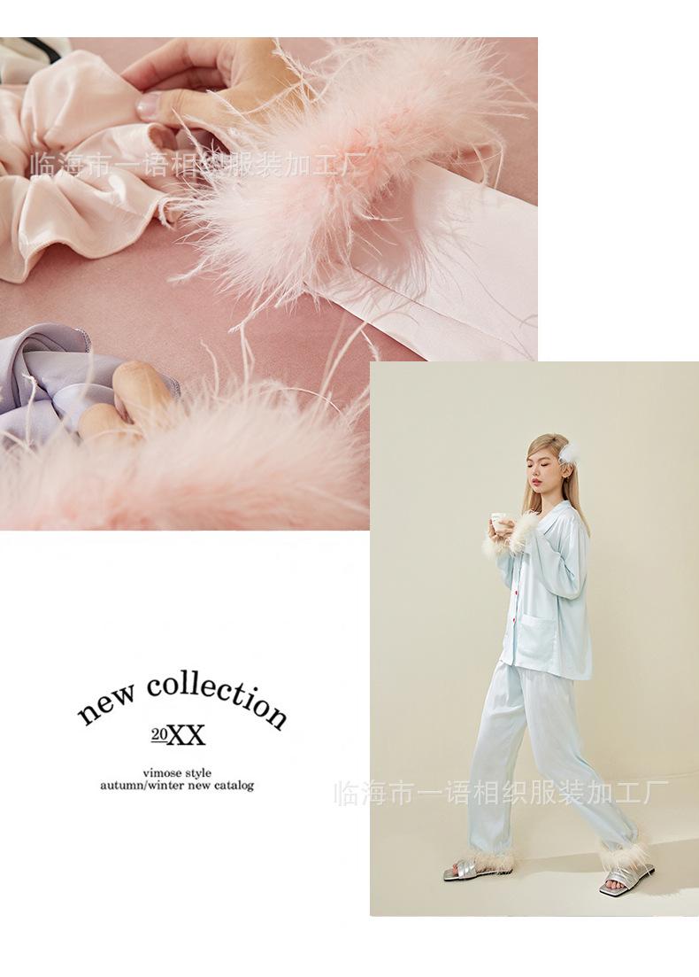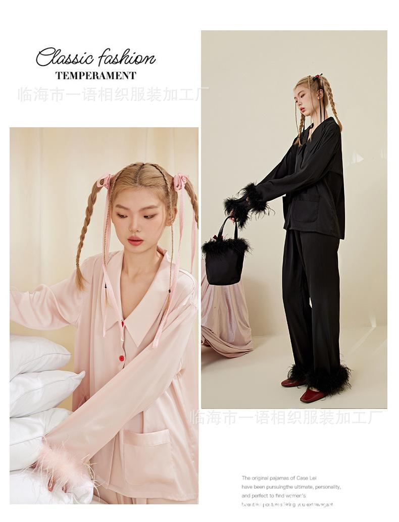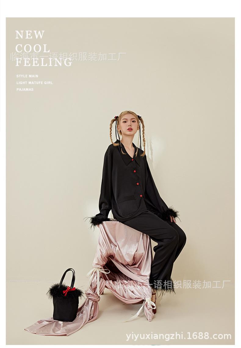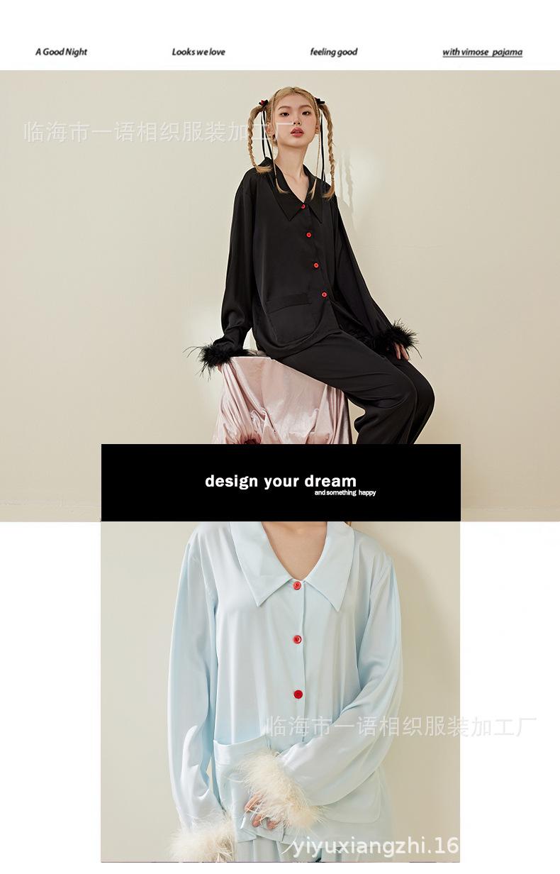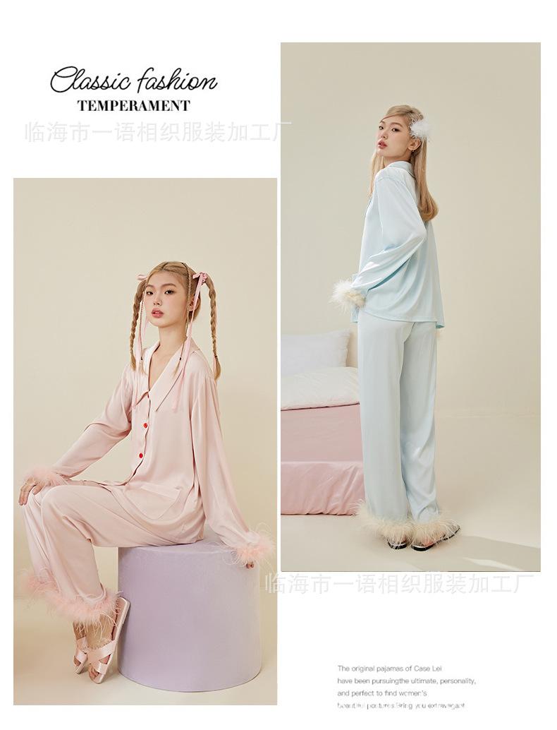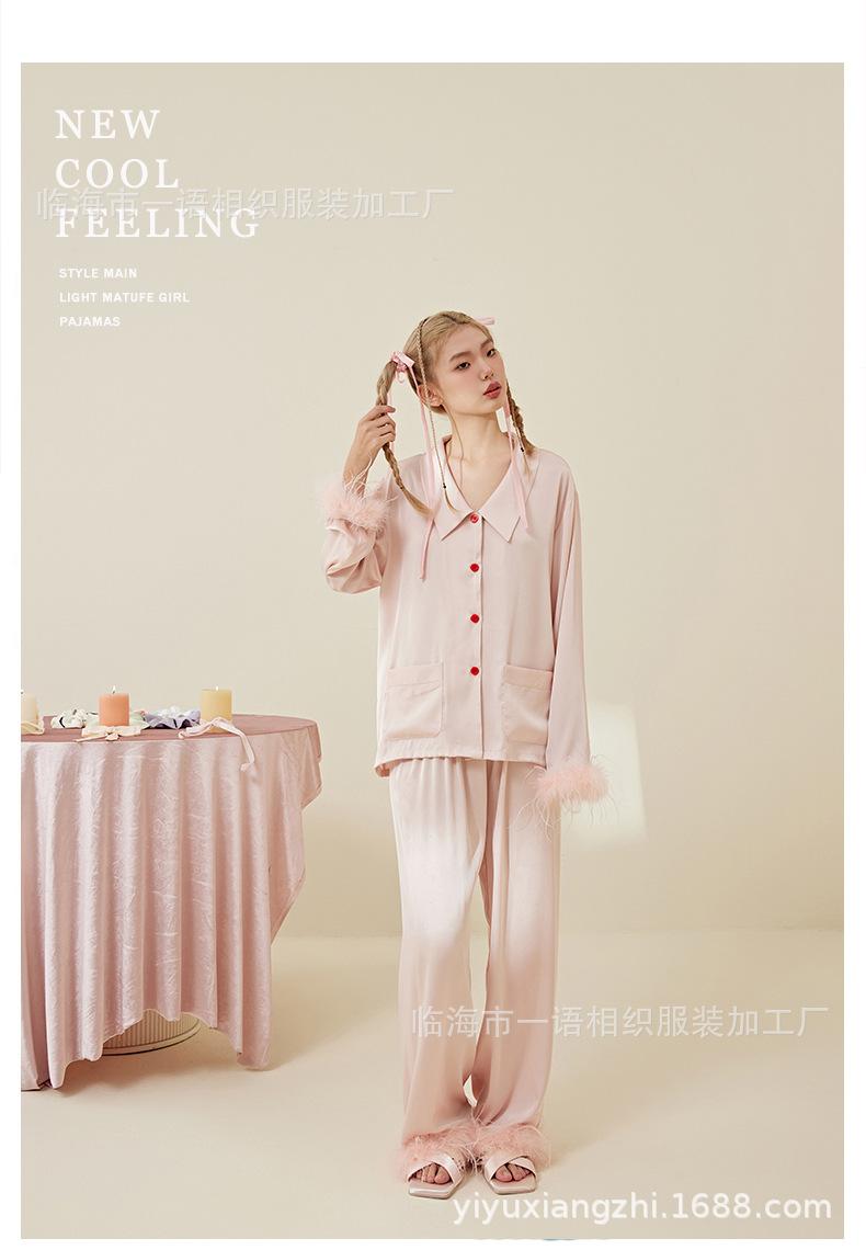 Primavera Nuevo Pijama de Seda Imitación Pluma Cuello Cuadrado para Mujer Estilo Hada Solapa Delgado Conjunto de Ropa para el Hogar para Mujer Venta al por Mayor