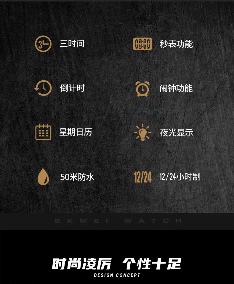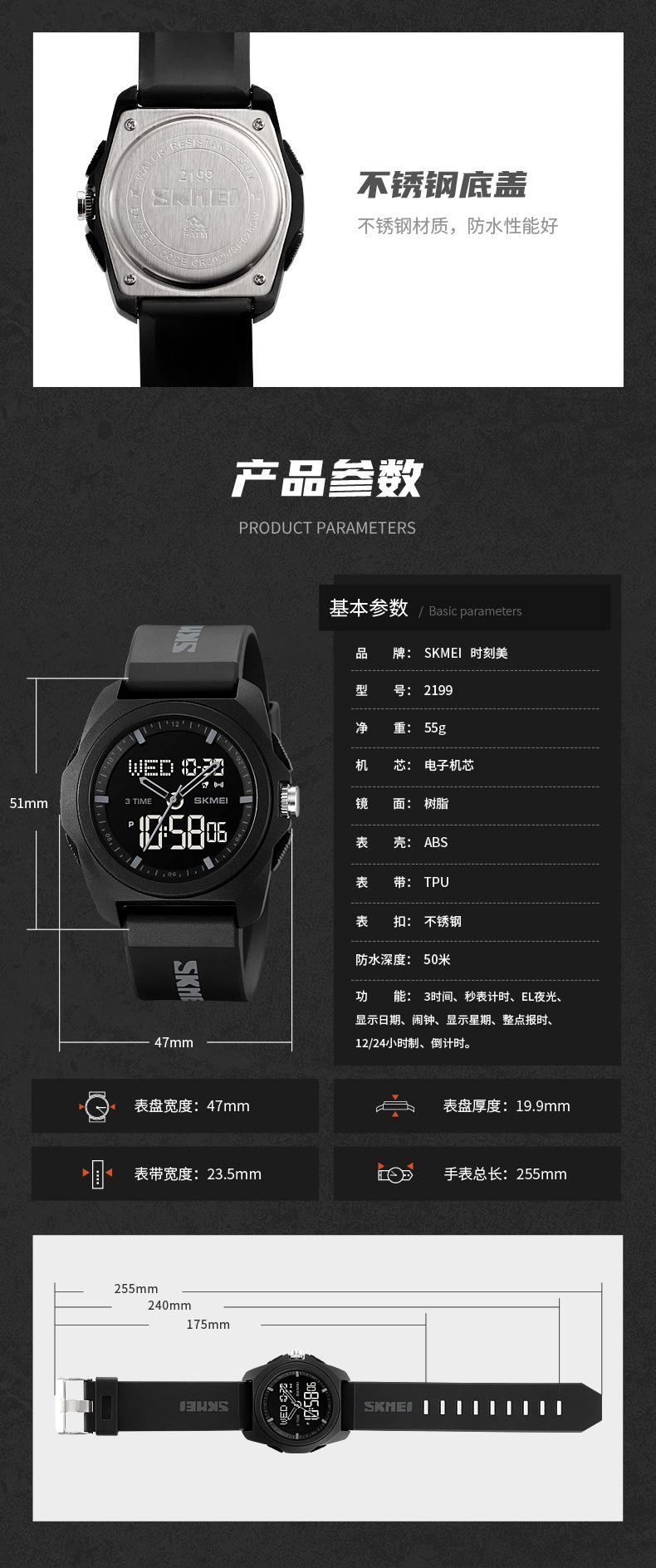 3 Time, stopwatch timing, date, timing noise, week, EL luminous, hourly time, 12/24 hour system, countdown.