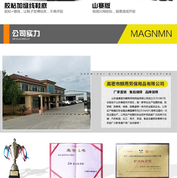 Shandong Gaomi Qiyan Labor Protection Products Co., Ltd. se estableció en julio de 2013, con su sede ubicada en la Zona de Desarrollo de la ciudad de Gaomi, provincia de Shandong. Es una empresa especializada en la producción y operación de una serie de zapatos de seguridad como anti-aplastamiento, anti-perforación, antiestáticos, aislantes y resistentes a altas temperaturas. Los zapatos de seguridad producidos y vendidos por la empresa son moldeados por inyección en una sola pieza por la máquina alemana DESMA de inyección directa de PU. Los productos de protección de seguridad producidos y operados por la empresa son ampliamente utilizados en industrias como maquinaria, fabricación de automóviles, química, electrónica, extracción de petróleo, alimentación e instalación de construcción. ¡Damos la bienvenida a clientes nuevos y antiguos a visitar la fábrica para negociaciones comerciales y orientación!