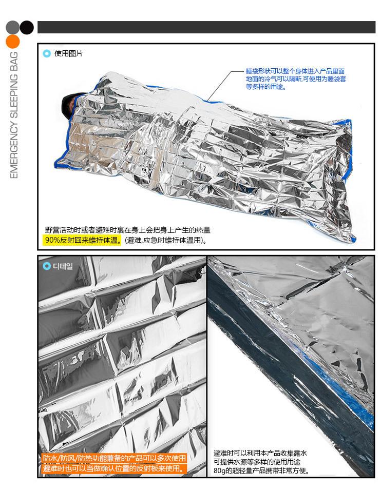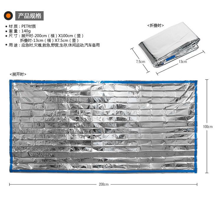 Silver orange 200*100cm, Silver blue 200*100cm, Drawstring pocket, Carabiner, Whistle