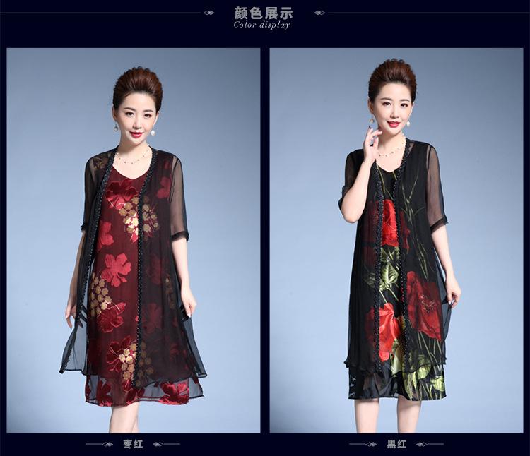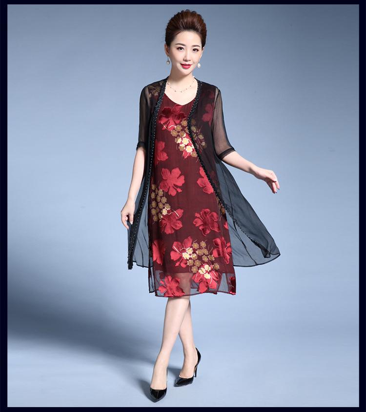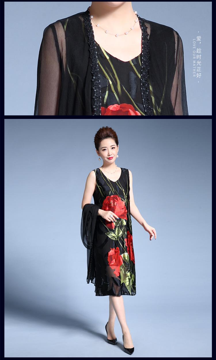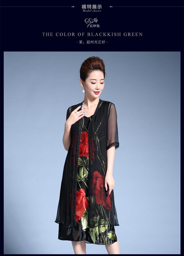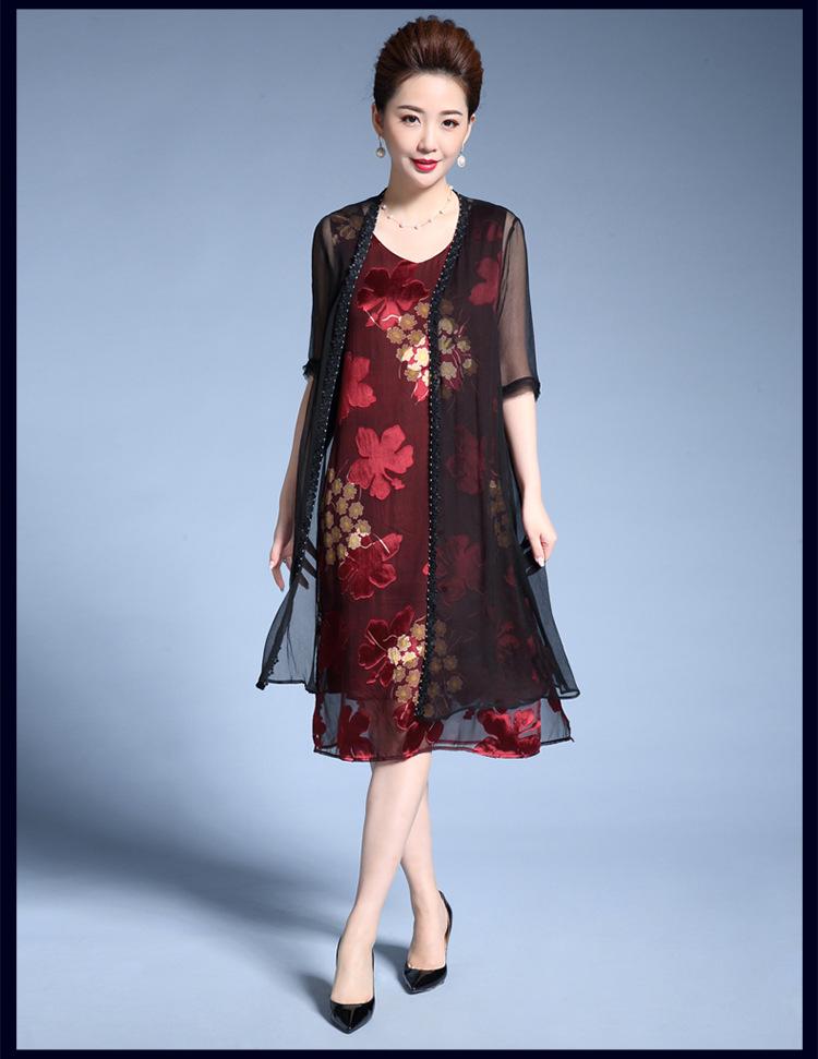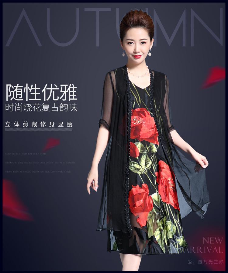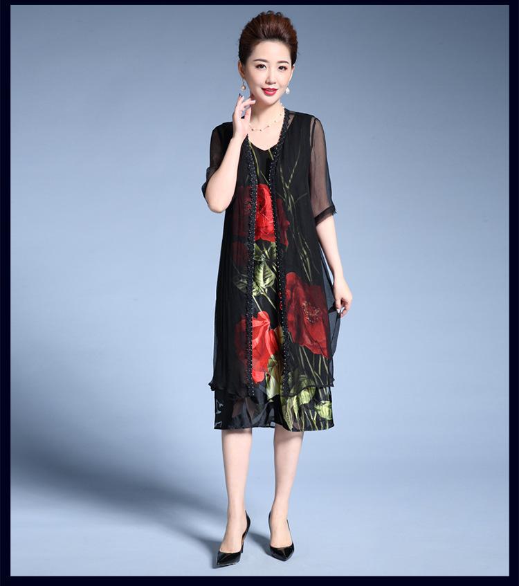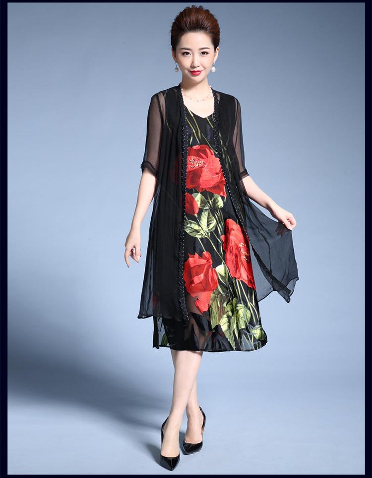 Vestido de Seda para Mujer de Talla Grande Moda Estampado Ajustado Adelgazante Seda de Morera Exterior Chal Vestido de Dos Piezas