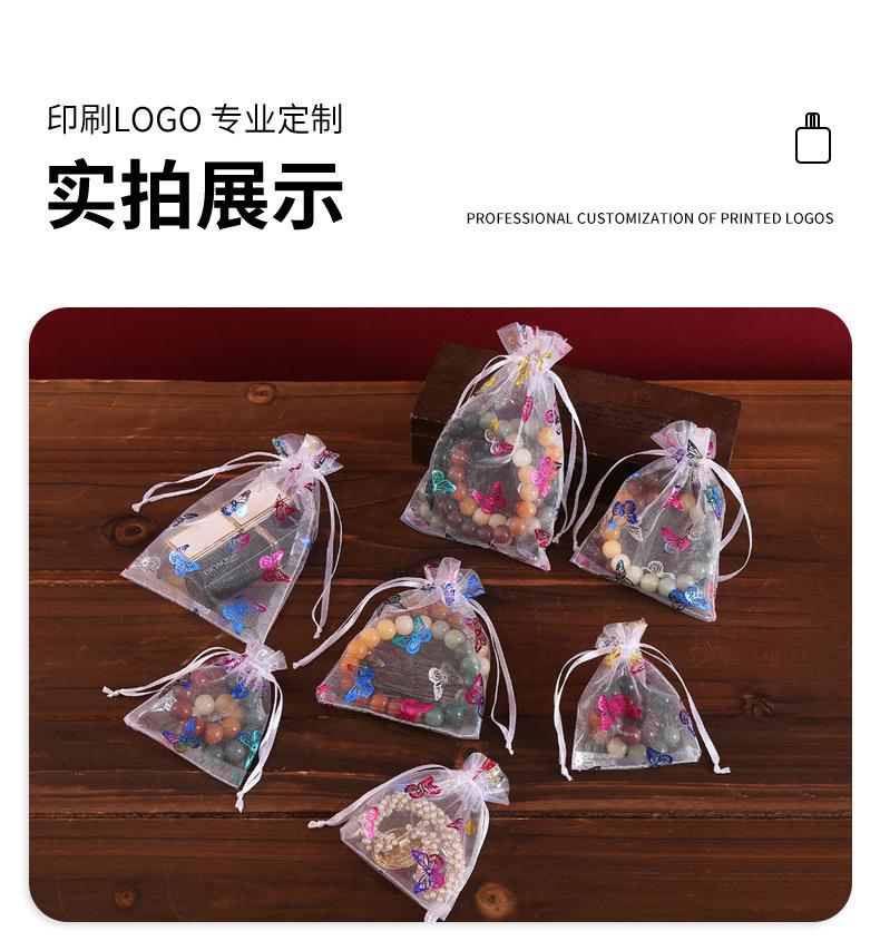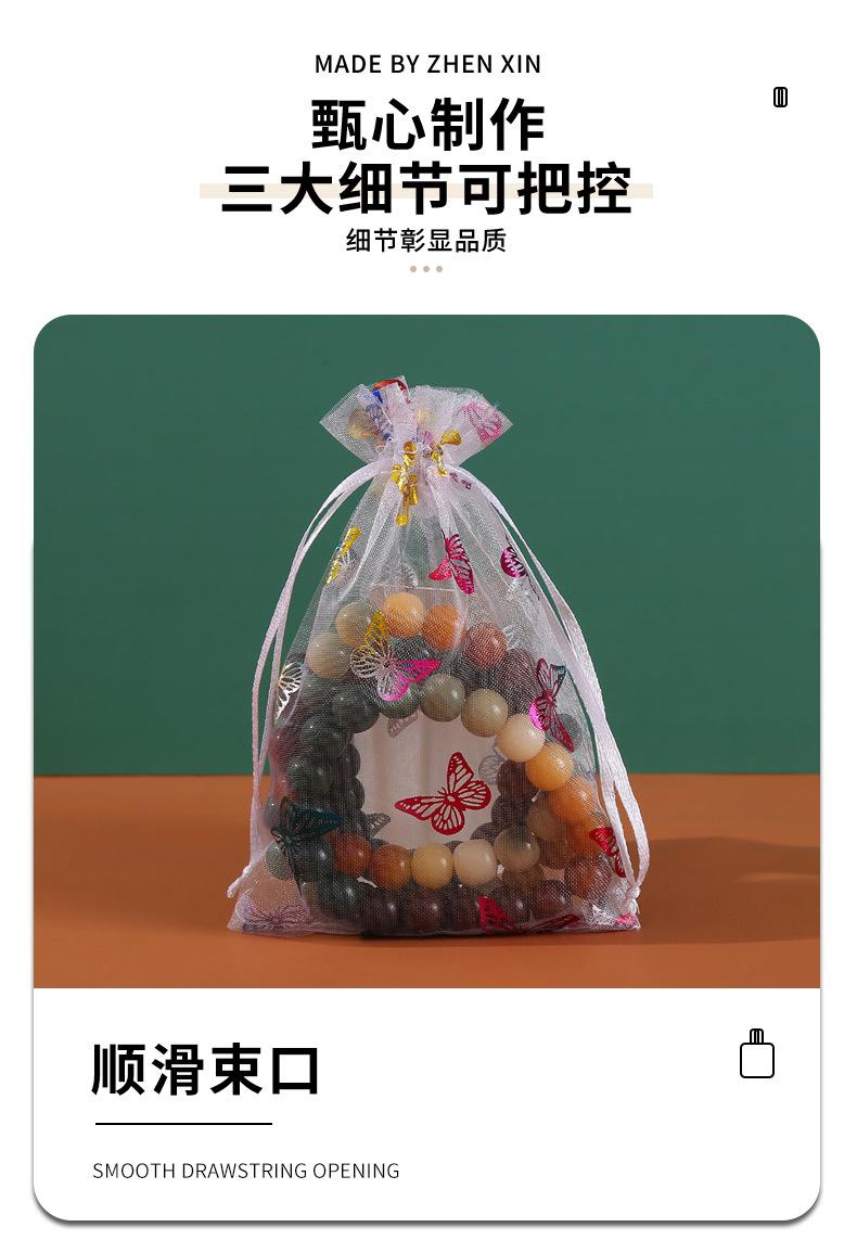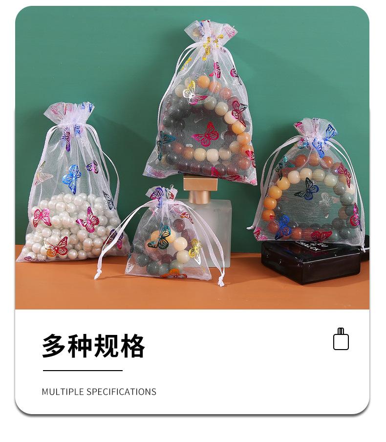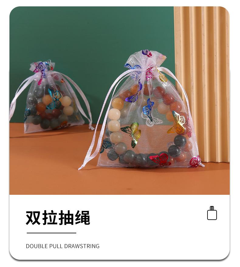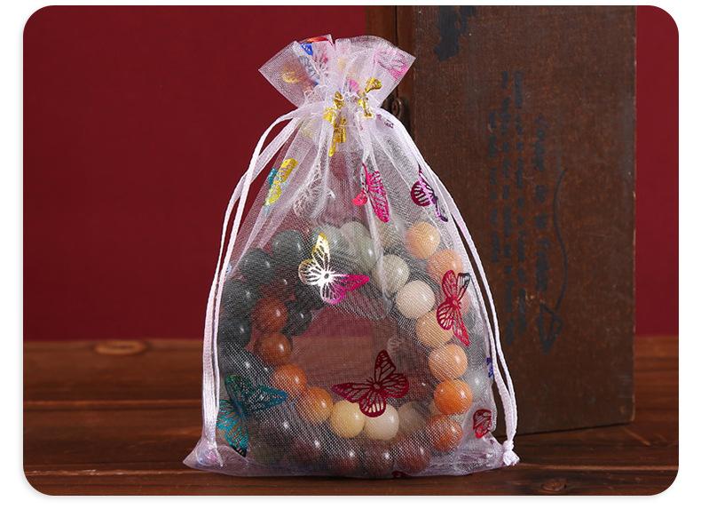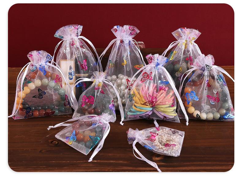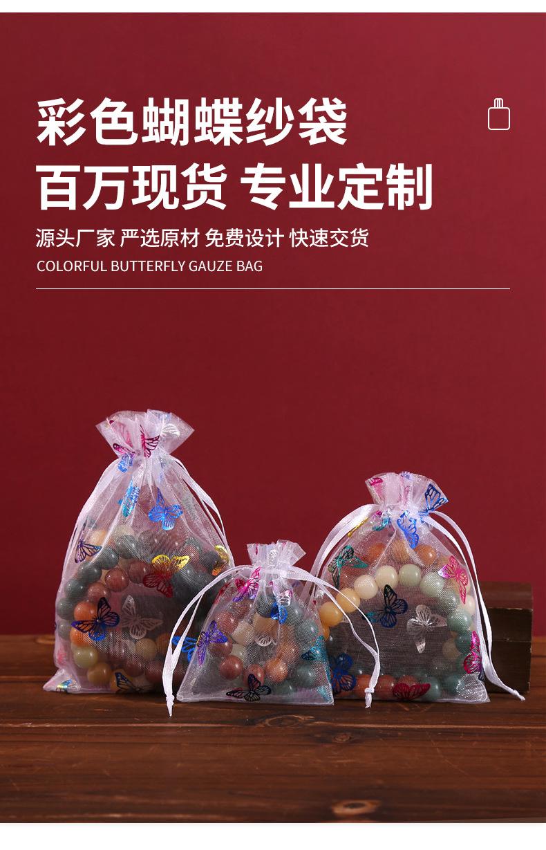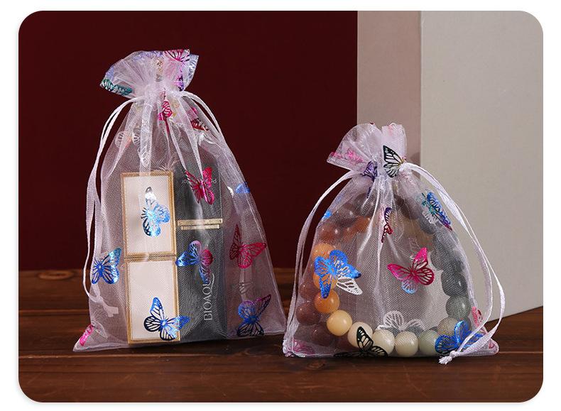 Bolsa de hilo de organza con patrón de mariposa dorada estampada en caliente de fábrica, embalaje para regalo de joyería, bolsa de hilo colorida