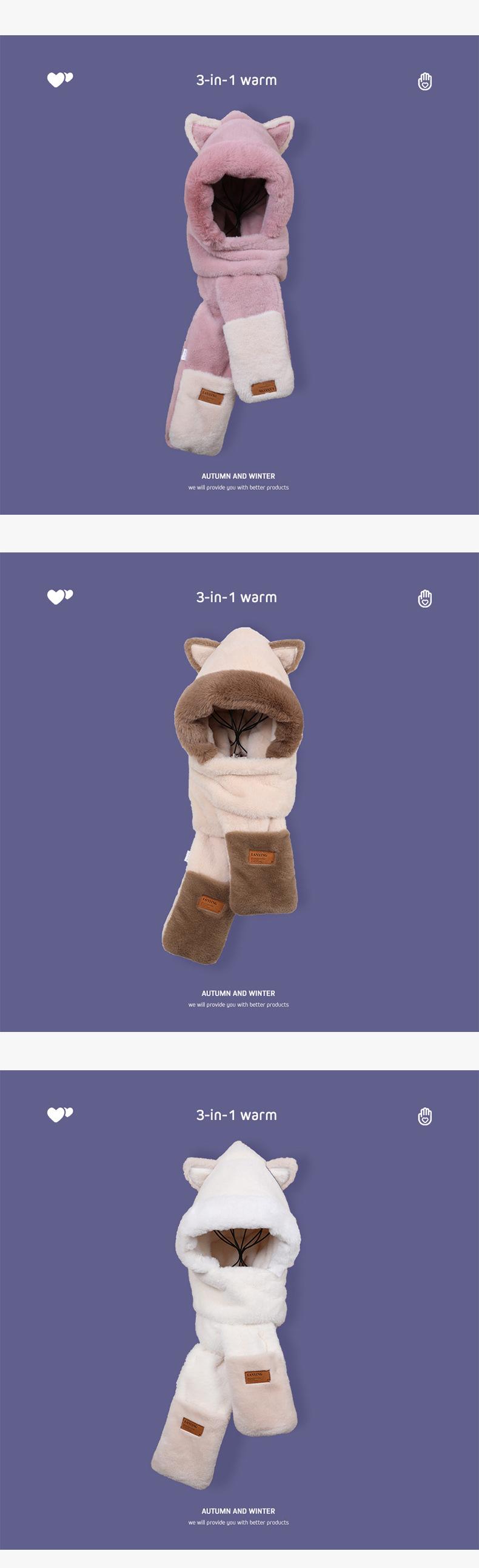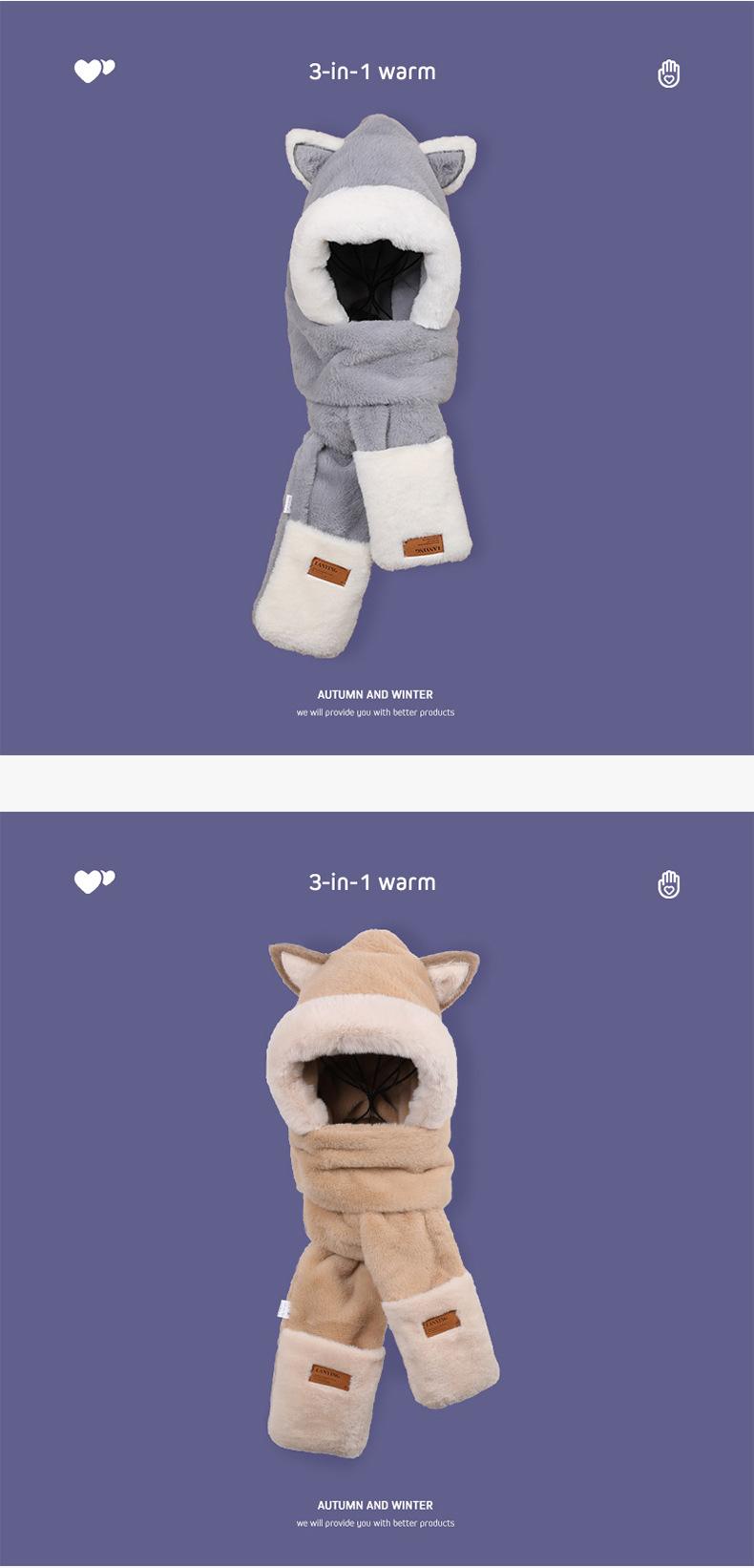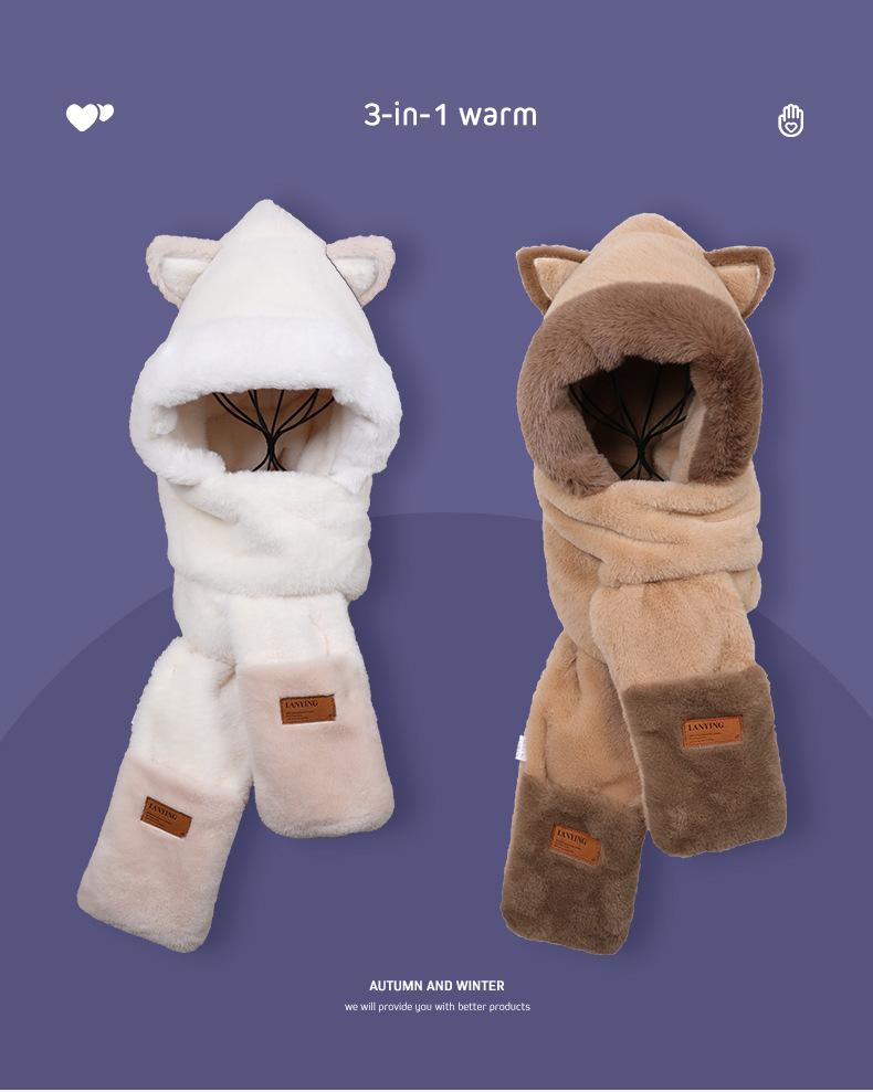 Gorro de invierno para mujer, bufanda con guantes integrados, bufanda con capucha de tres piezas, bonito gorro de felpa con estampado de zorro