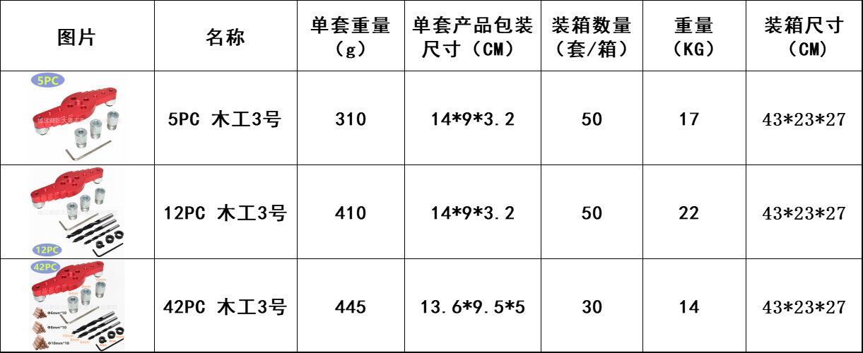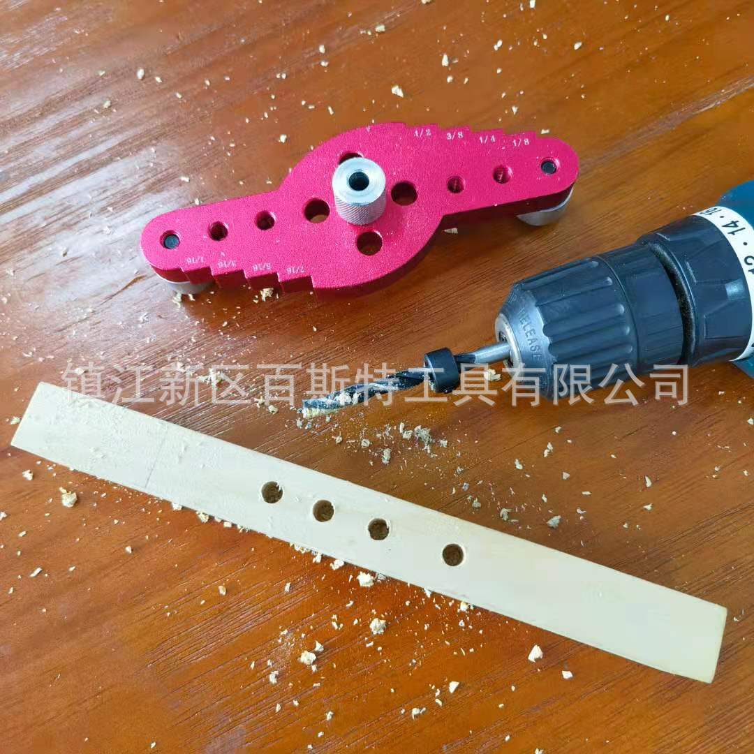 Juego: 42 piezas (un posicionador, guía de tuerca de 6 mm, 8 mm, 10 mm, broca helicoidal de tres puntas, un anillo limitador de broca, dos llaves L pequeñas, 10 espigas de madera de 6 mm, 8 mm, 10 mm cada una)
