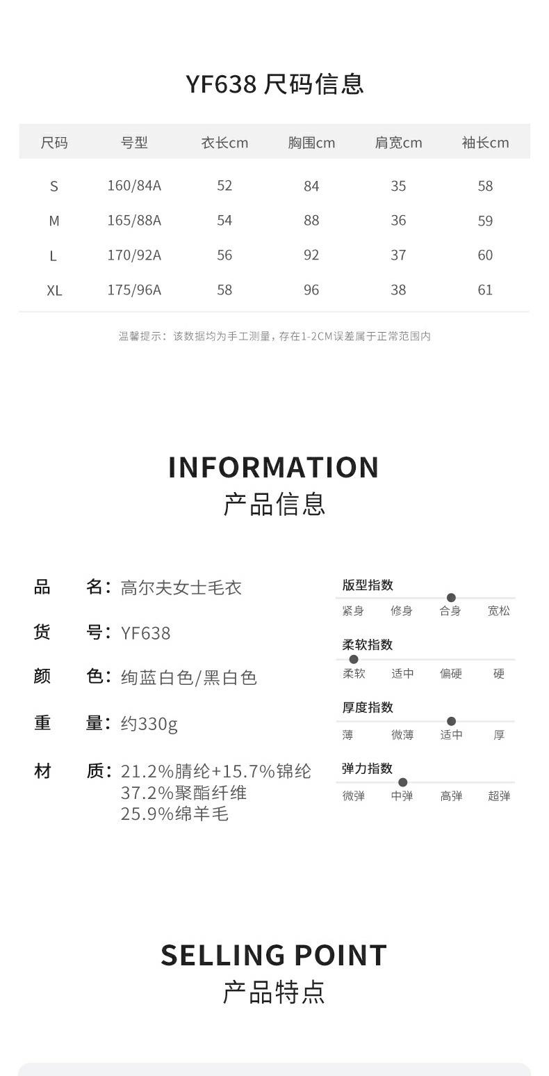 | nombre | Suéter de Golf para Mujer | Número de yardas | Tallas pequeñas, medianas y grandes. | |