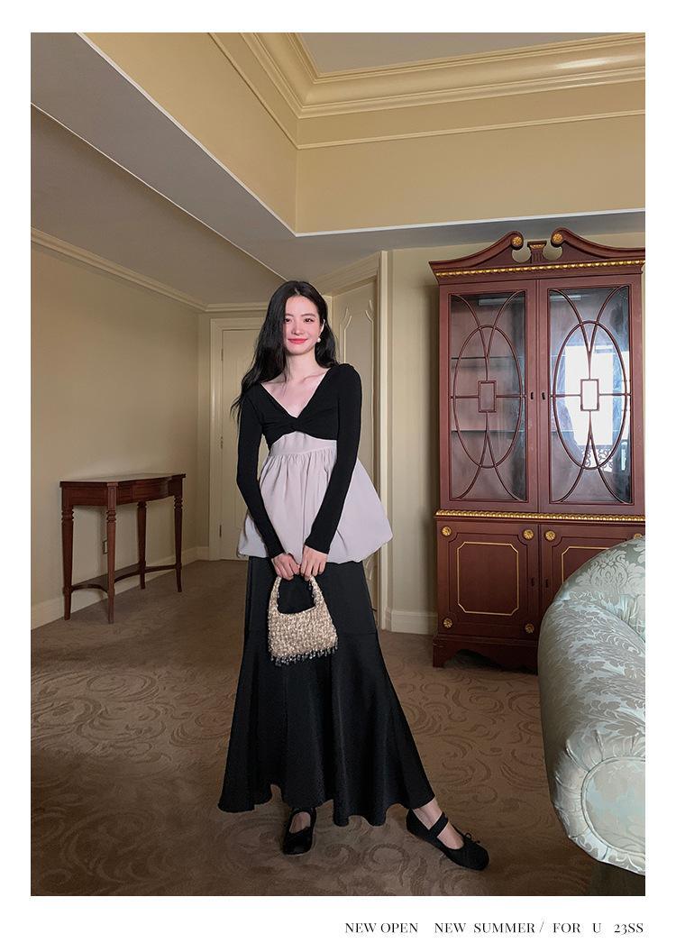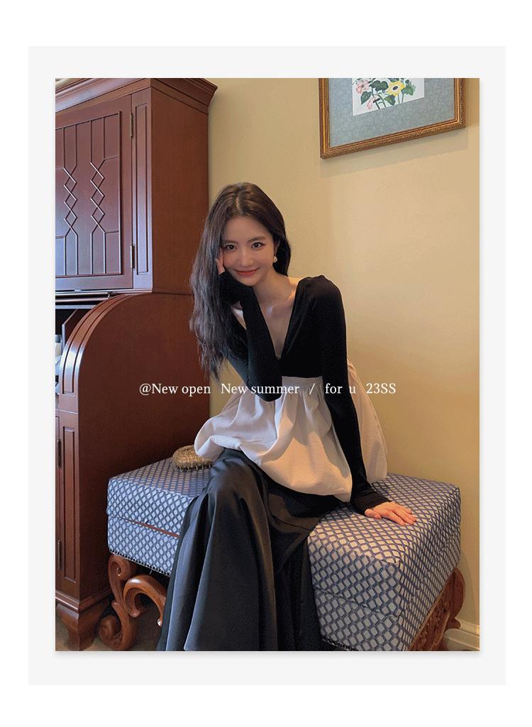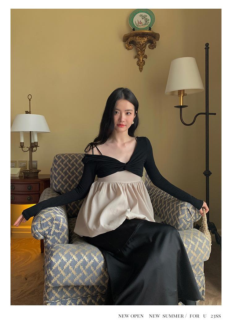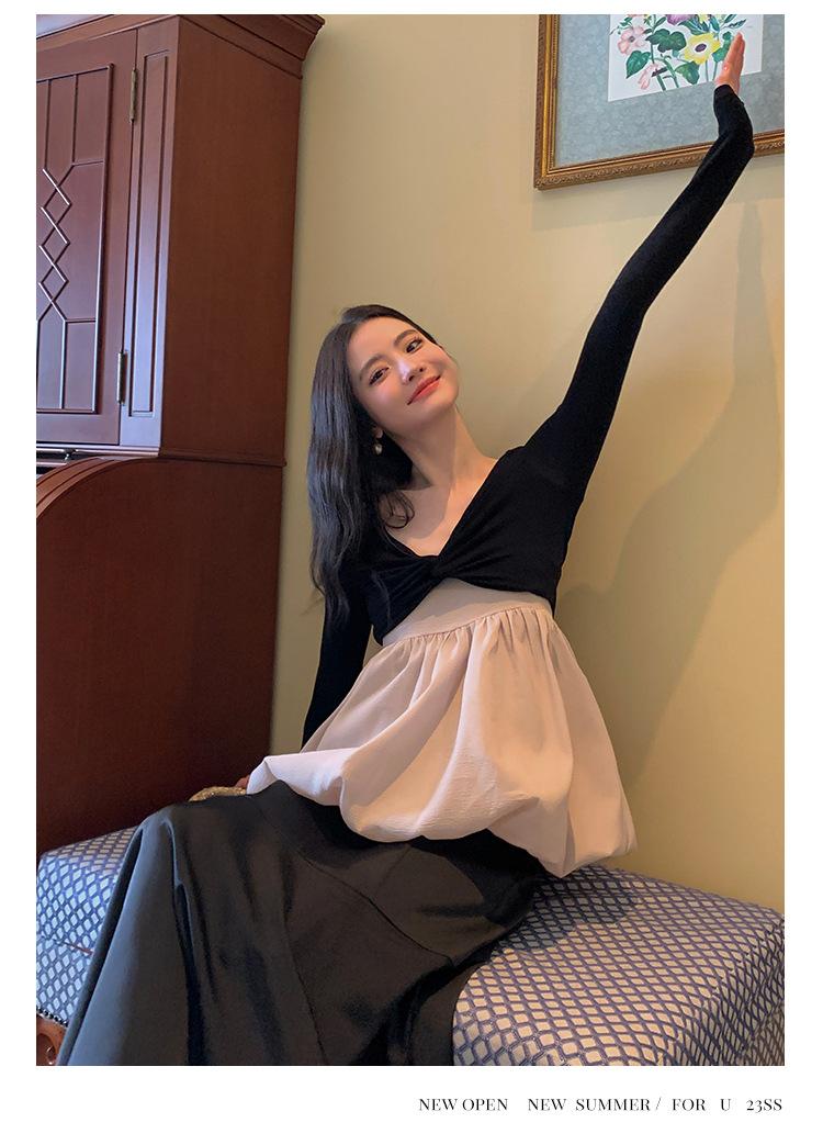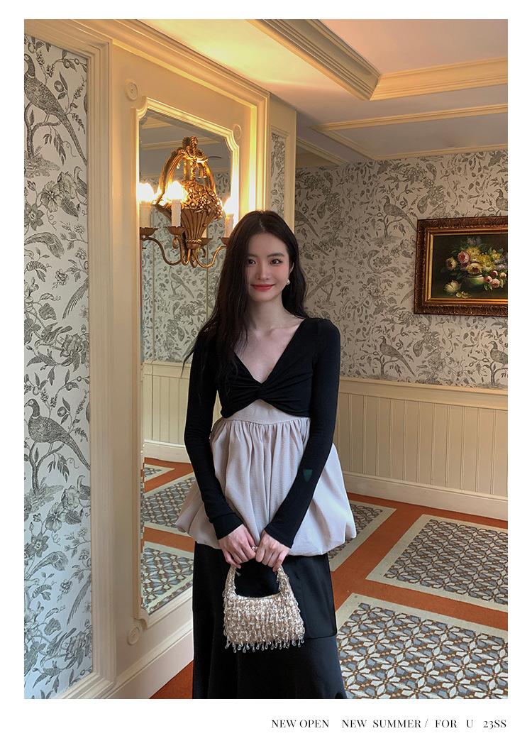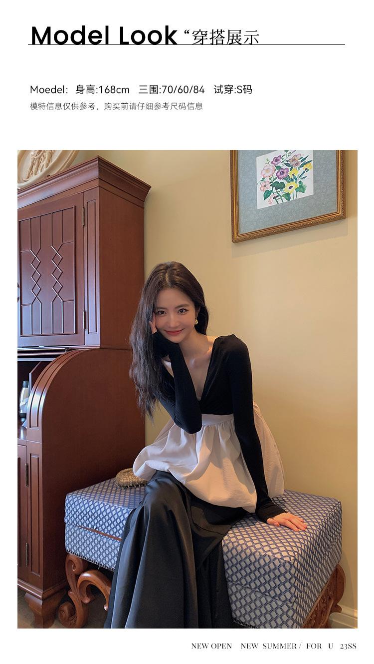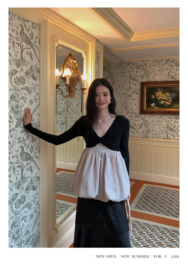 Liquidación Trece Líneas No Retornable Estilo Dulce y Picante Camisa Sexy Delgada con Escote en V Profundo para Mujer Verano 2023 Exterior Tejido de Manga Larga 82317