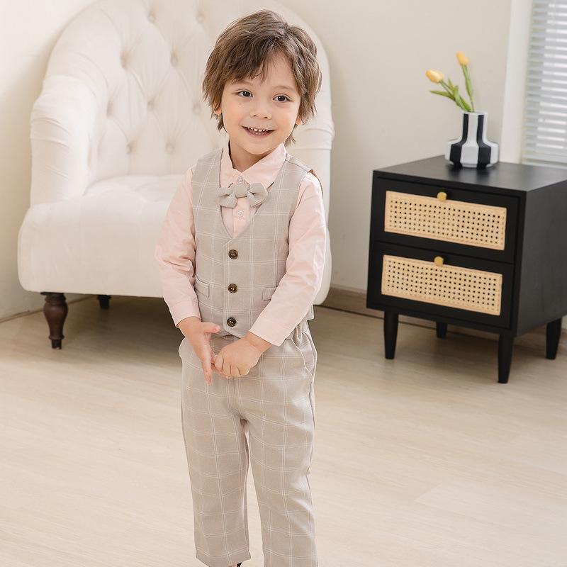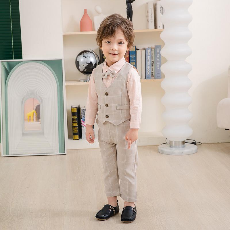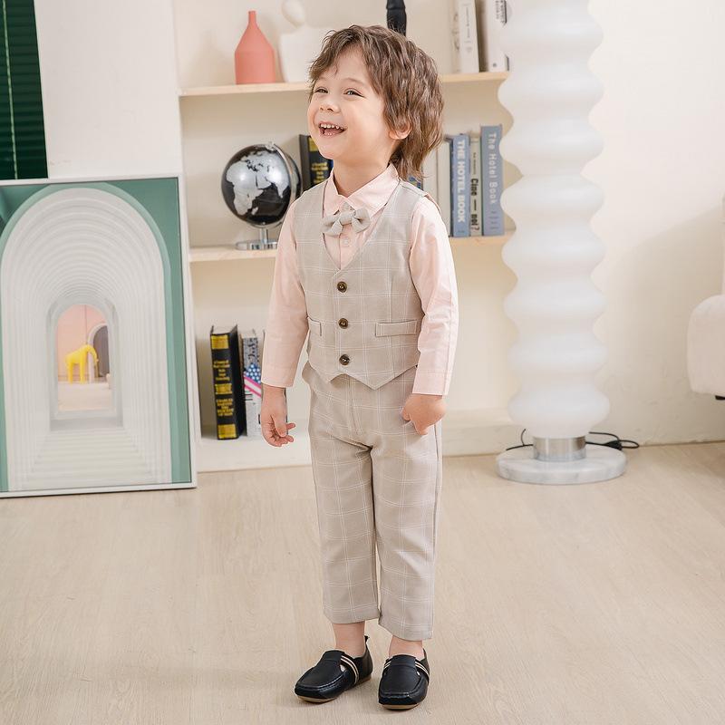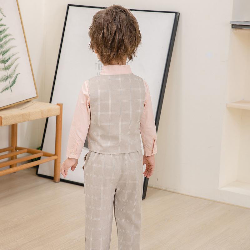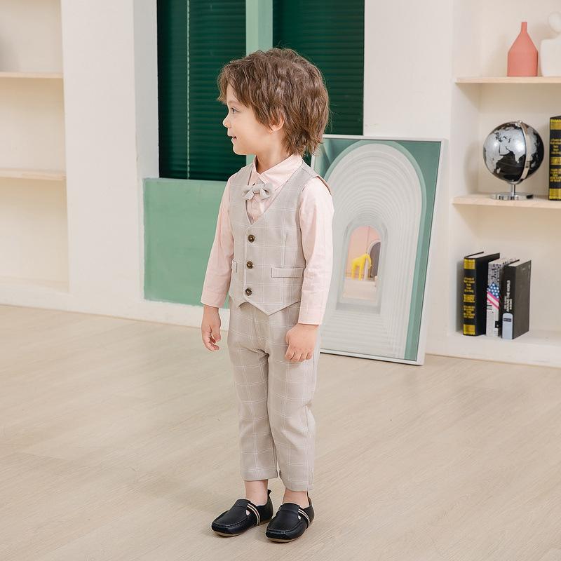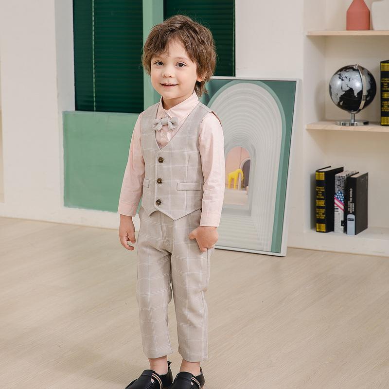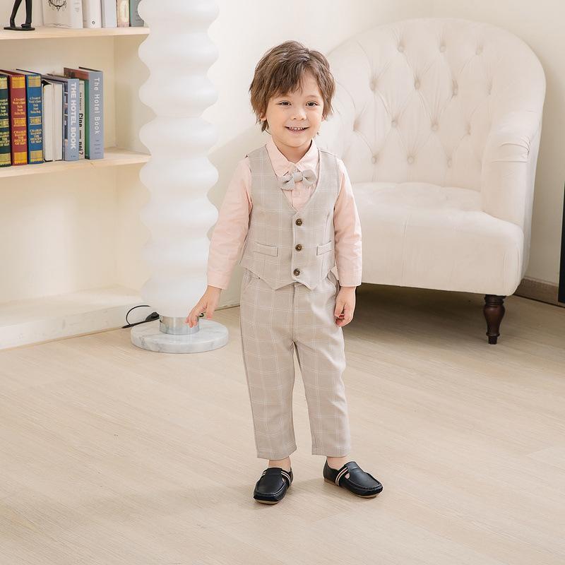 Traje pequeño de caballero para niño, primavera y otoño, moda británica, para niños, a cuadros, para fiesta de boda, traje nuevo de cuatro piezas