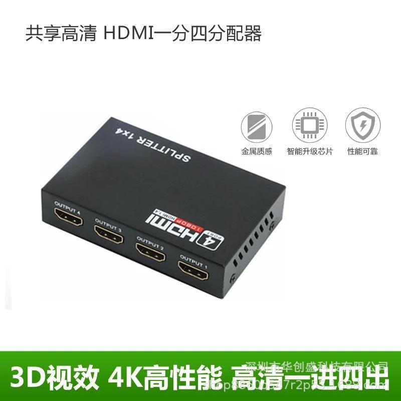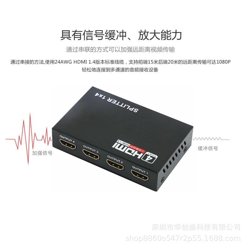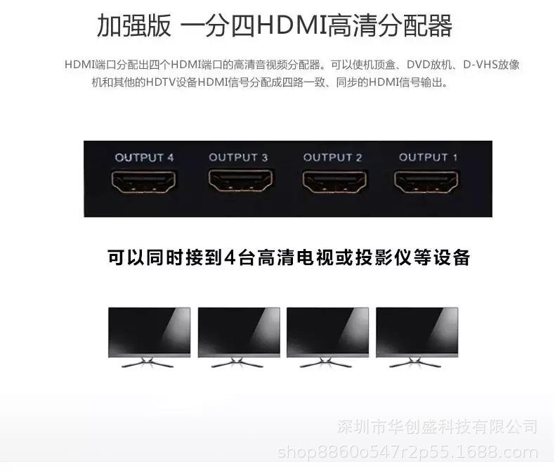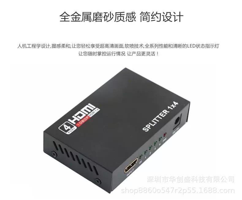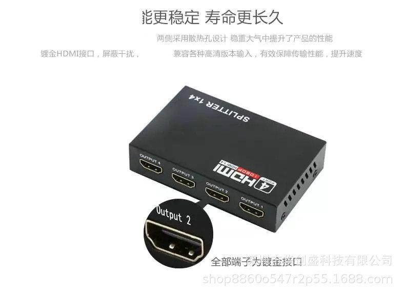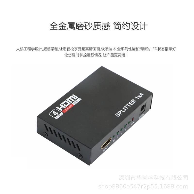 El divisor HDMI de uno a cuatro salidas distribuye señales HDMI de decodificadores, reproductores de DVD, reproductores D-VHS y otros equipos de HDTV a cuatro salidas de señal HDMI consistentes y sincronizadas. Los usuarios pueden conectar la señal a proyectores de alta definición, DLP, televisores LCD de alta definición y otros dispositivos para visualización simultánea.