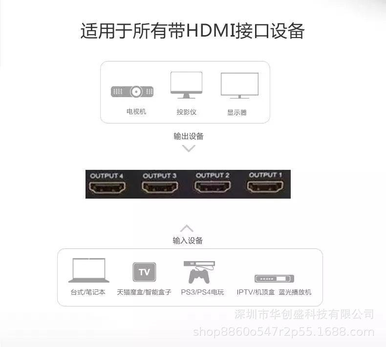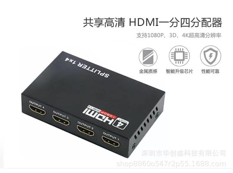 2. El divisor HDMI puede usar un cable HDMI (que se compra por separado) para conectar la fuente de señal HDMI a la entrada del divisor. El extremo de salida tiene 4 salidas HDMI.
