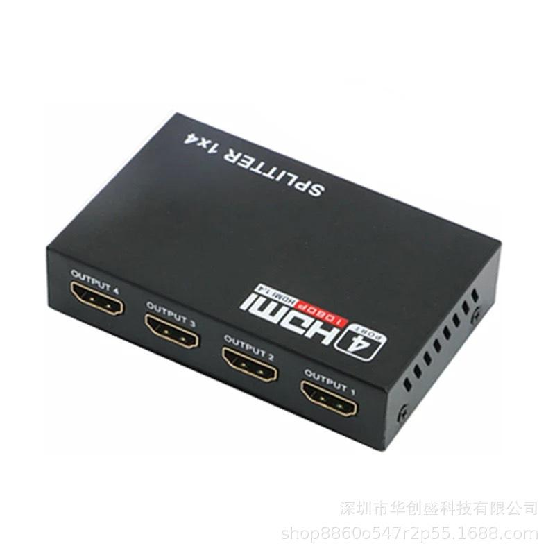 El divisor HDMI de uno a cuatro permite que la fuente de señal de un puerto de entrada HDMI distribuya cuatro señales de sincronización a cuatro puertos HDMI para emitir el mismo audio y video de alta definición.