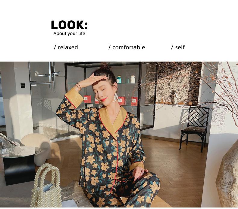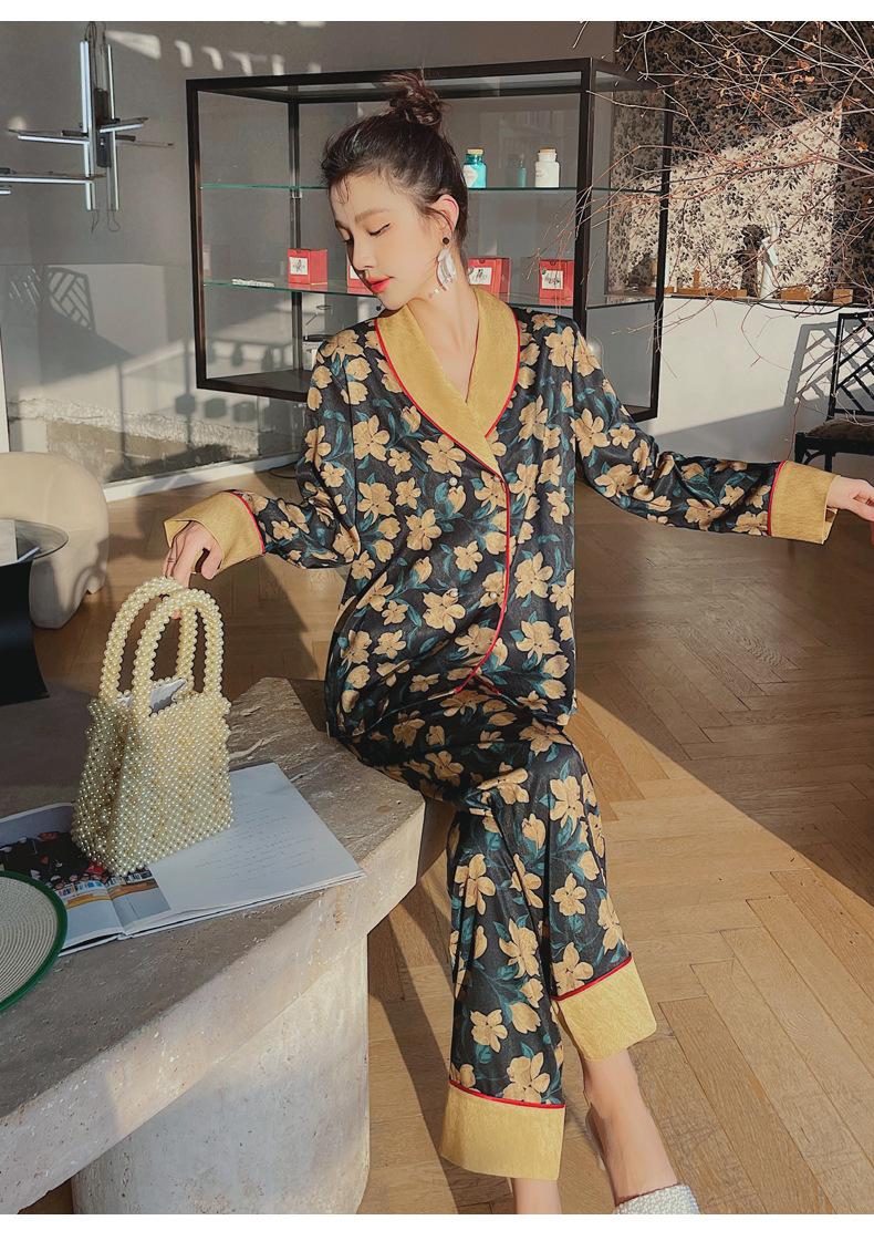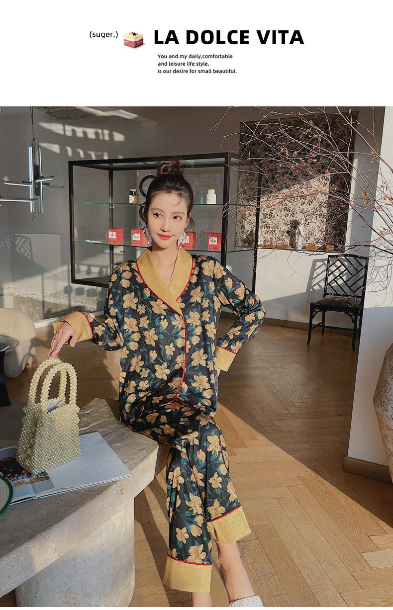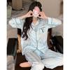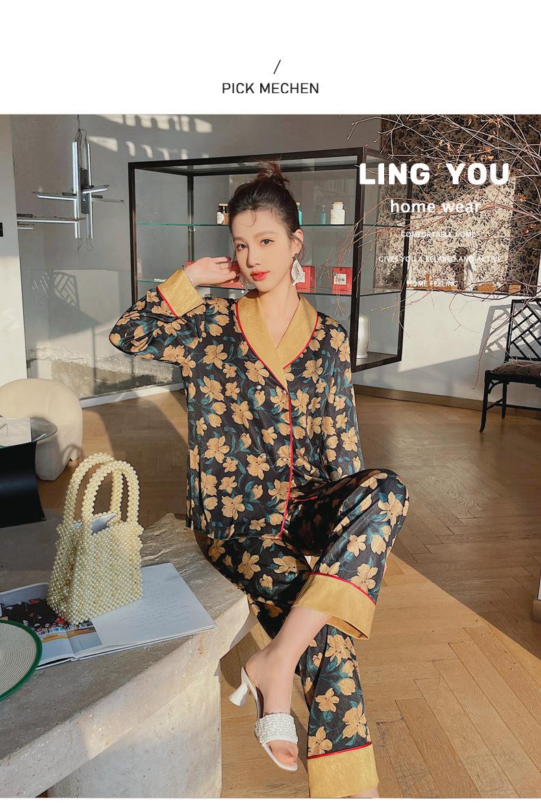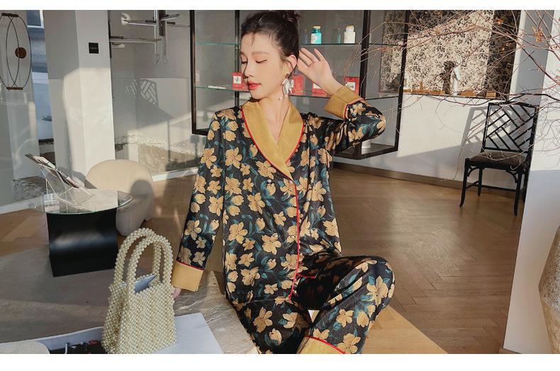 Pijamas de mujer de primavera y verano al por mayor de seda sintética de manga larga, cuello grande y fino con solapa, conjunto de ropa de casa de seda de moda para mujer