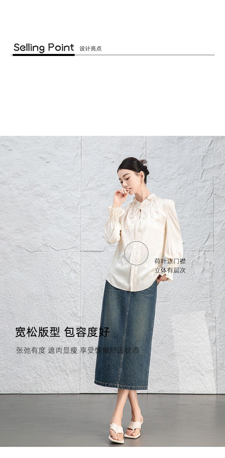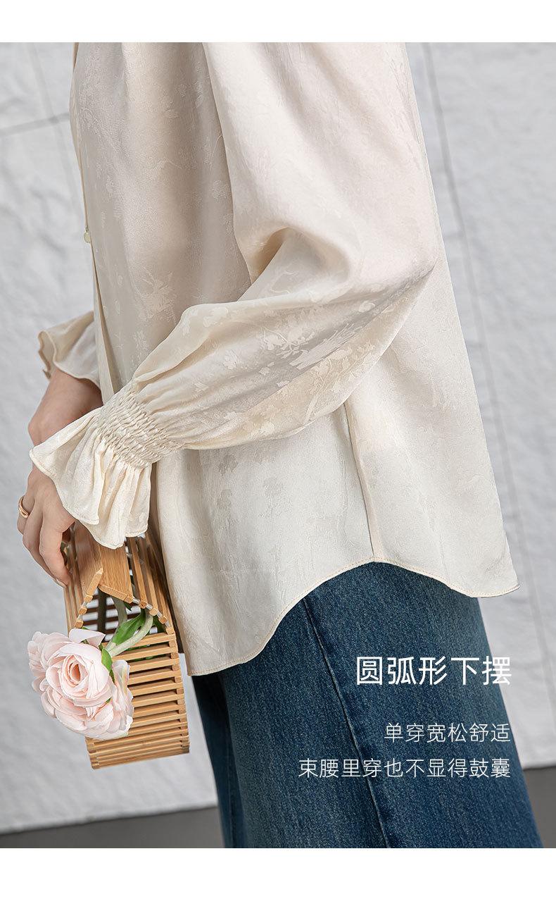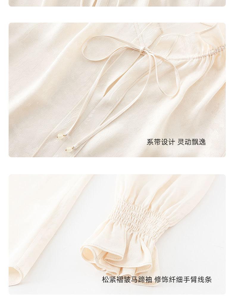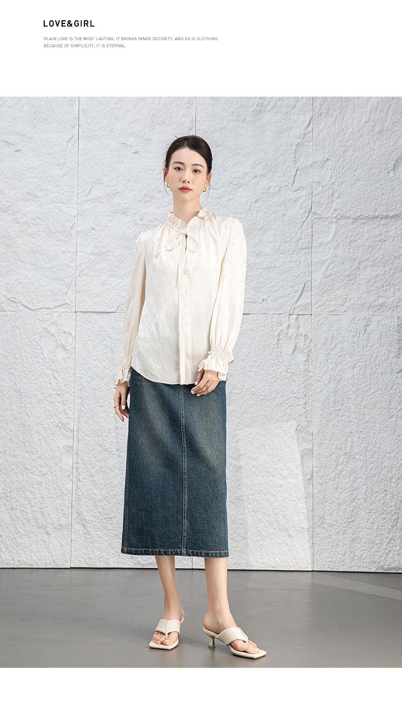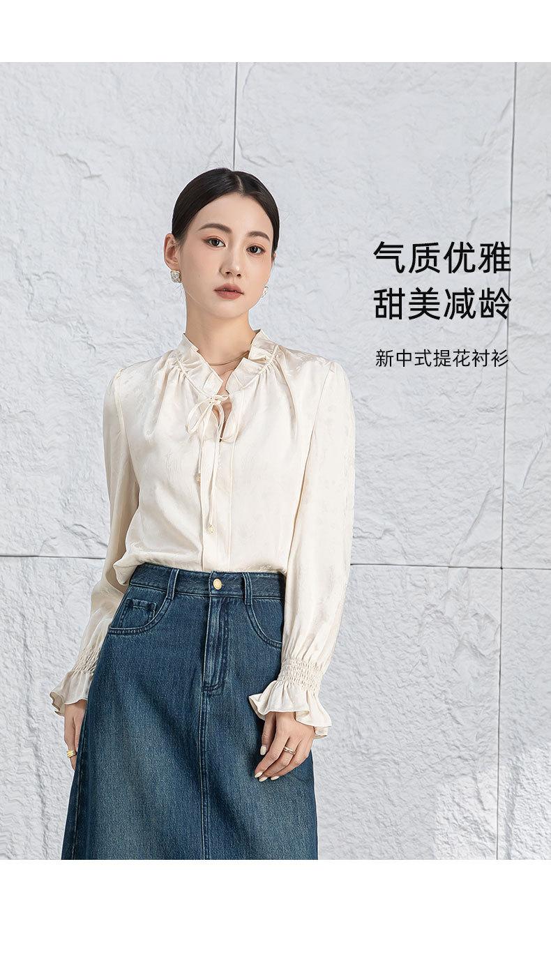 Camisa Xingge de Encaje con Cordones Estilo Corte Francés de Manga Larga, Nuevo Top de Acetato Adelgazante con Cuello en V Jacquard Vintage