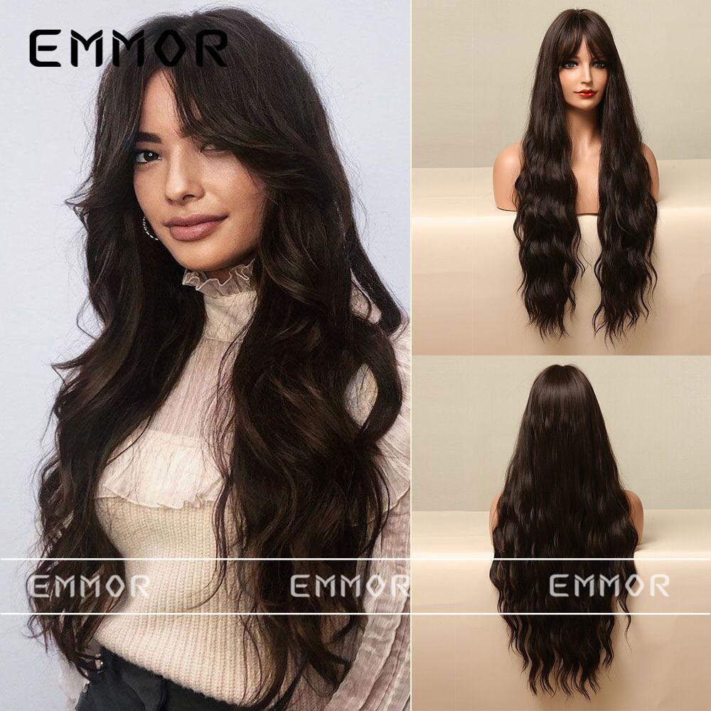 Compra Peluca europea y americana para mujer, flequillo negro castaño, cabello largo y rizado, en stock, peluca de seda de alta temperatura, cosplay, tocado al por mayor en Joom.pro