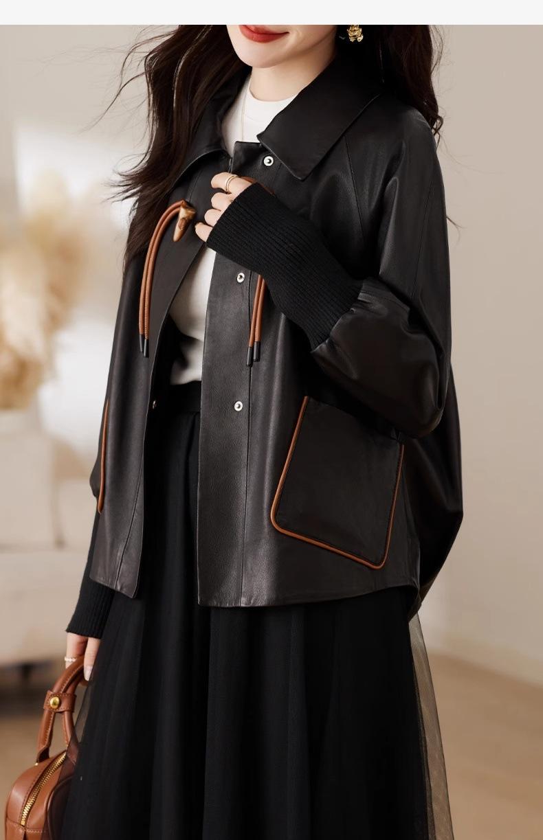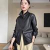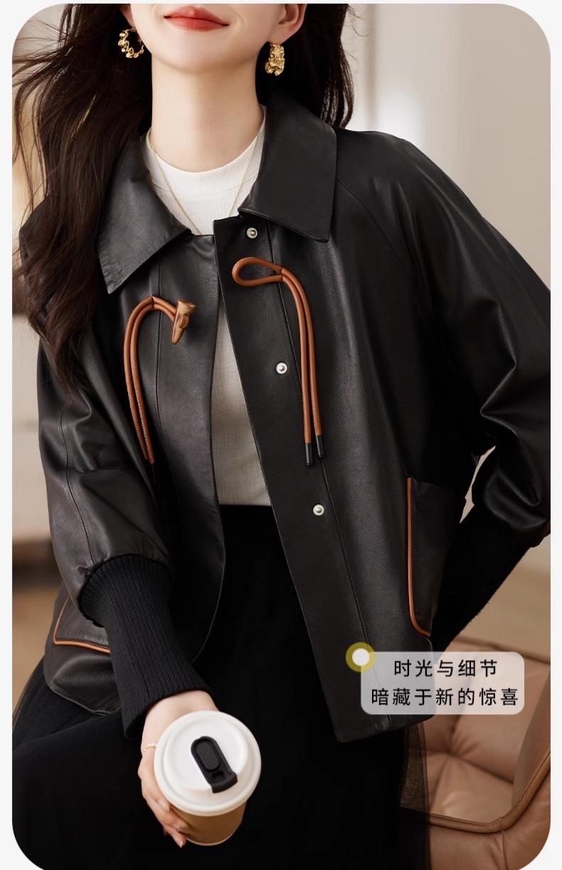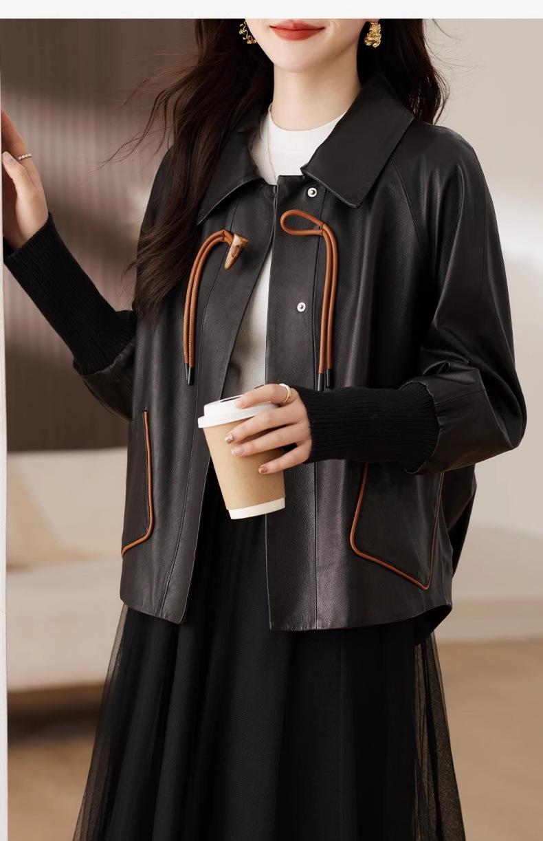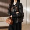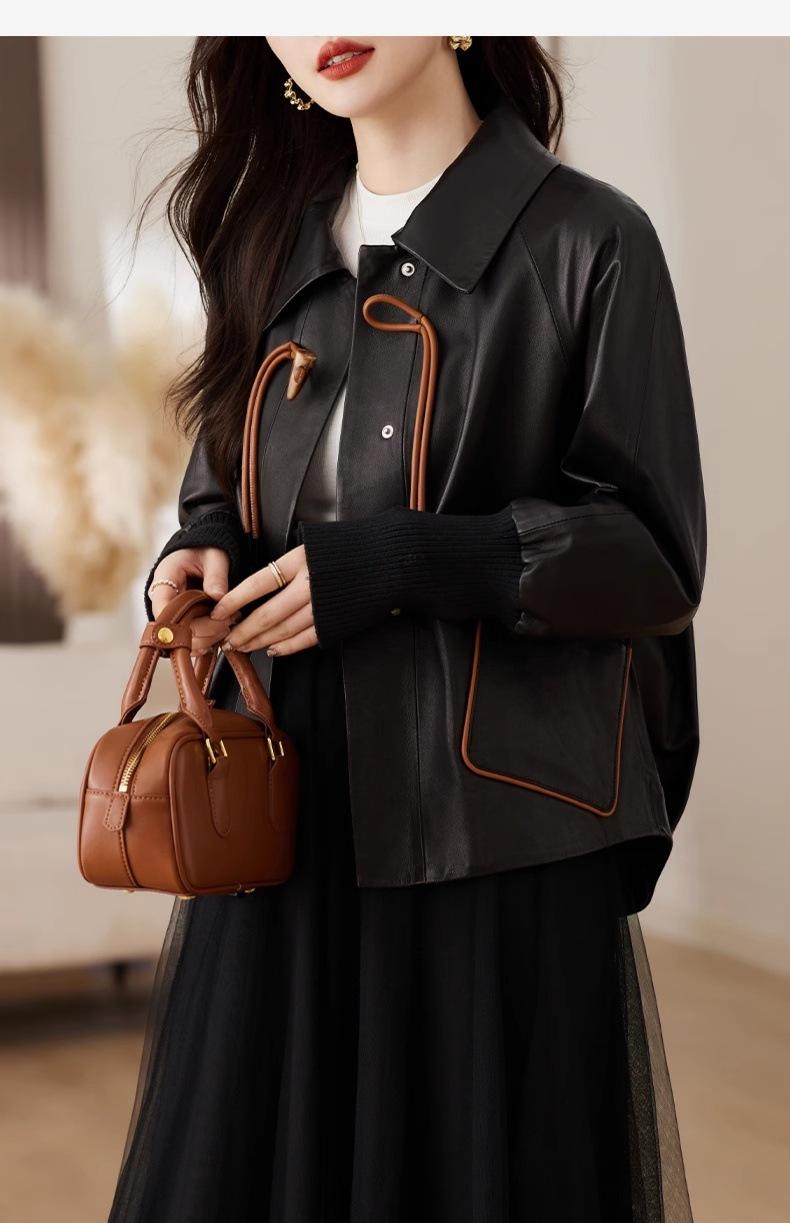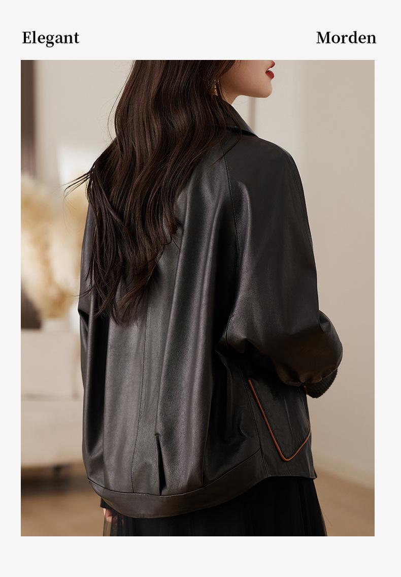 2025 Primavera y Otoño Nueva Chaqueta de Cuero Genuino Estilo Nacional para Mujer Chaqueta Holgada de Piel de Oveja Chaqueta Negra Corta con Solapa a la Moda