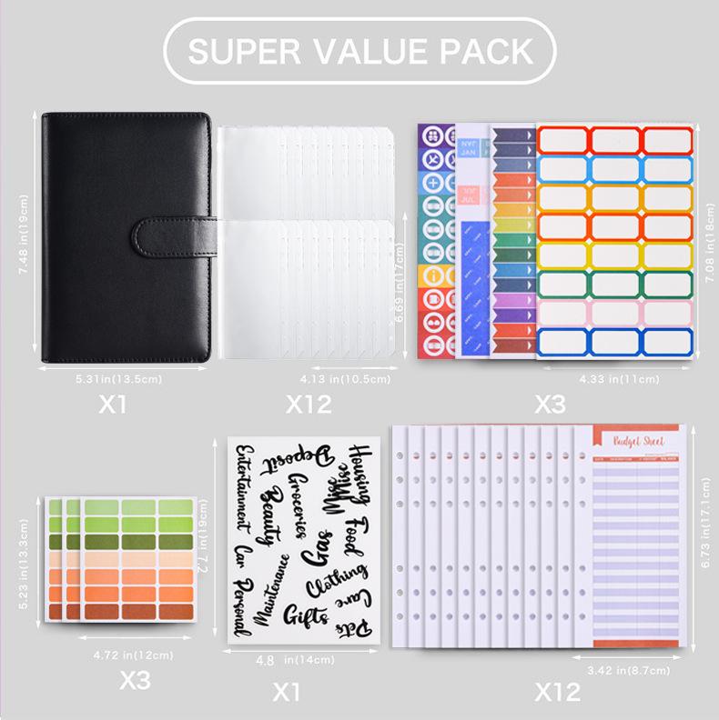 [Deluxe Gift Pack-Black] (Budget Card 12 + Zipper Bag 8 + Word Sticker 2 + Multifunctional Sticker 3 + Caliper 1 + Color Label Paper 2+2)