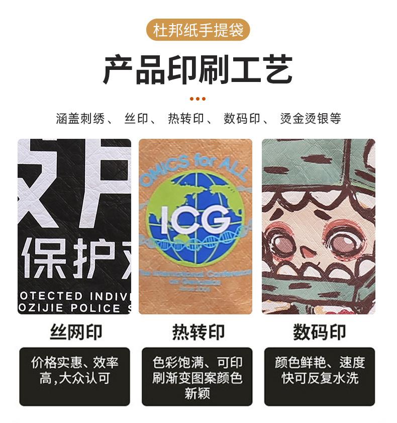Piel de vaca lavable práctica fuerte desgarro no podrido compras publicidad logotipo impreso personalizado bolsa de papel DuPont bolsa de mensajero hecha a medida