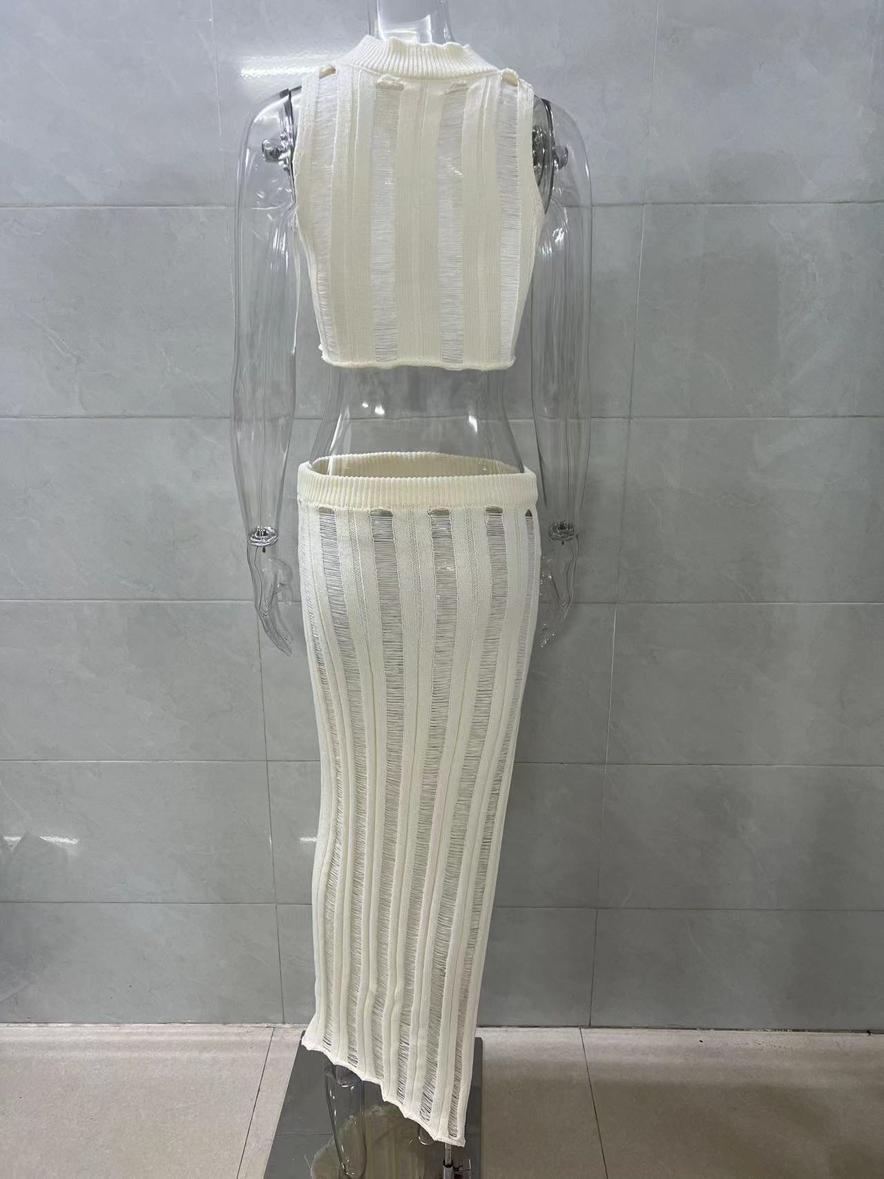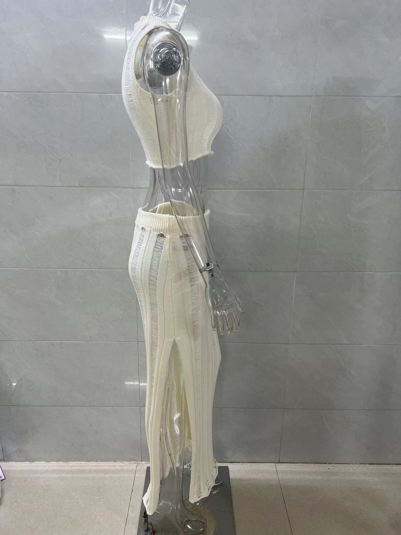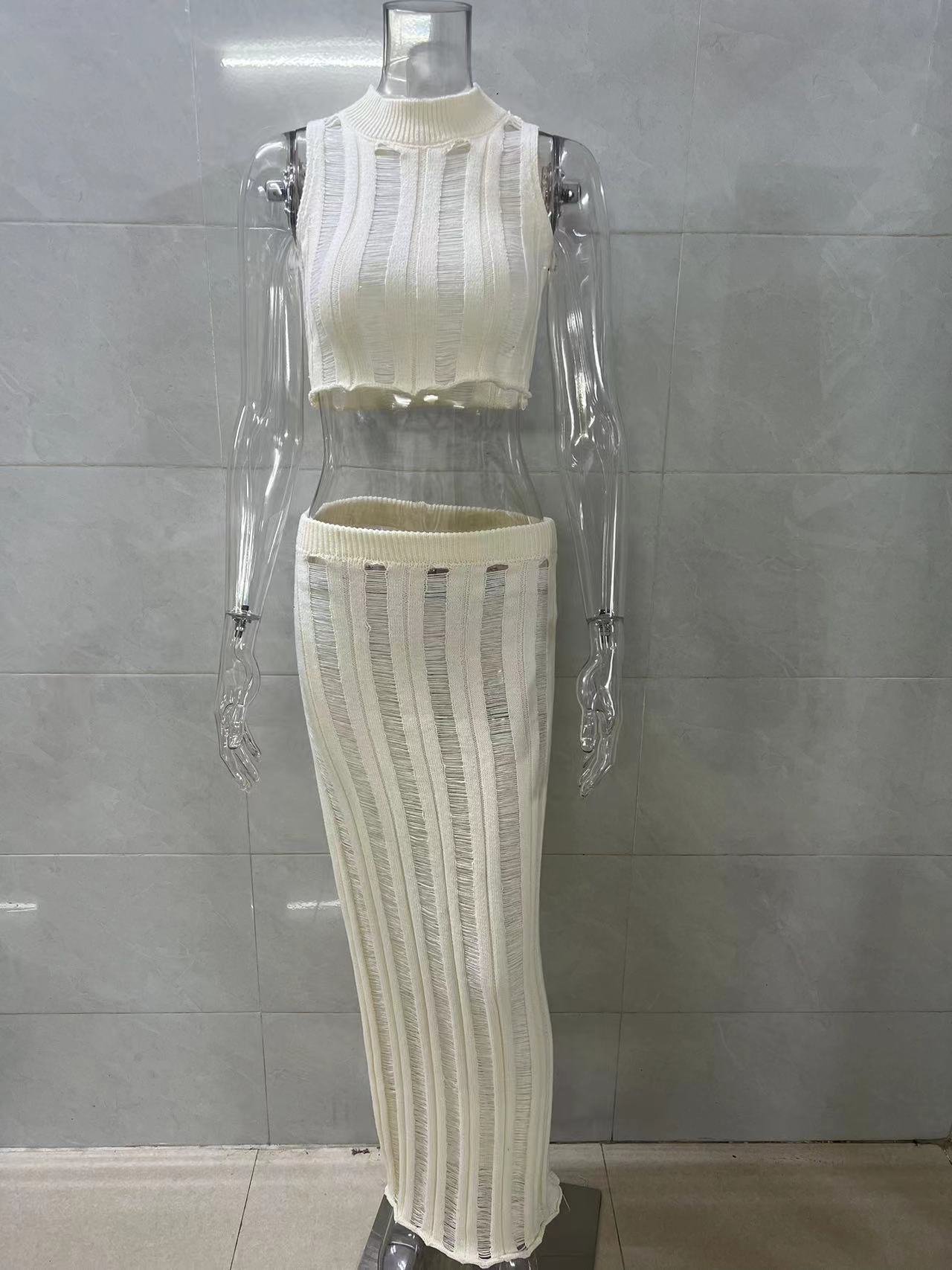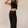 Traje de chica sexy transfronterizo europeo y americano con perspectiva hueca, top de tubo con falda de media longitud envuelta en la cadera, traje de dos piezas de falda larga para mujer