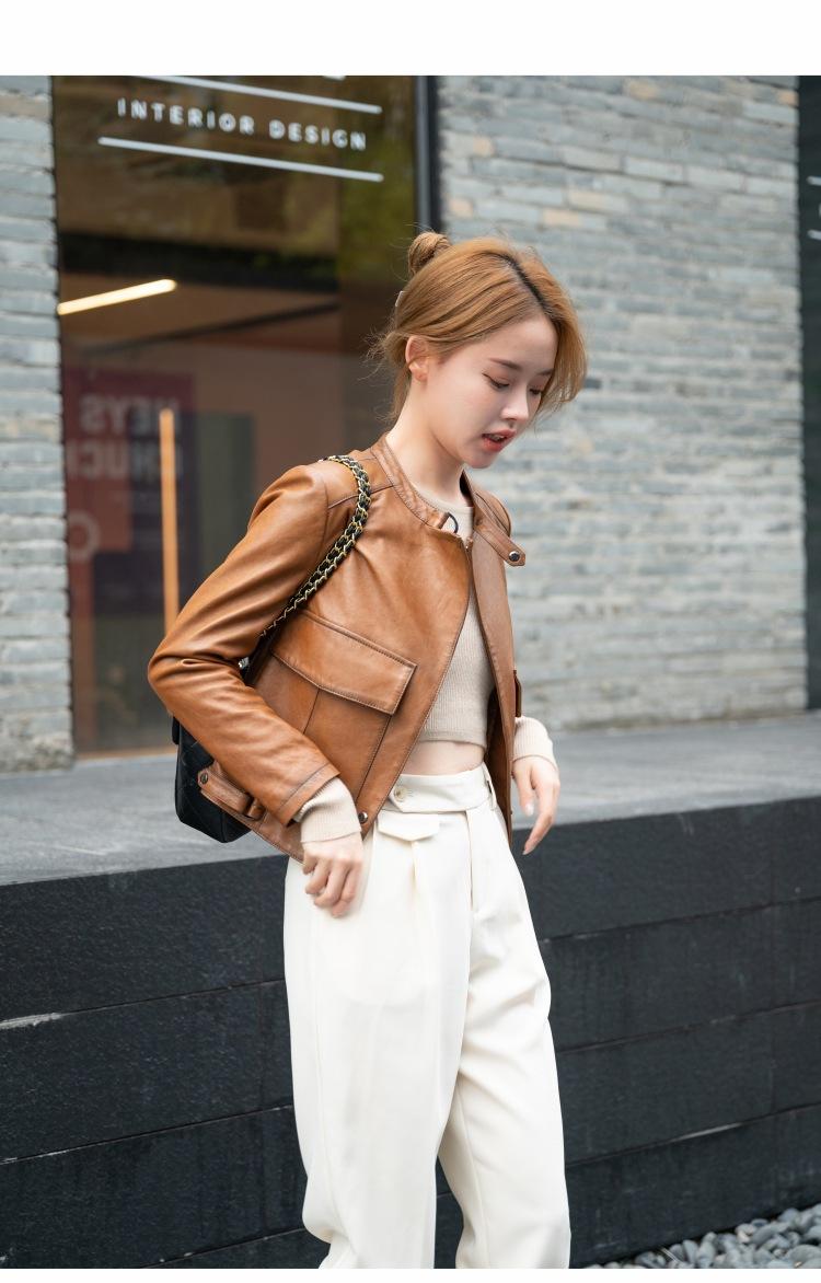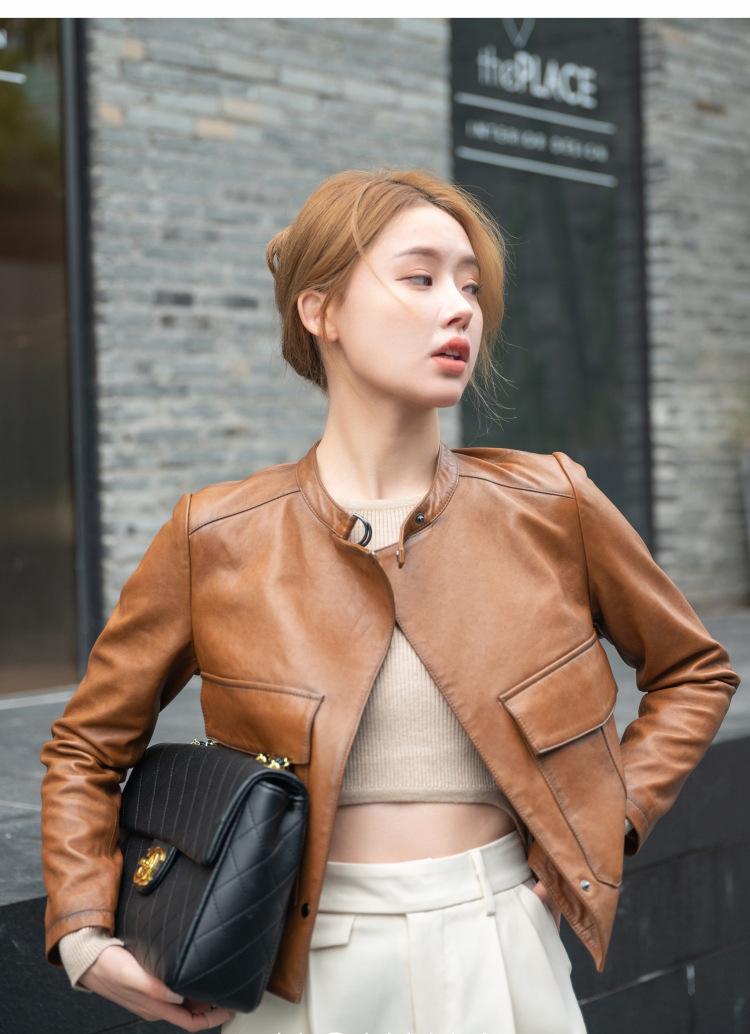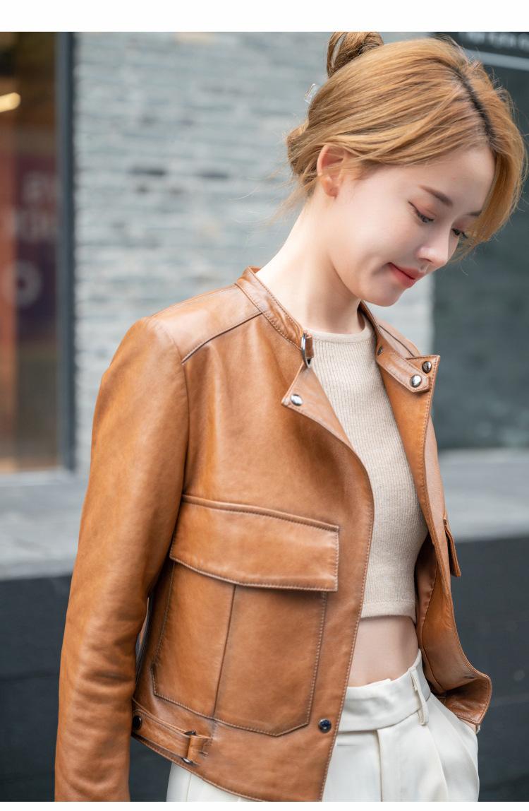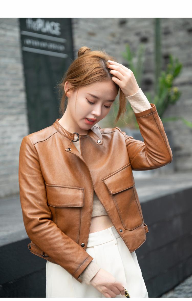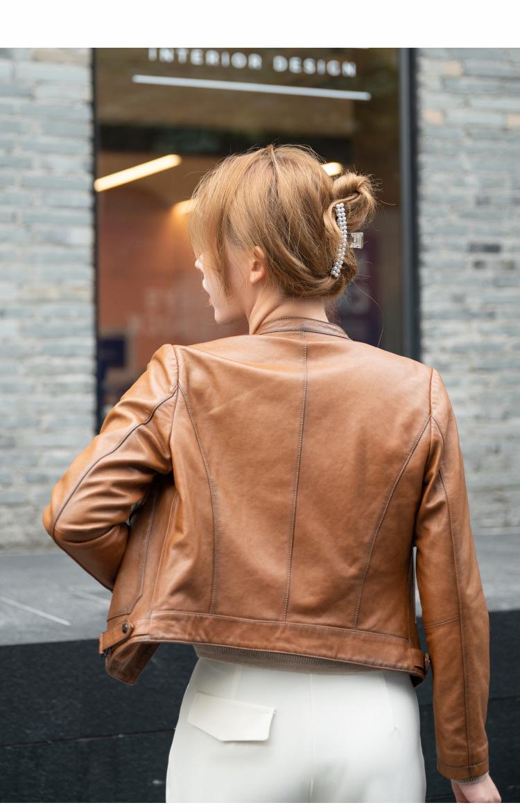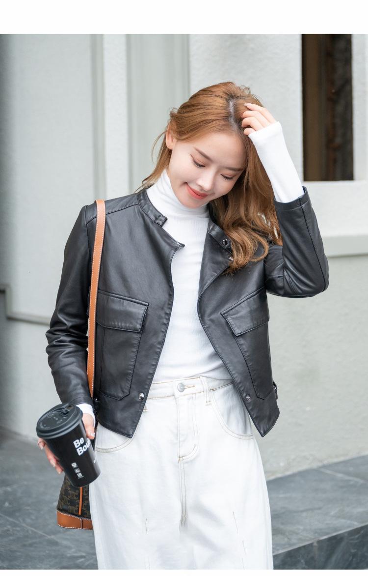 Chaqueta de Cuero Genuino Haining Corta de Motociclista Nueva de Primavera y Otoño 2025 para Mujer con Cuello Mao de Piel de Oveja Casual Ajustada