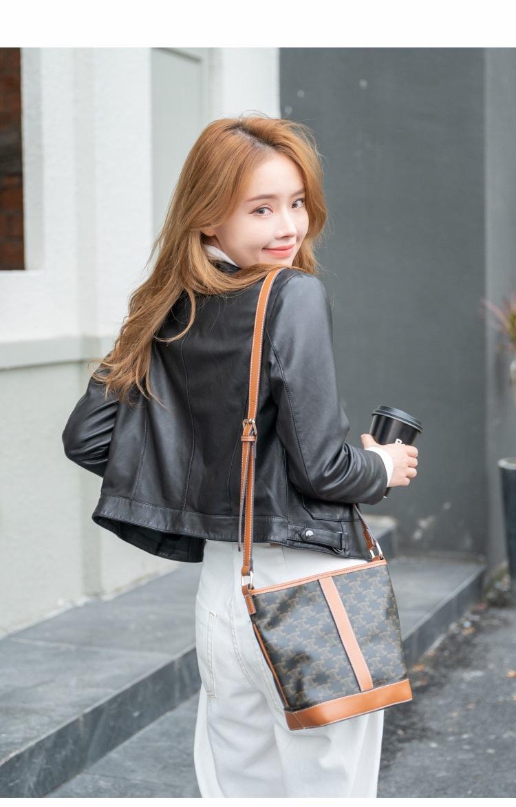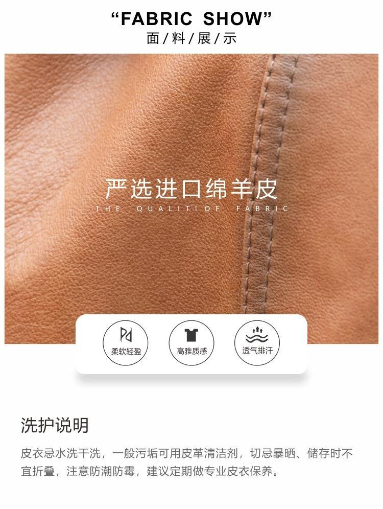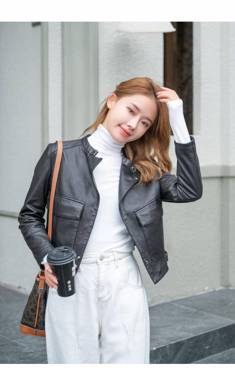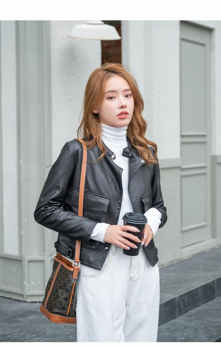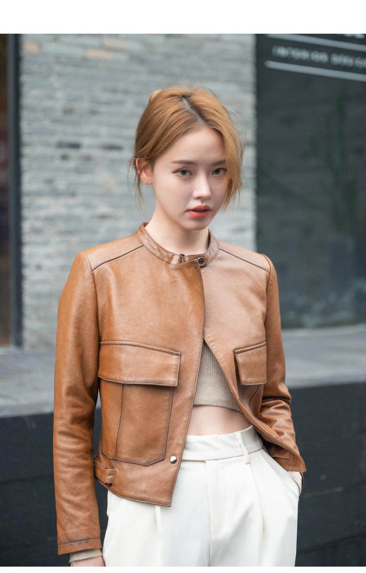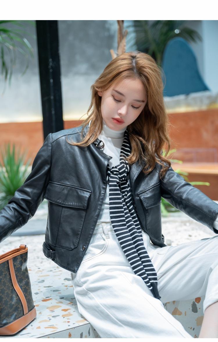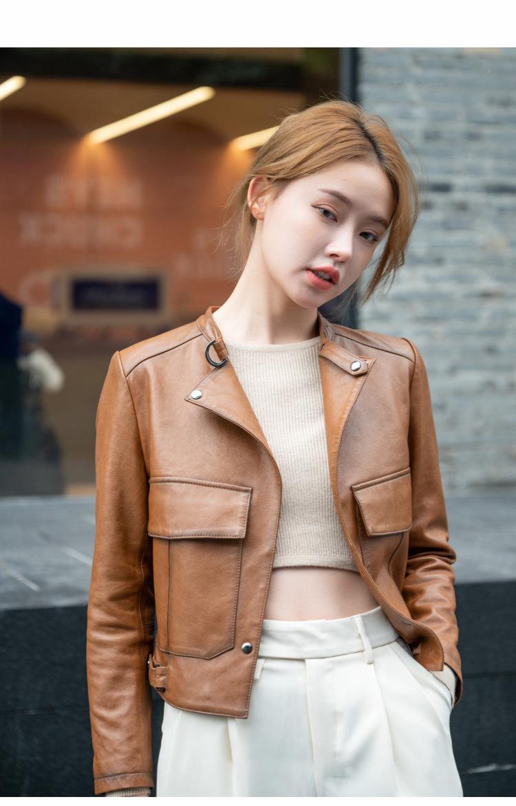 Chaqueta de Cuero Genuino Haining Corta de Motociclista Nueva de Primavera y Otoño 2025 para Mujer con Cuello Mao de Piel de Oveja Casual Ajustada