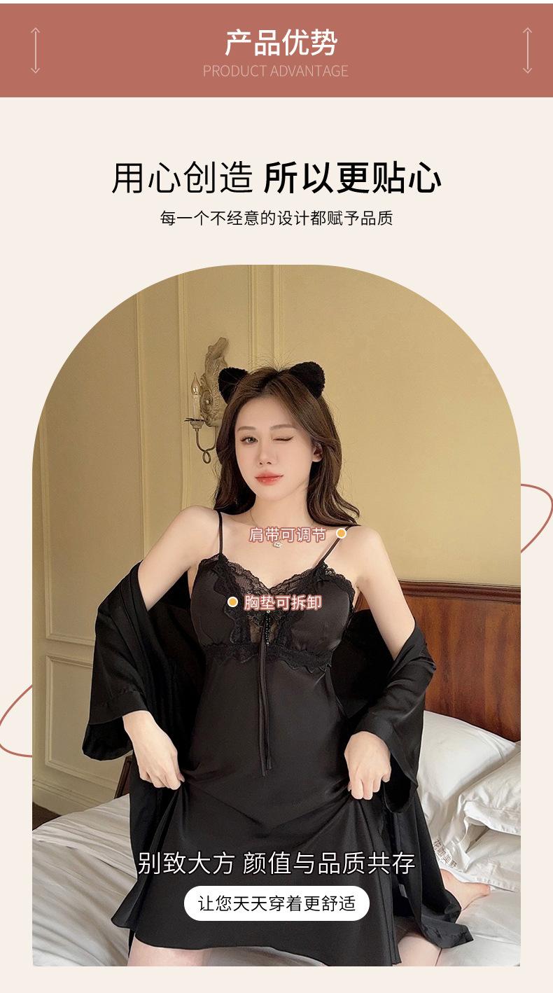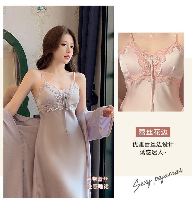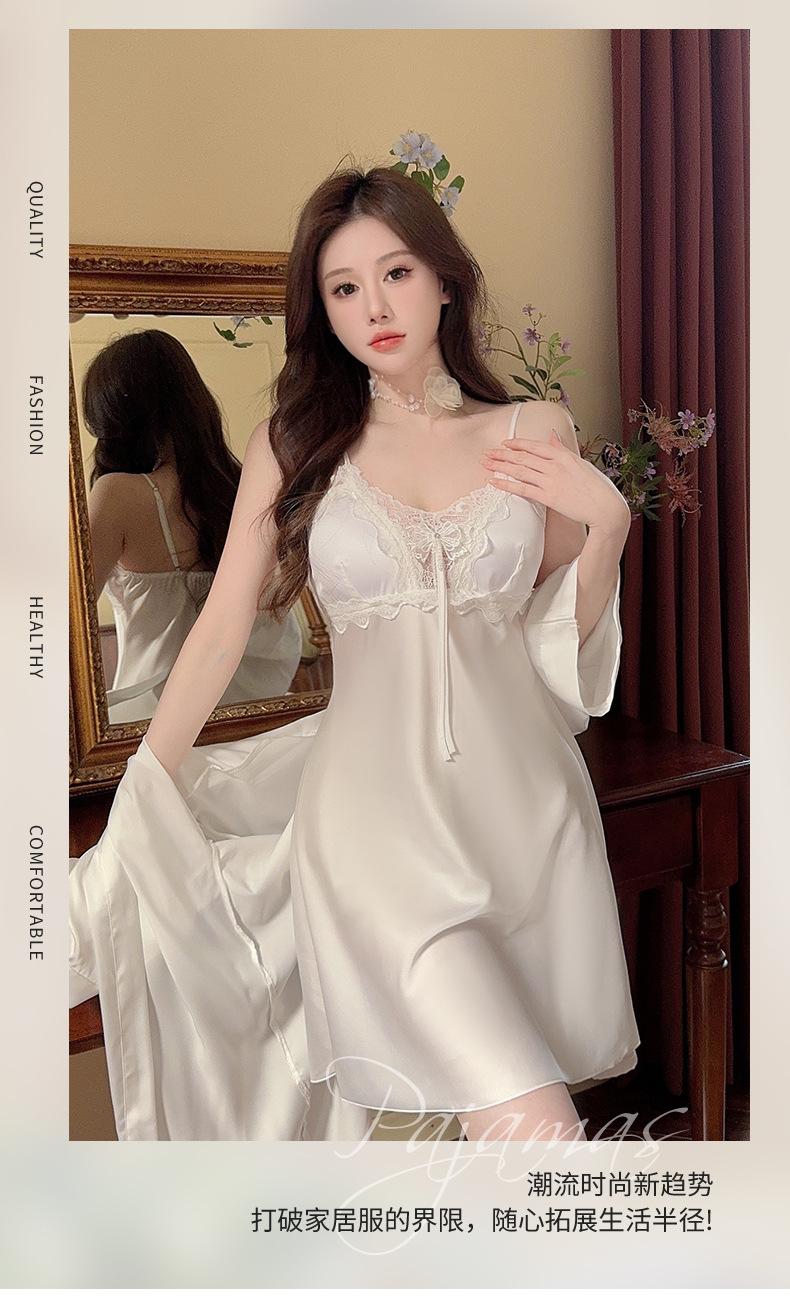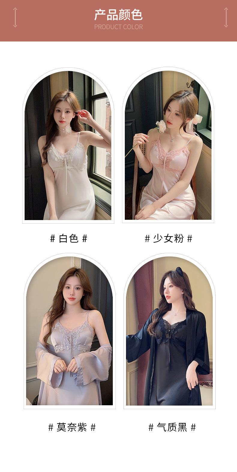 Pijama Sexy de Ropa Interior de Seda de Hielo con Almohadilla en el Pecho Push-up Lazo Encaje Transparente Camisón Bata Exterior Ropa para el Hogar para el Cabello