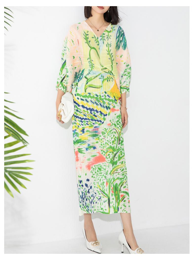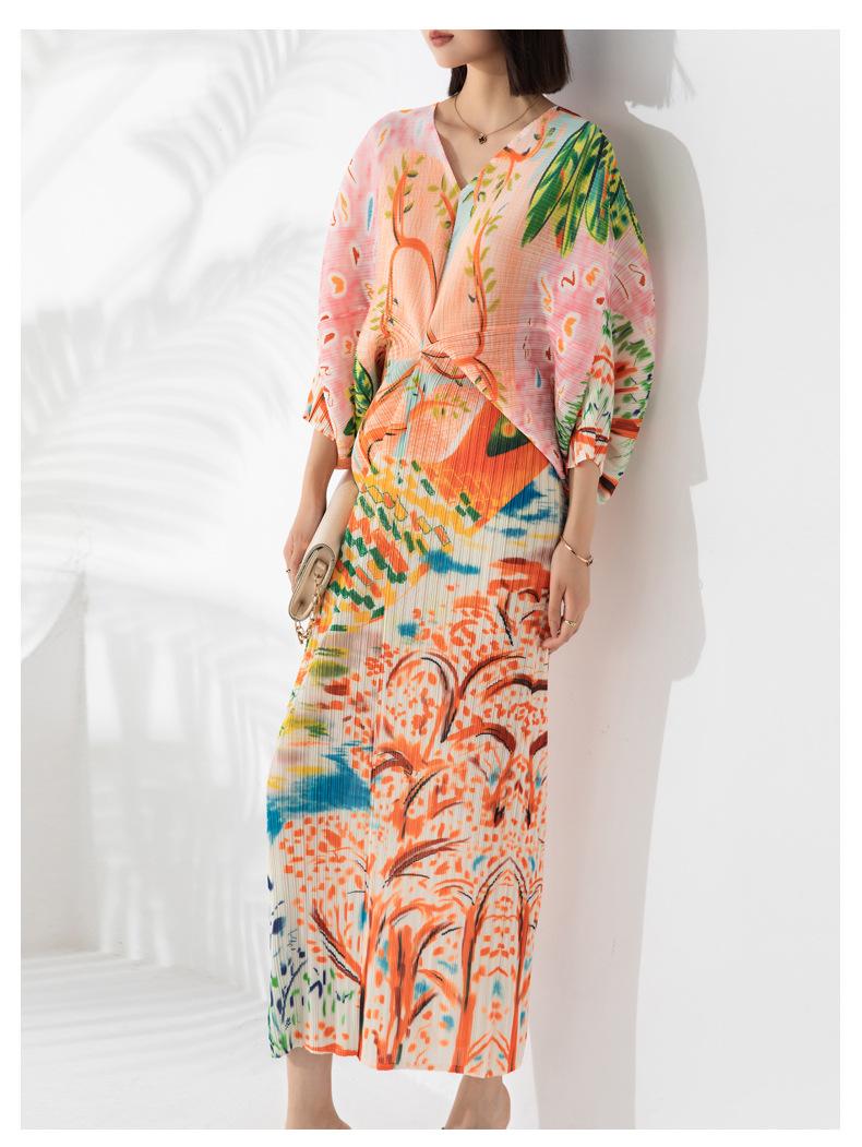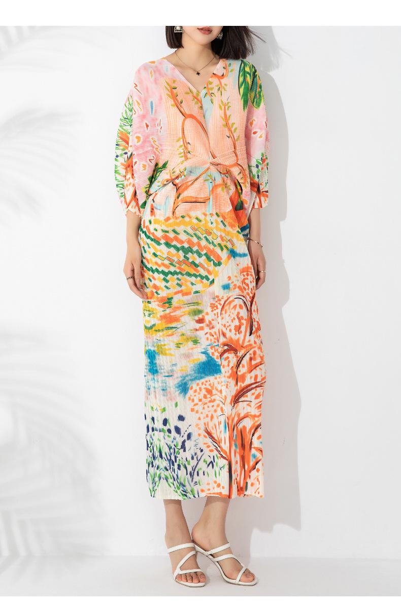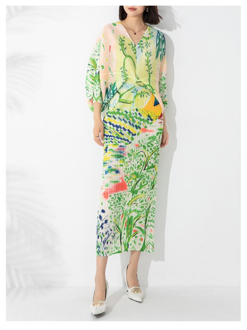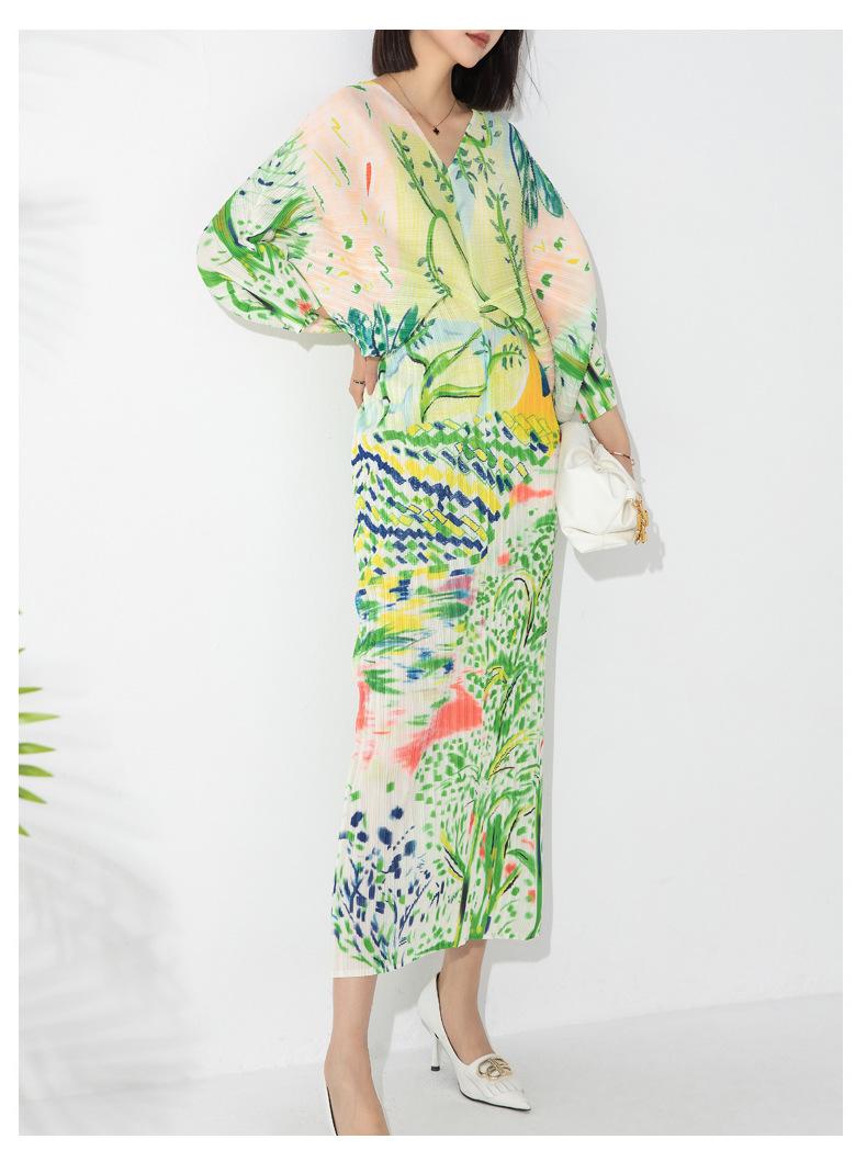 Vestido plisado con estampado de murciélago, cuello en V, elegante, de moda, talla grande, adelgazante, largo, de un solo paso, para mujer.