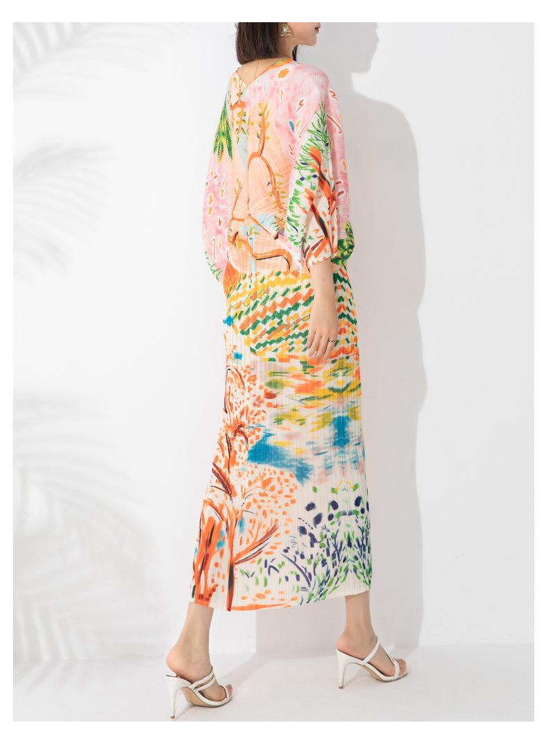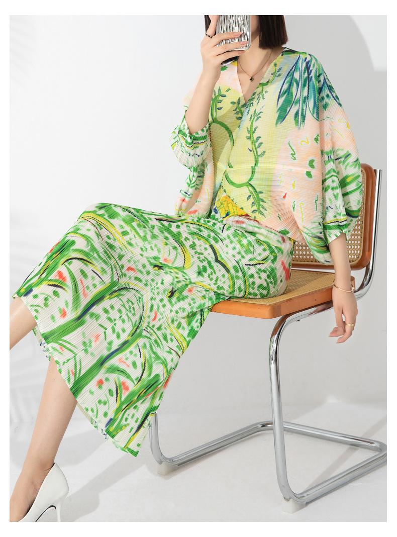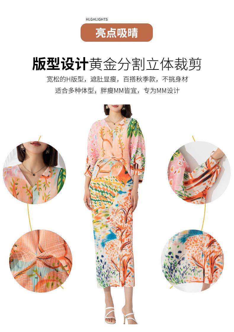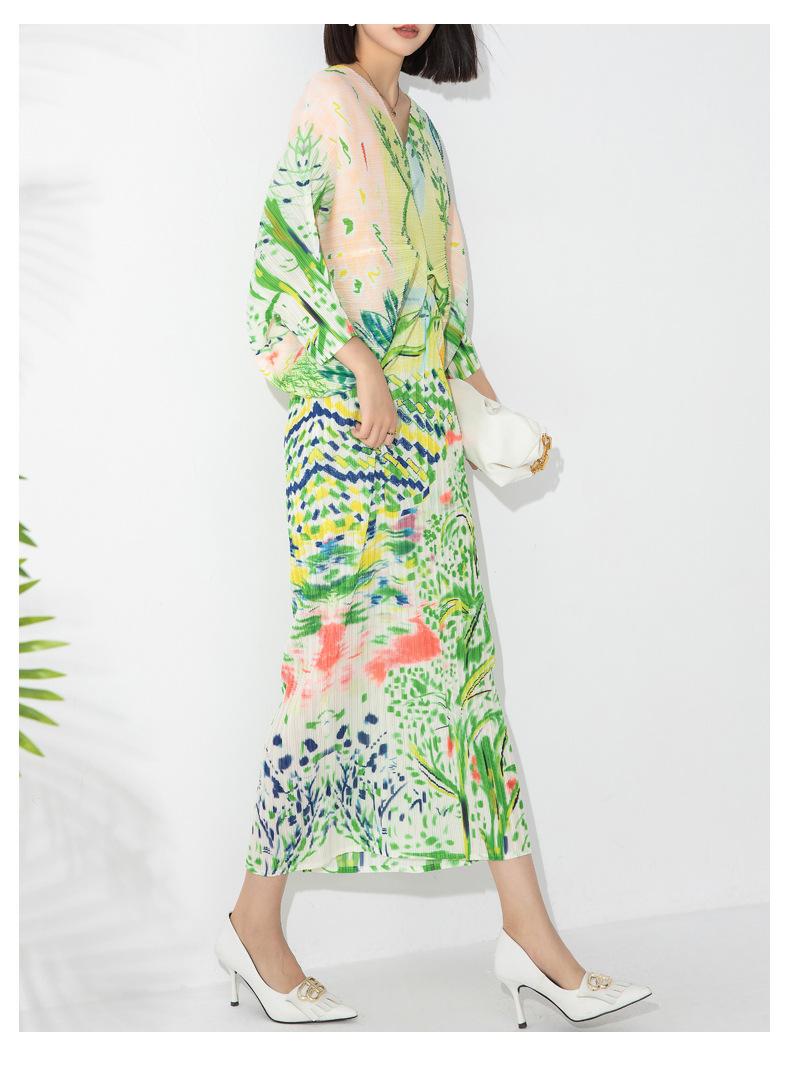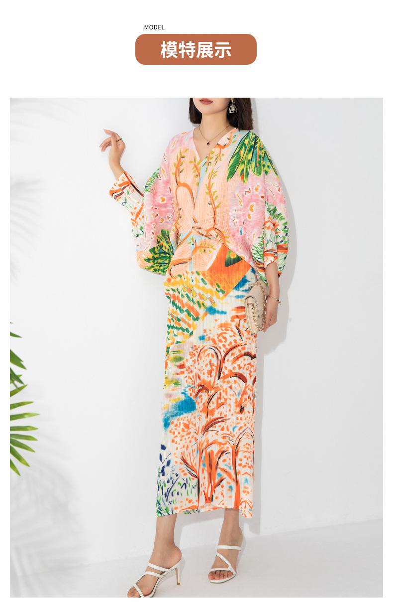 Vestido plisado con estampado de murciélago, cuello en V, elegante, de moda, talla grande, adelgazante, largo, de un solo paso, para mujer.