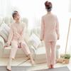 Cuello redondo Doble capa Gasa transpirable Traje lunar Retro Cuello redondo Hilo de algodón Pijama de dos piezas para mujeres embarazadas Pantalones de manga larga