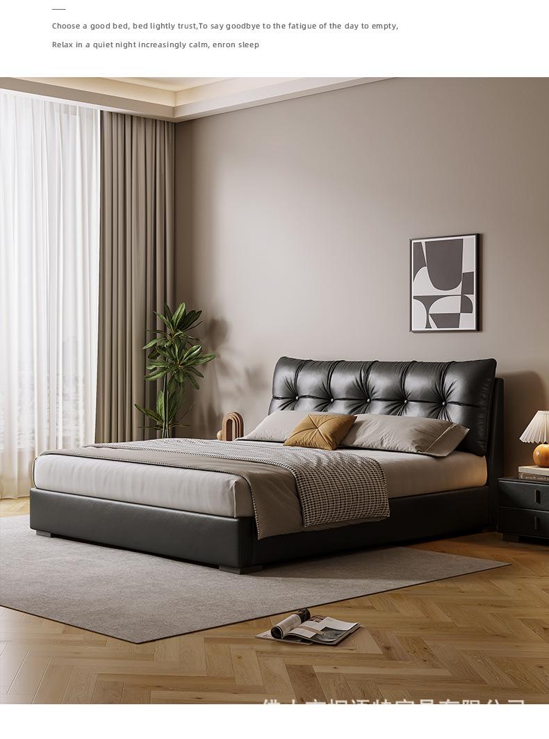 Cama de piso moderna minimalista de estilo italiano, ligera, de cuero de lujo, para dormitorio principal, cama doble de 1,8 m con almacenamiento en bolsa suave negra.