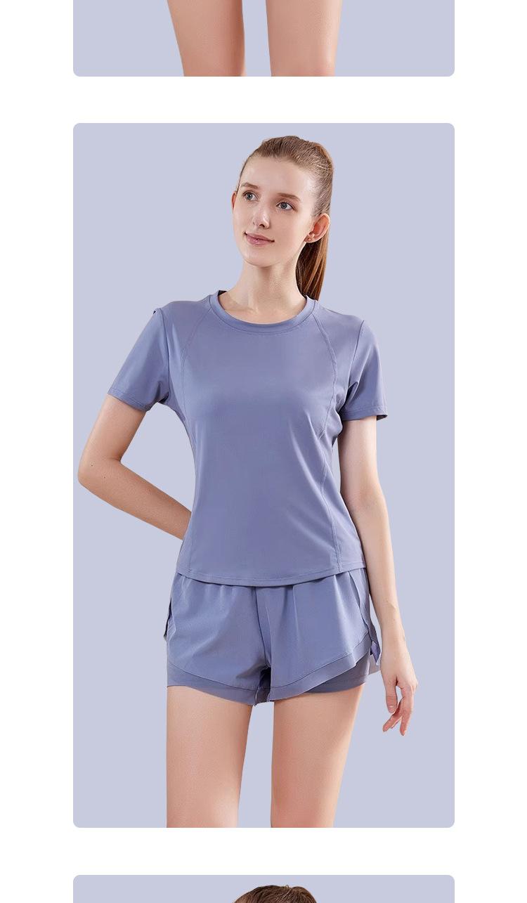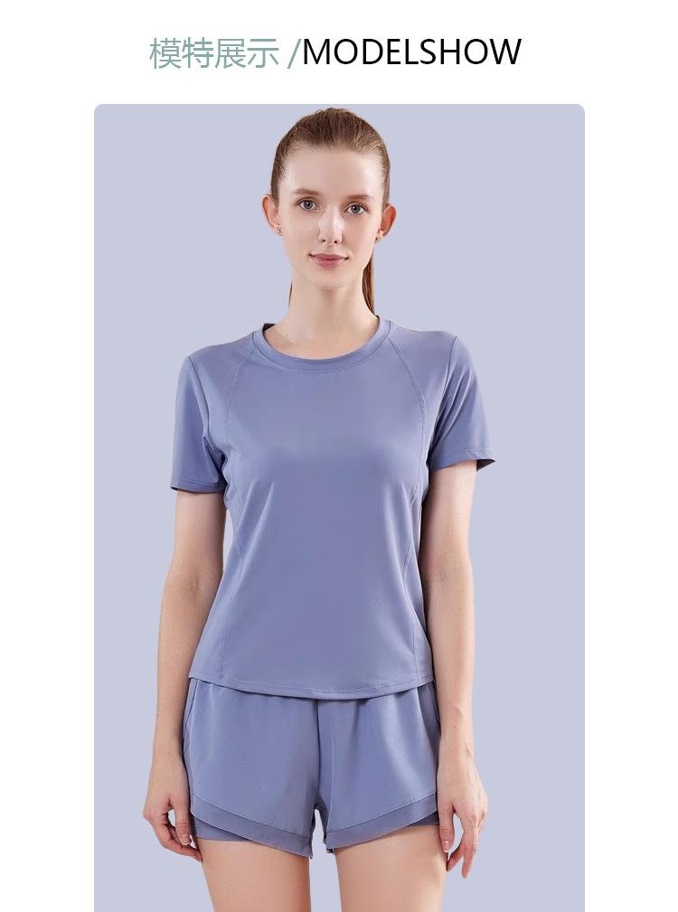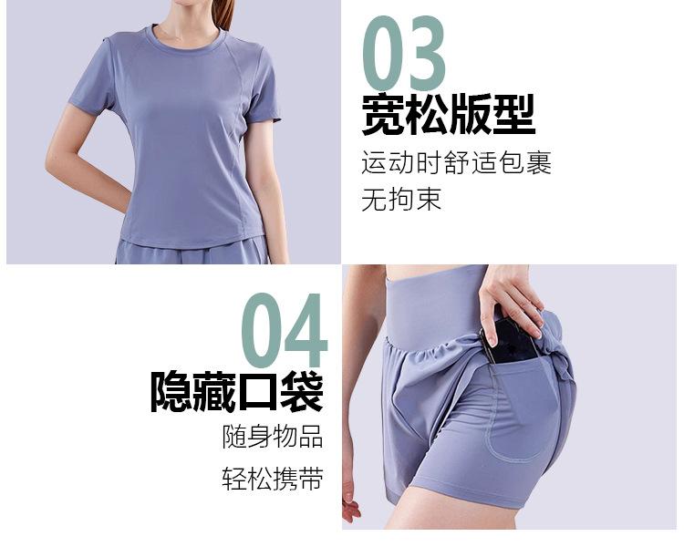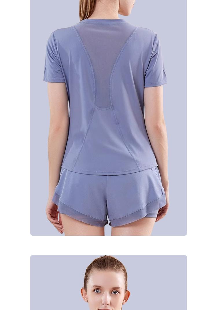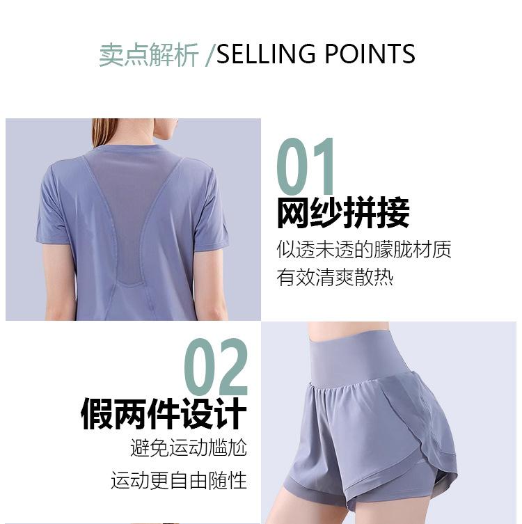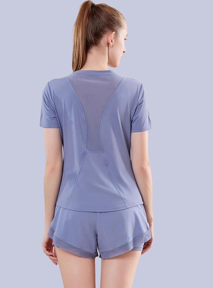 Secado rápido Costuras de malla Antirozaduras Deportes Ropa de yoga de verano para mujer Suelta para correr Suelta Cintura alta Traje de manga corta