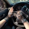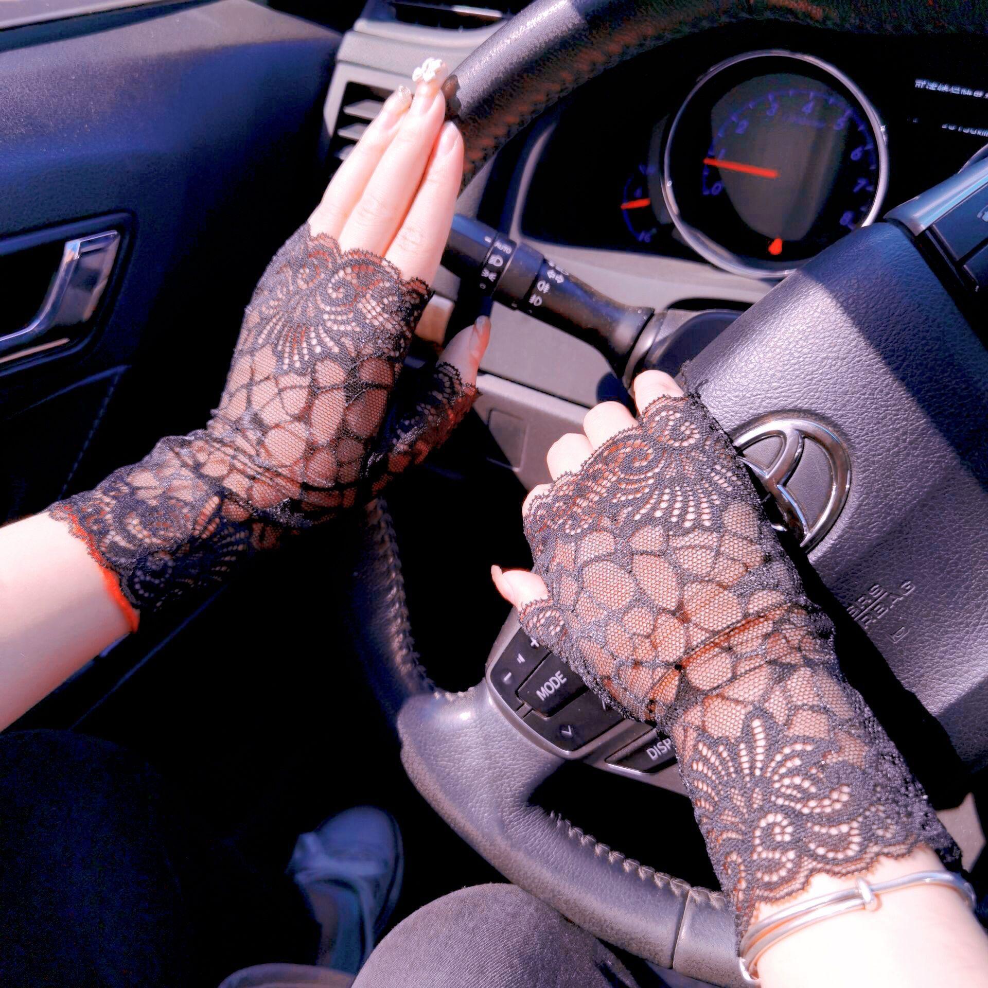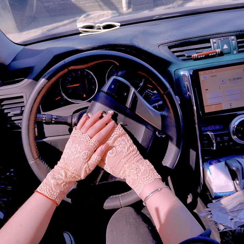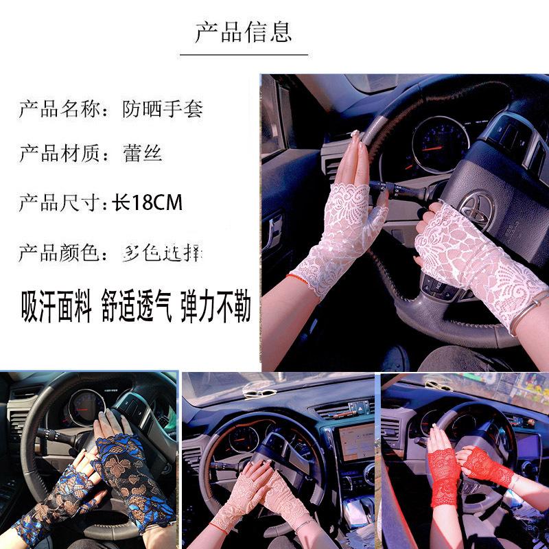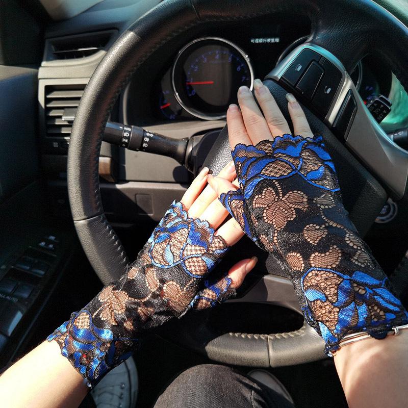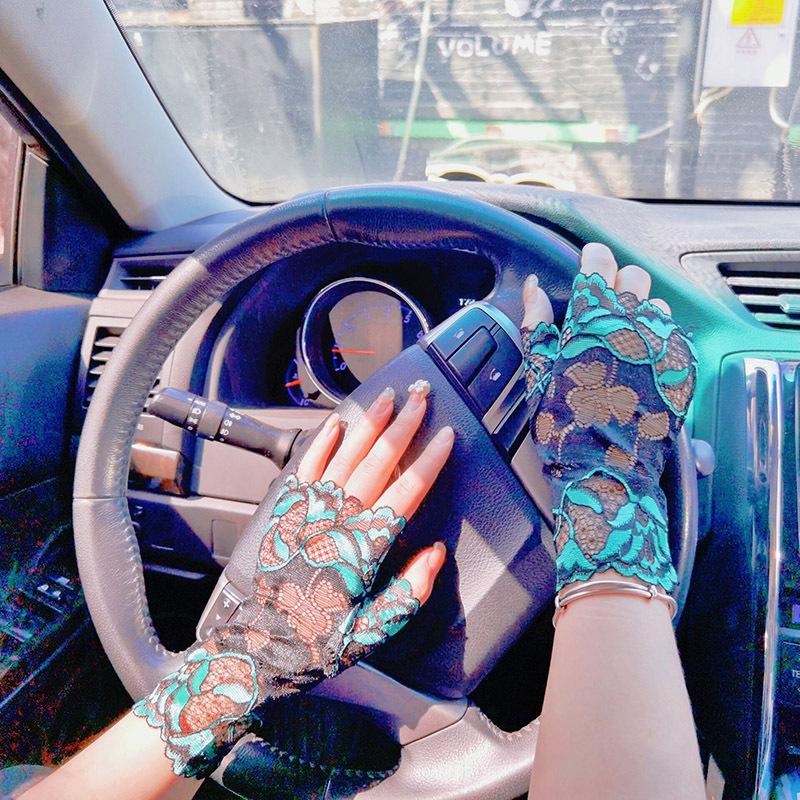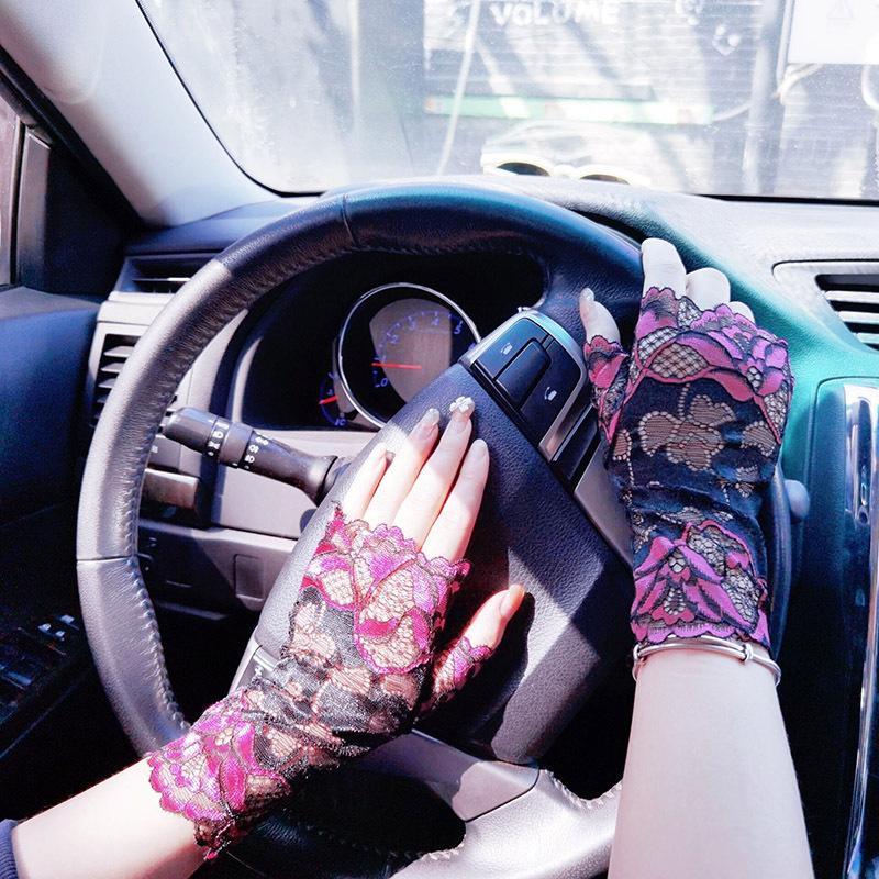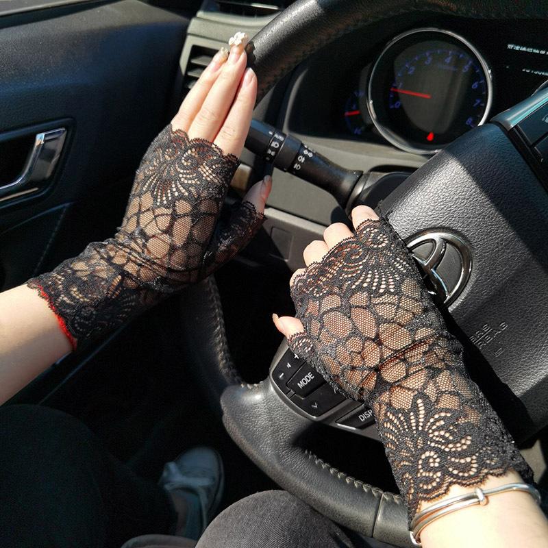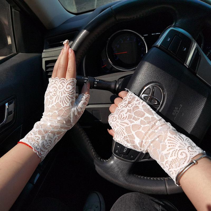 Guantes de medio dedo con protección solar de encaje para mujer, de verano, finos, transpirables, antiultravioleta, ahuecados, elegantes, para montar a caballo y conducir.