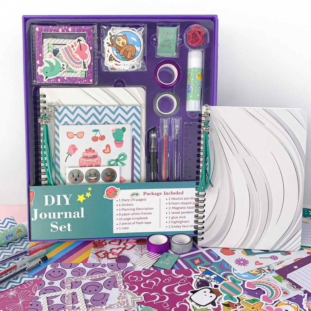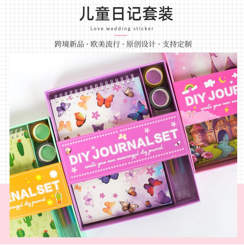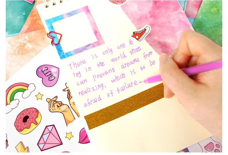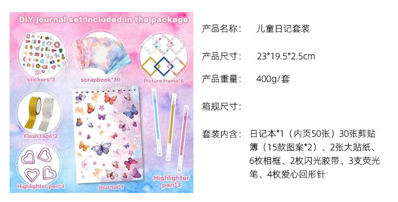 Diario*1 (50 páginas), 30 álbumes de recortes (15 diseños*2), 2 pegatinas grandes, 6 marcos de fotos, 2 cintas de purpurina, 3 resaltadores, 4 clips de papel de amor