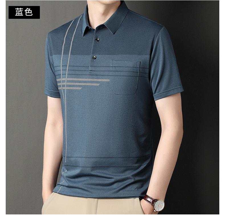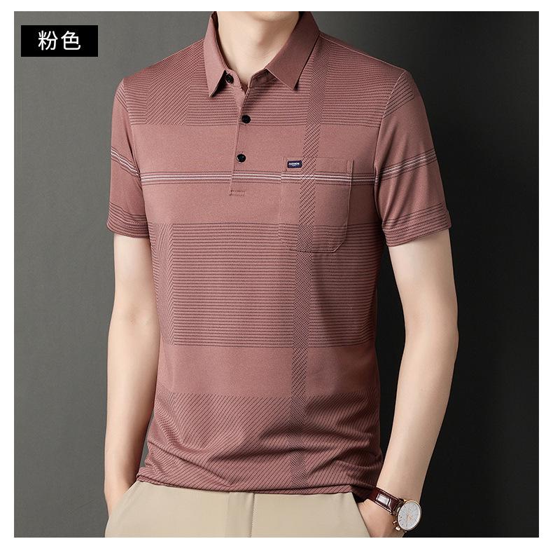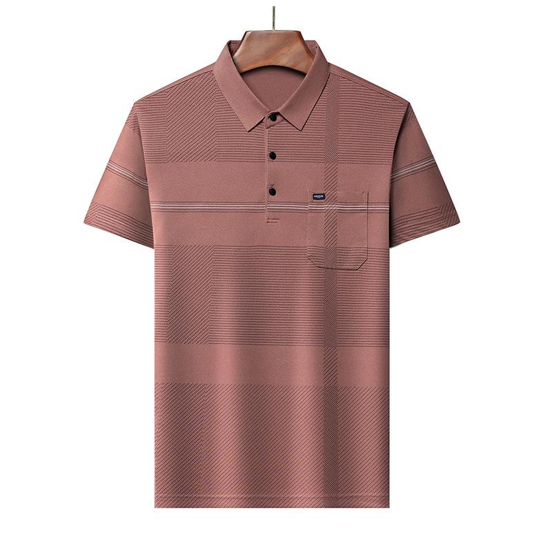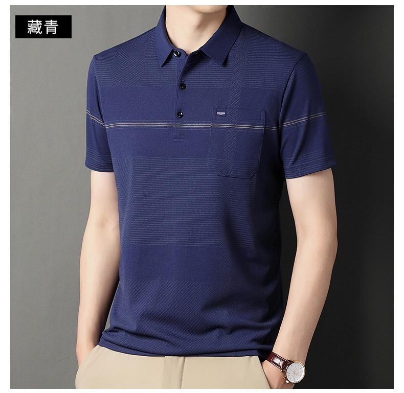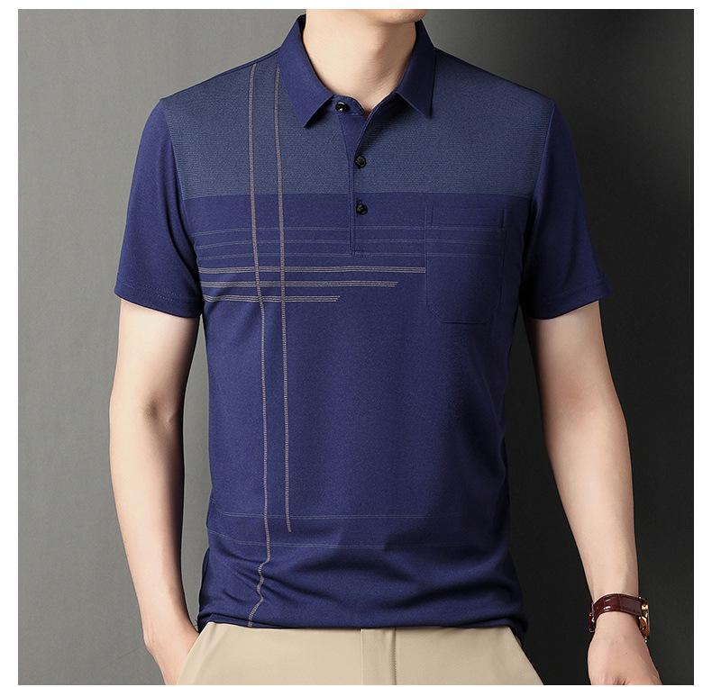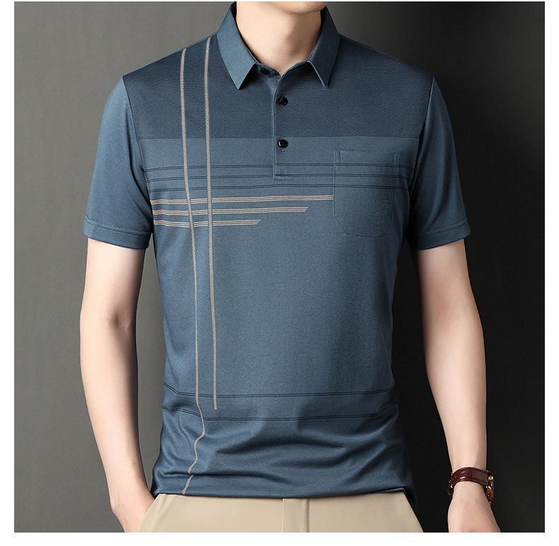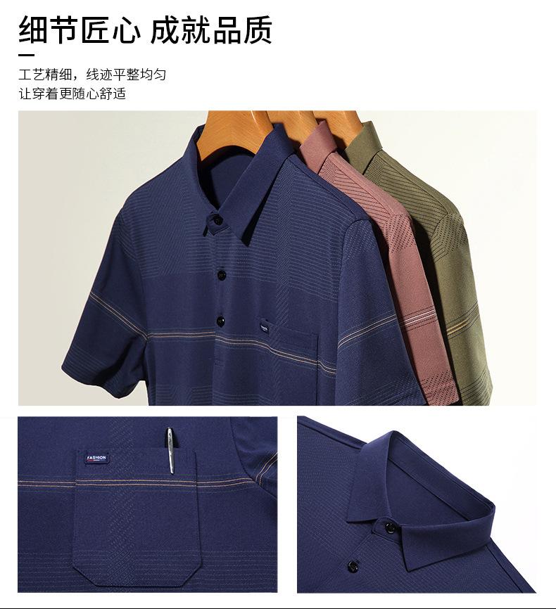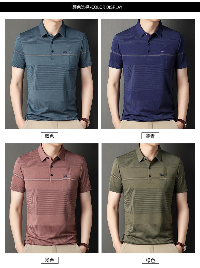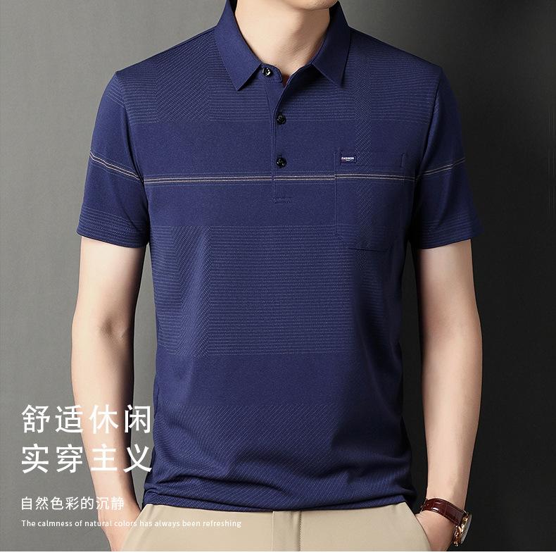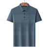Camiseta de Verano de Solapa de Seda de Hielo de Papá de Manga Corta para Hombre con Bolsillo de Solapa Real Pantalones Camisa Polo de Rayas Finas para Hombres de Mediana Edad y Mayores