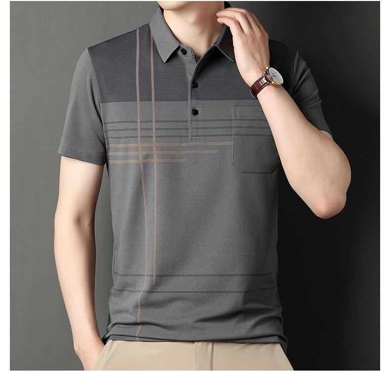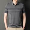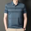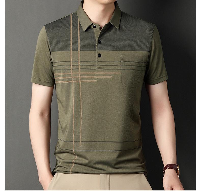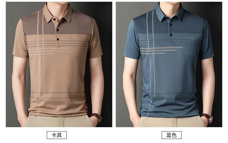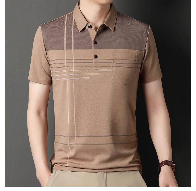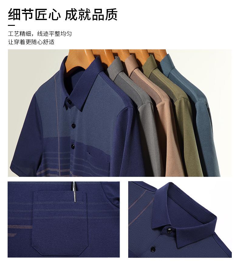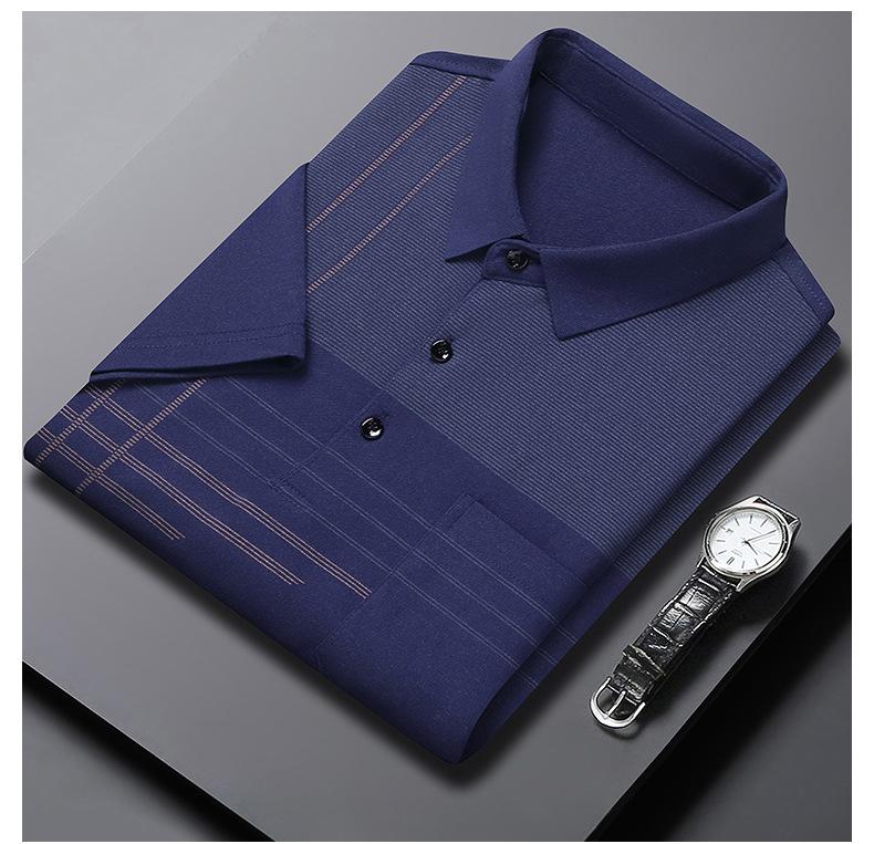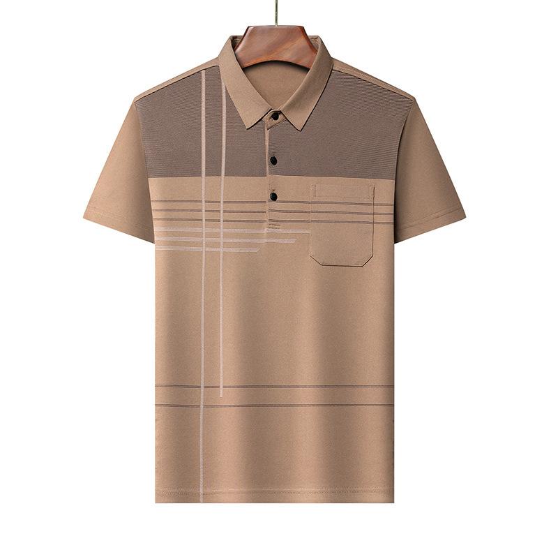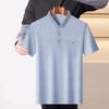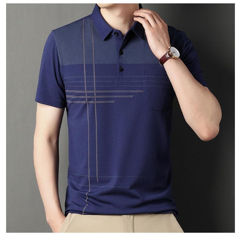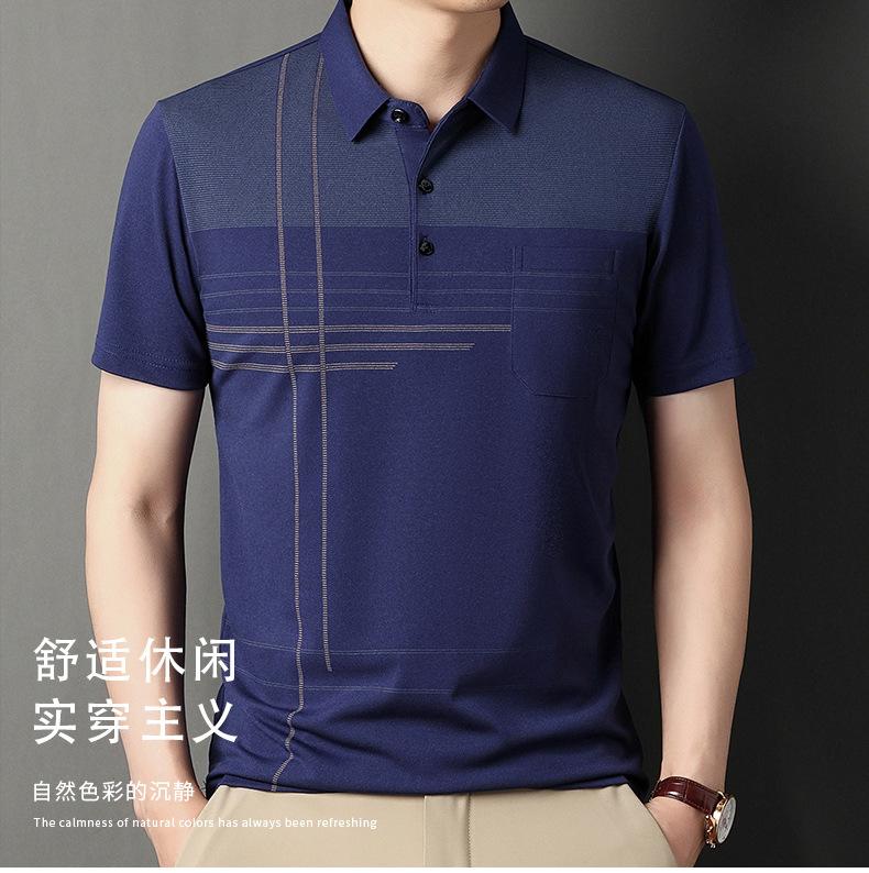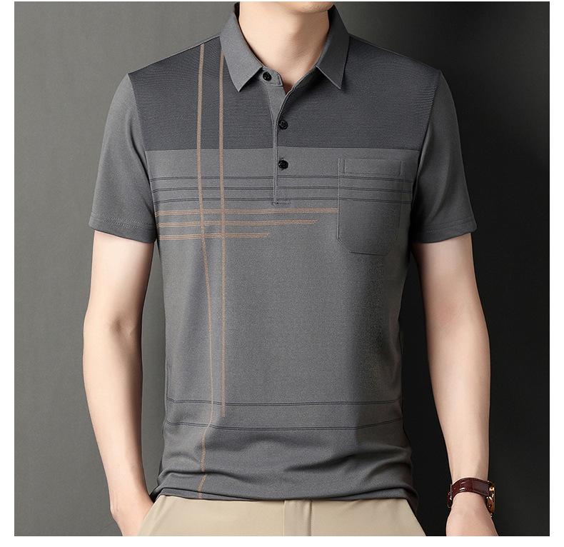 Camiseta de Verano de Solapa de Seda de Hielo de Papá de Manga Corta para Hombre con Bolsillo de Solapa Real Pantalones Camisa Polo de Rayas Finas para Hombres de Mediana Edad y Mayores