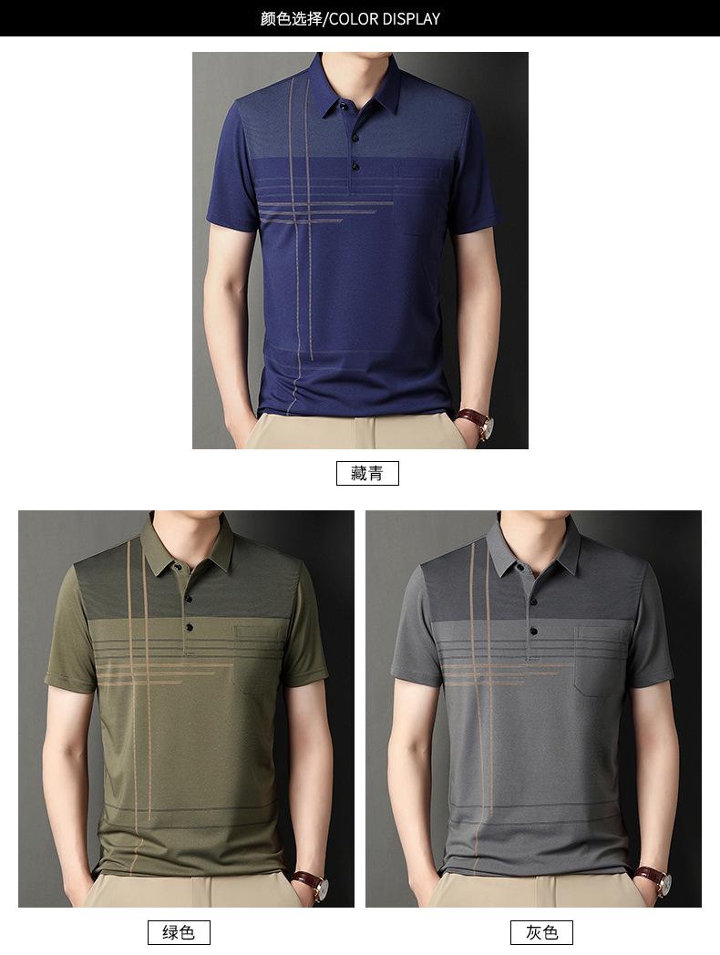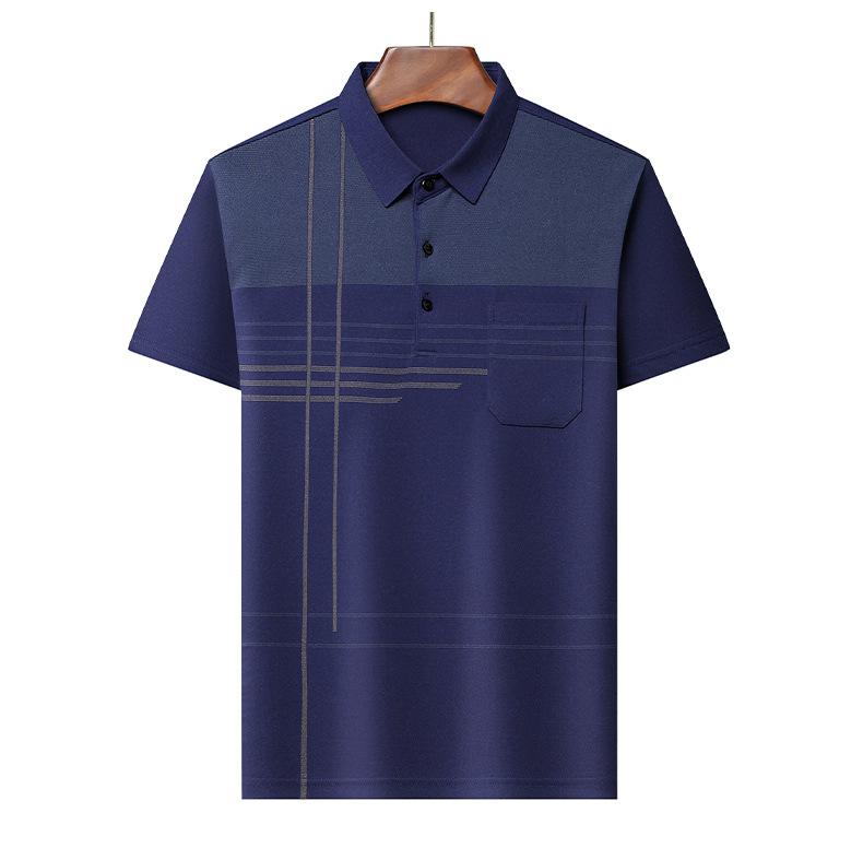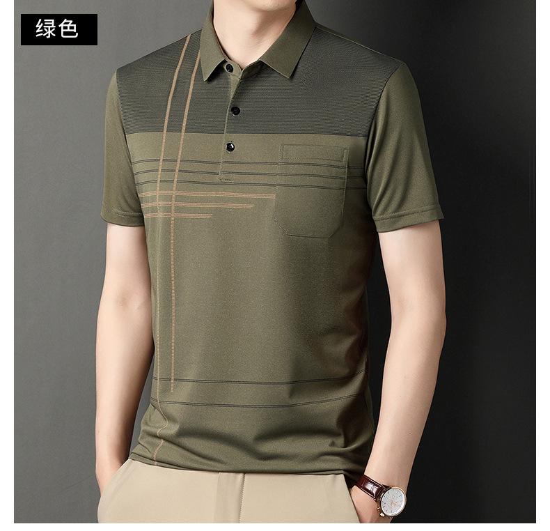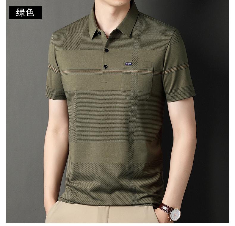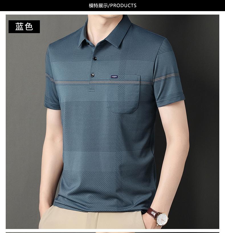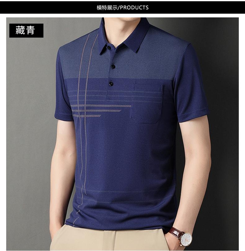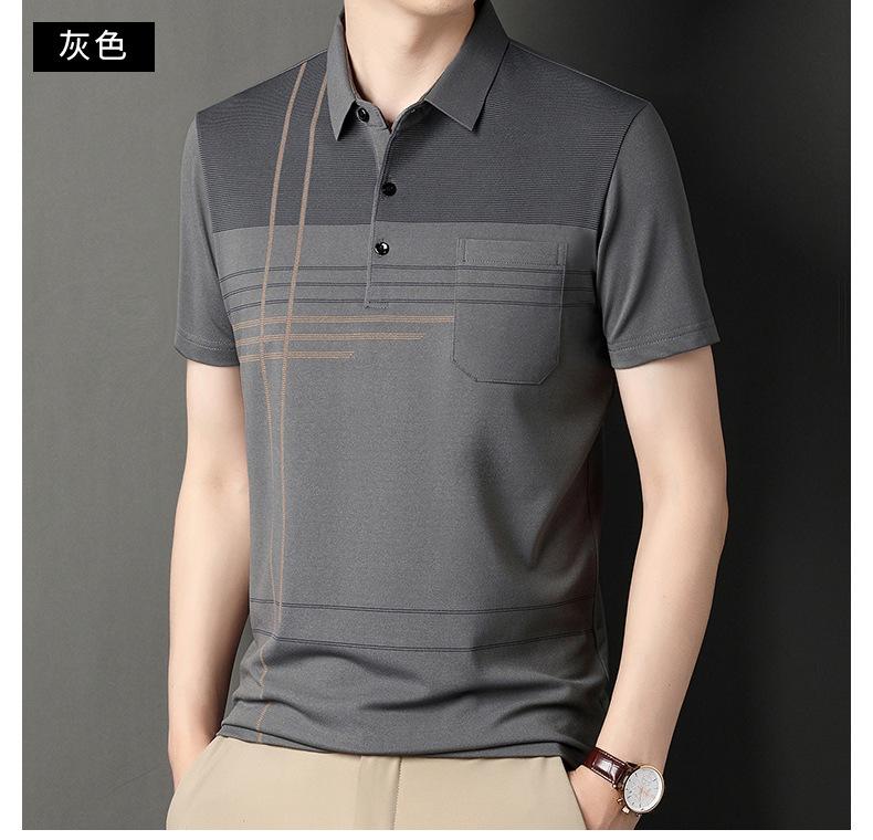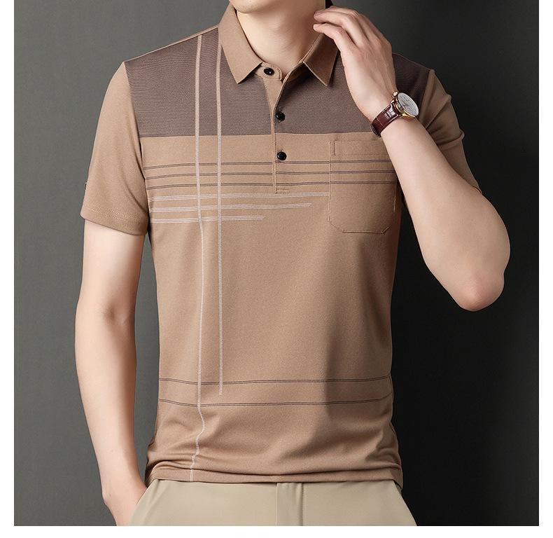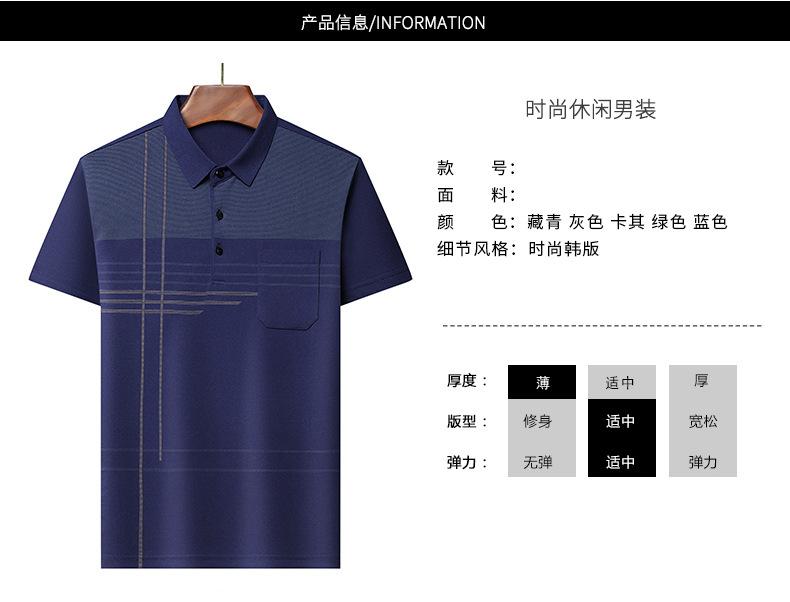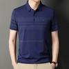 Camiseta de Verano de Solapa de Seda de Hielo de Papá de Manga Corta para Hombre con Bolsillo de Solapa Real Pantalones Camisa Polo de Rayas Finas para Hombres de Mediana Edad y Mayores