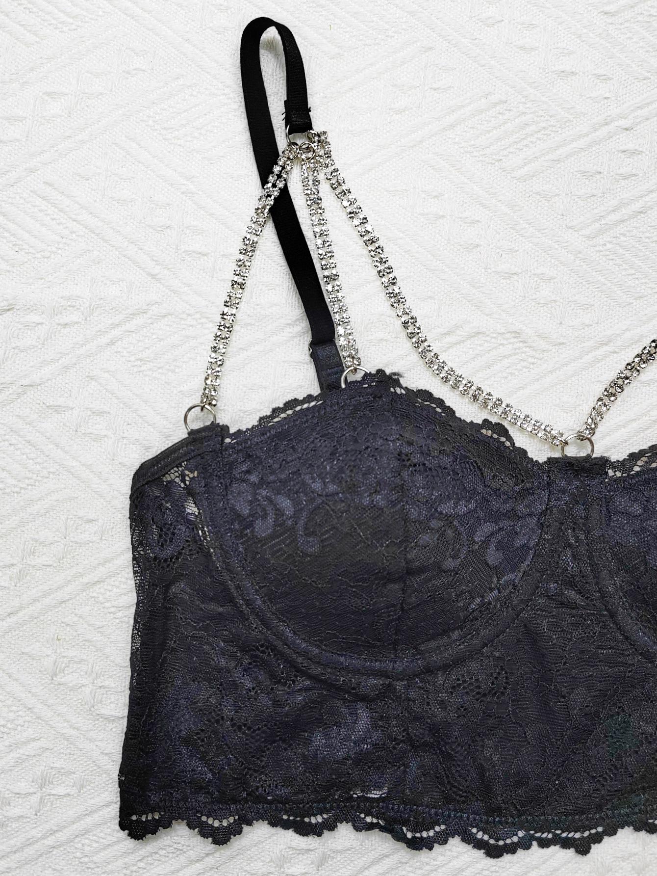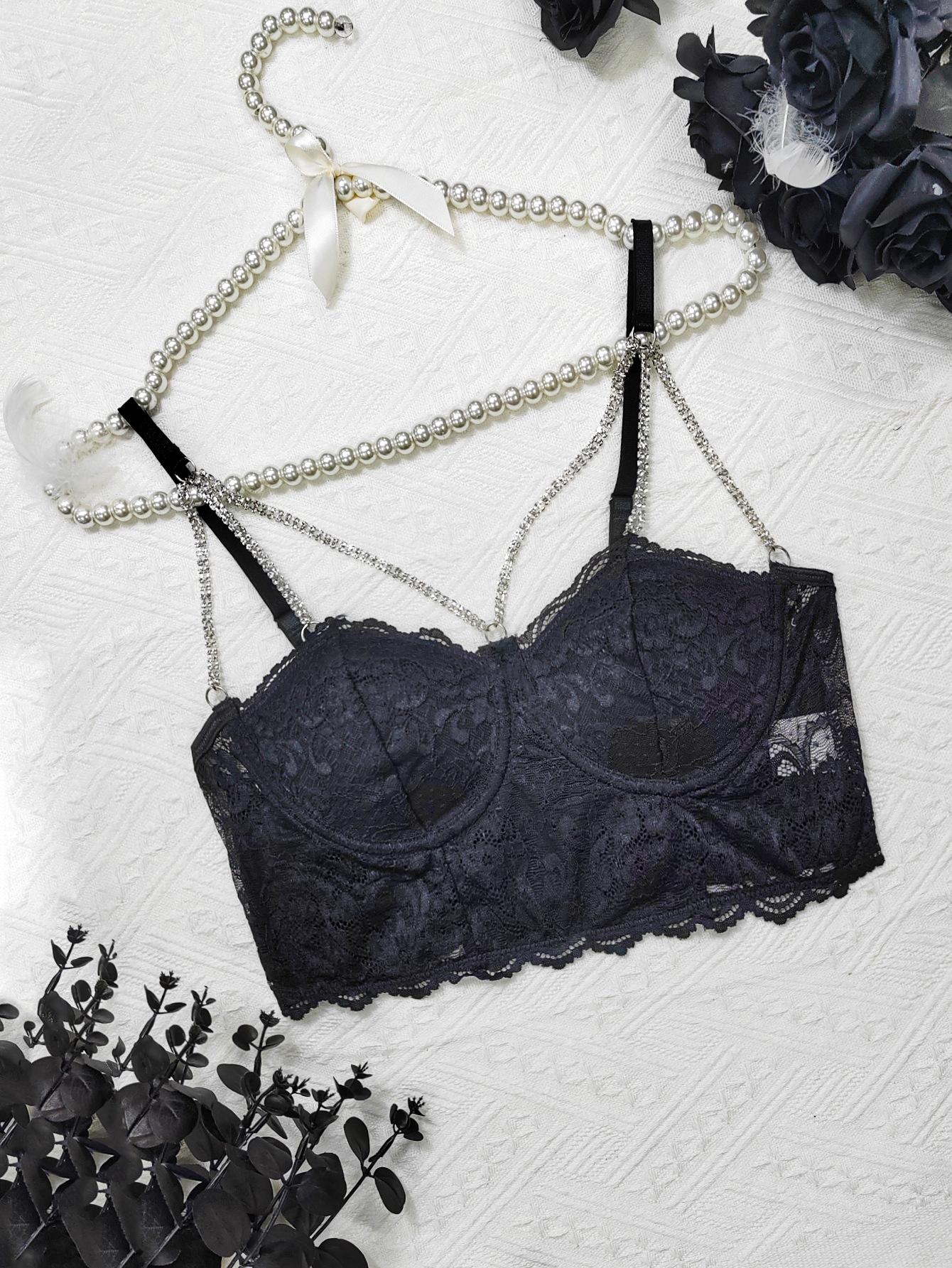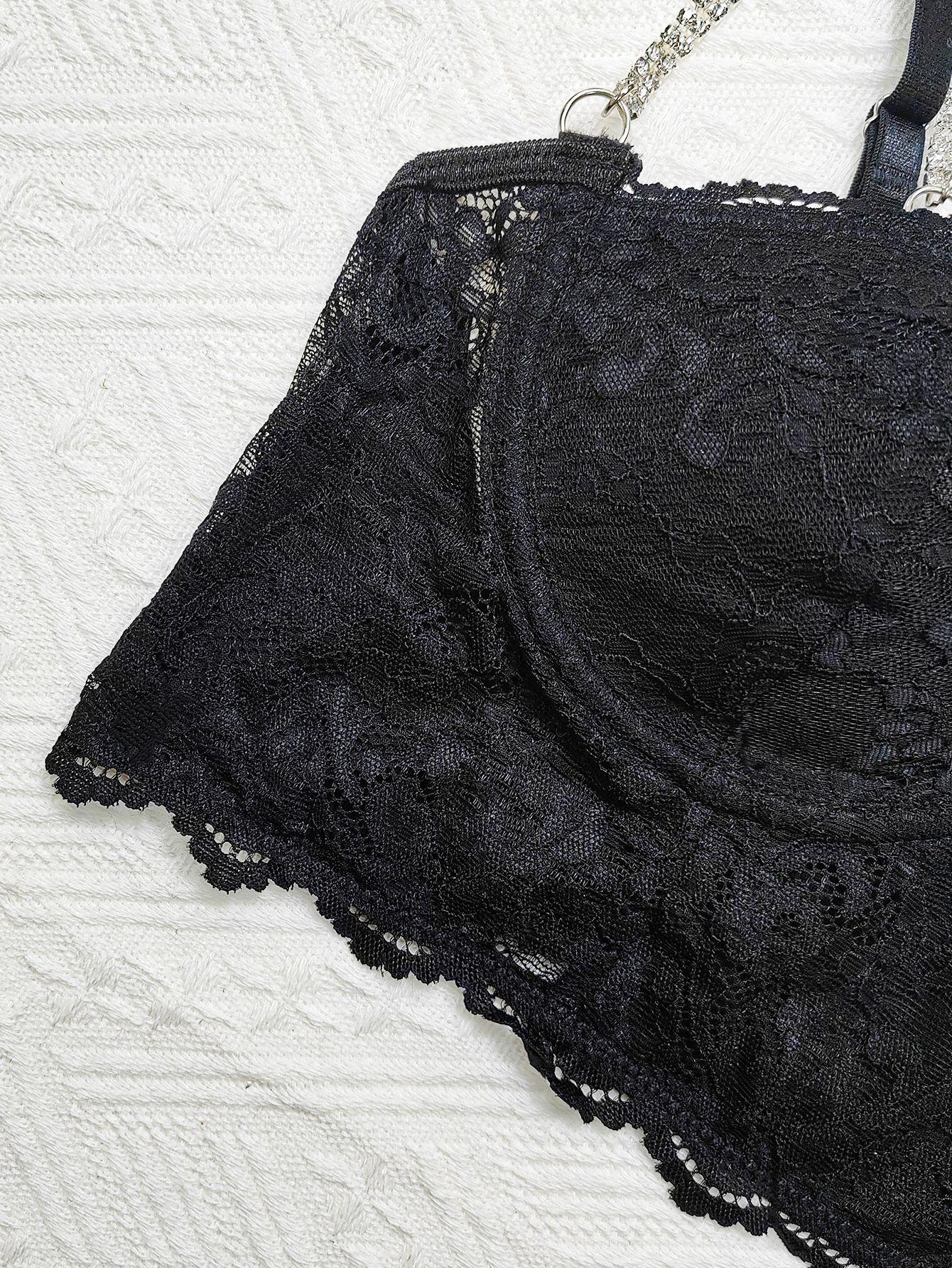 Camisola sexy de encaje transfronterizo, nueva, europea y americana, con anillos de acero, parte superior fruncida y empalme de cadena de diamantes brillantes.