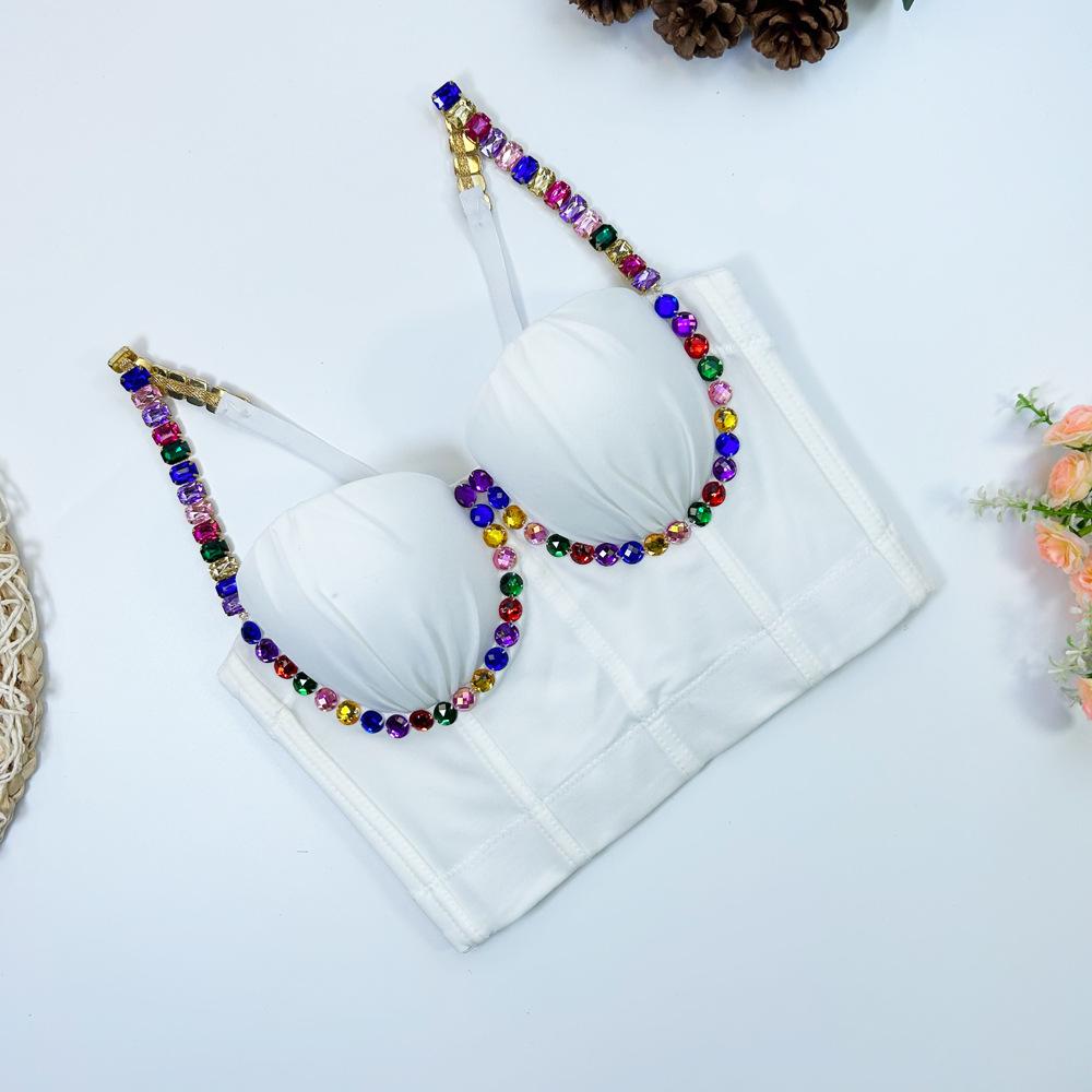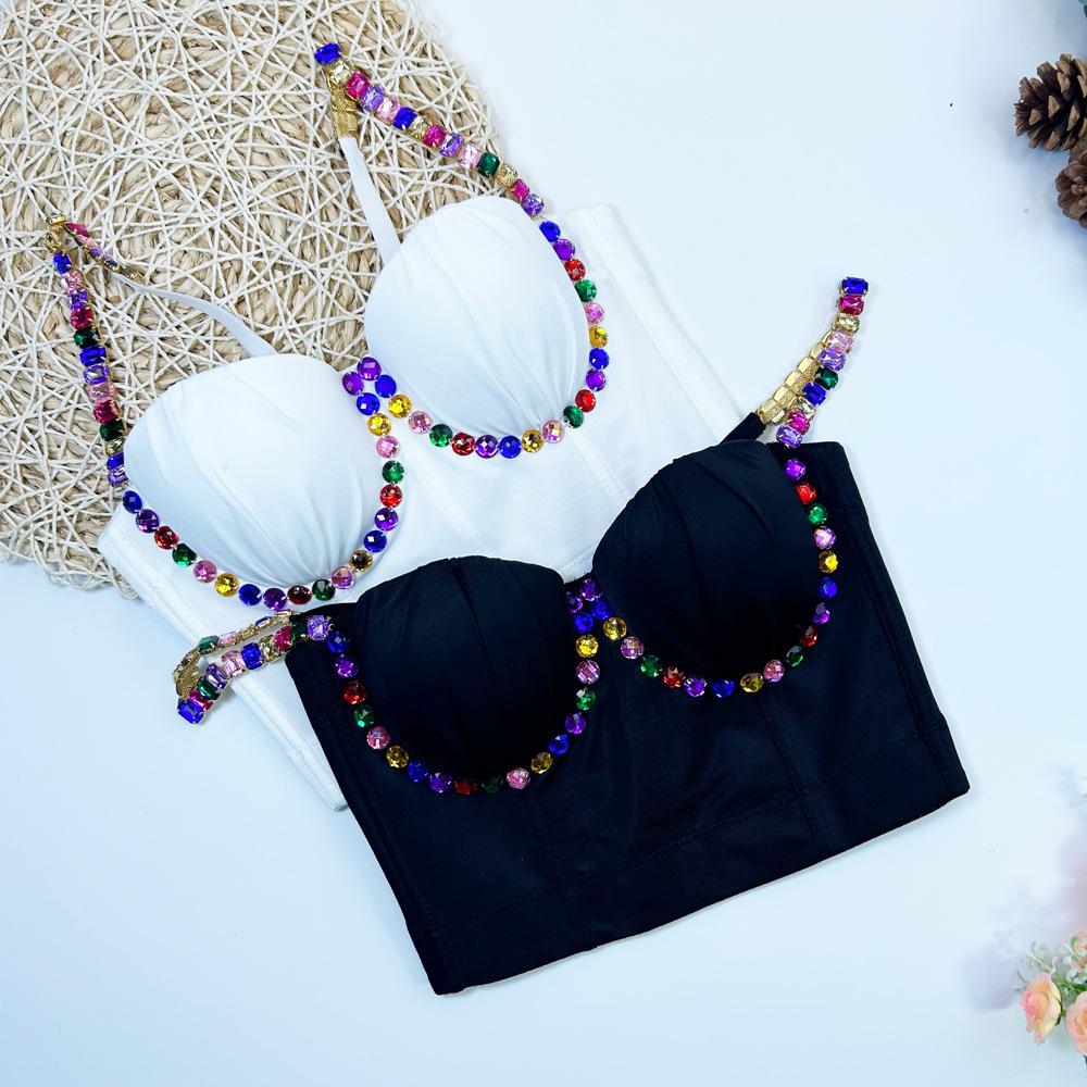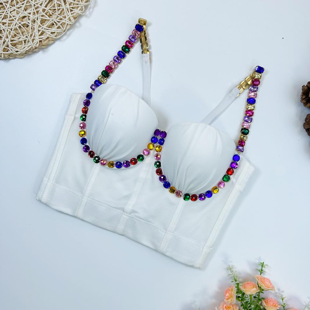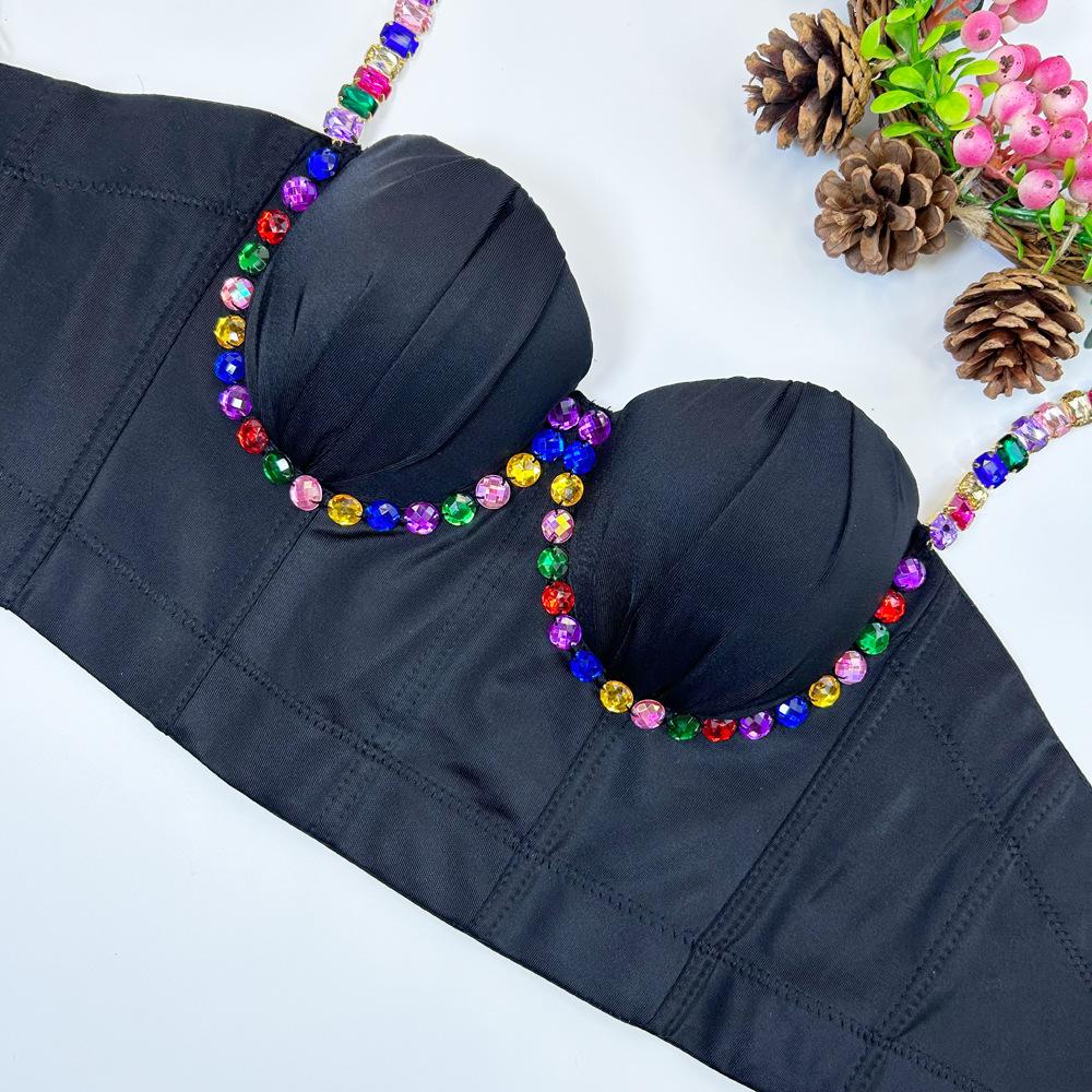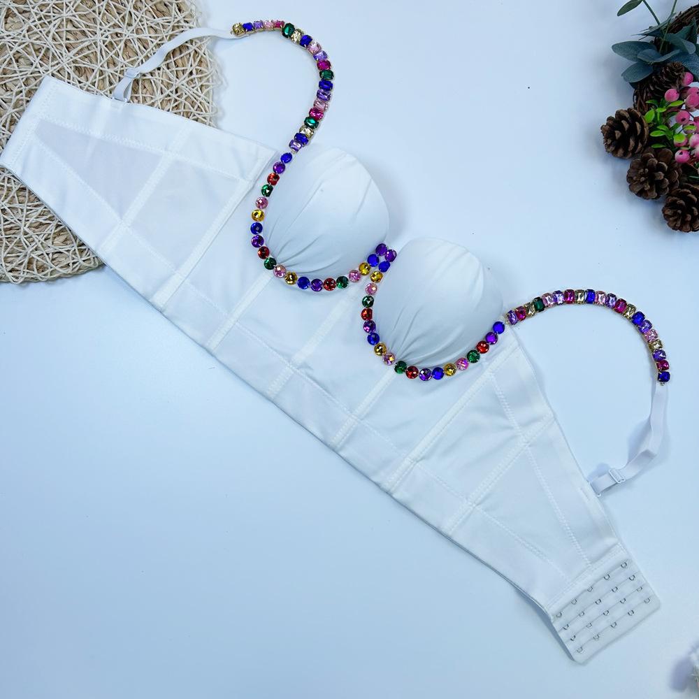 Corsé con aro de acero y parte superior de tubo con cuentas de gemas de colores, estilo extranjero europeo y americano, con diseño de espiga, ropa exterior y interior, con tirantes pequeños.