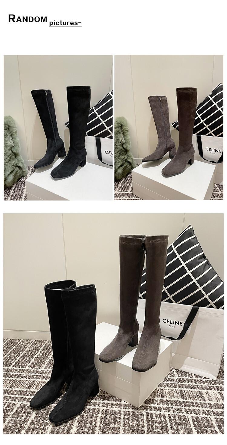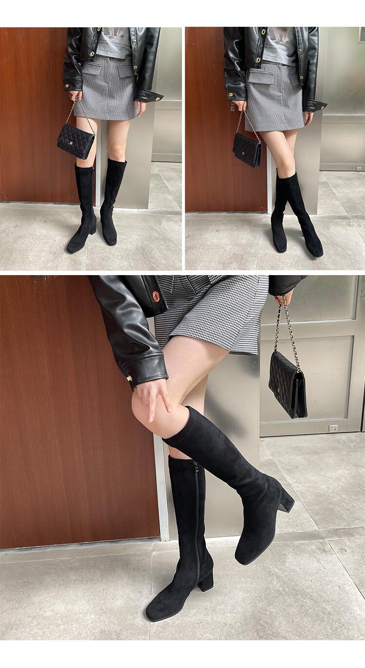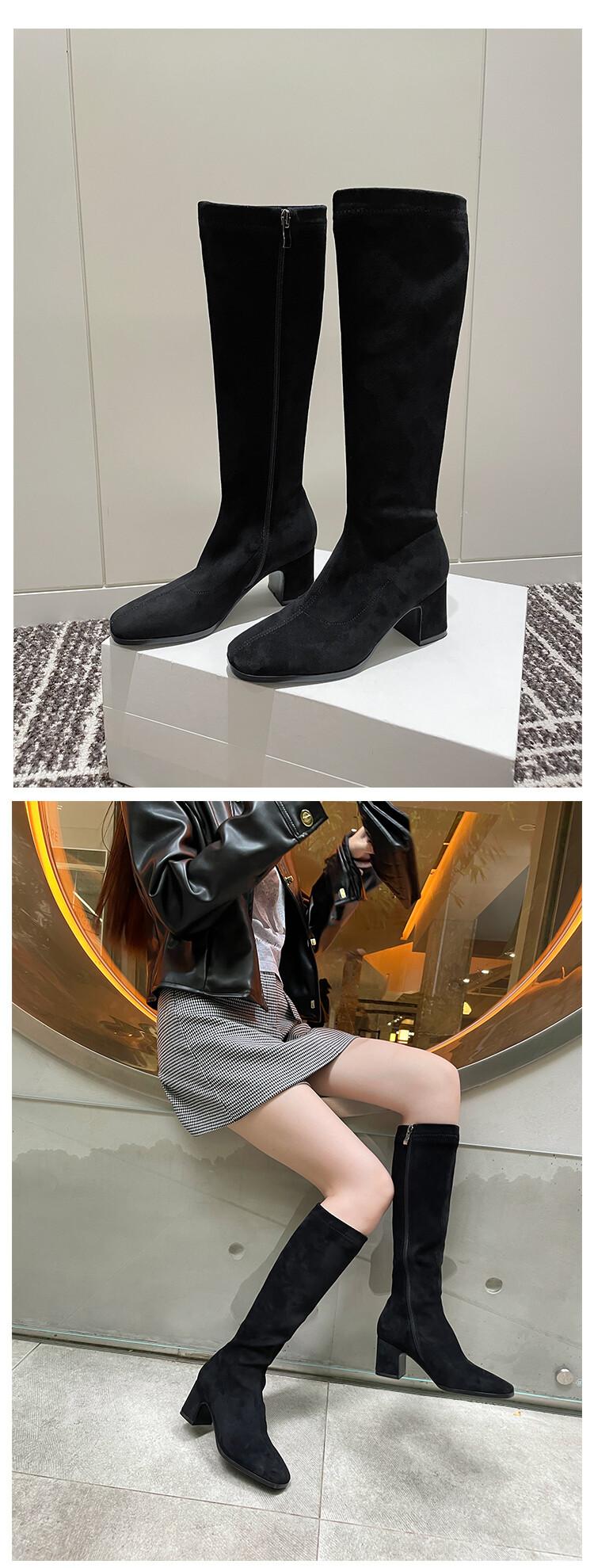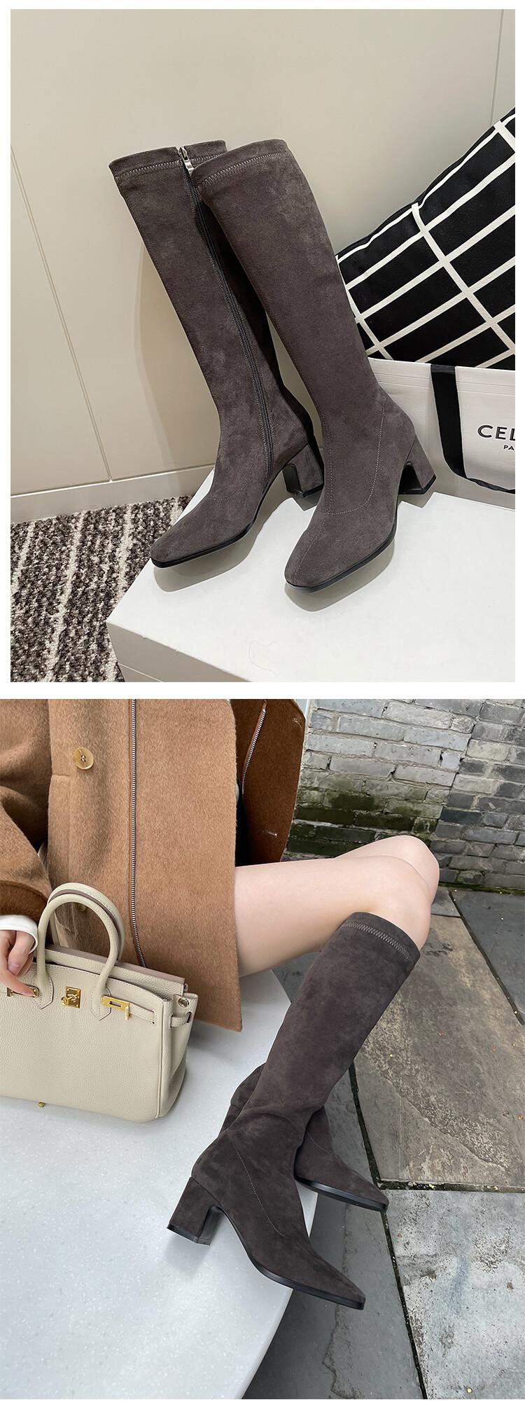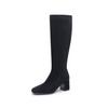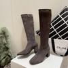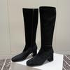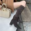 Botas elásticas para mujer, botas largas de ante con punta cuadrada pequeña y tacón alto, botas vintage de tacón grueso y ajustadas.