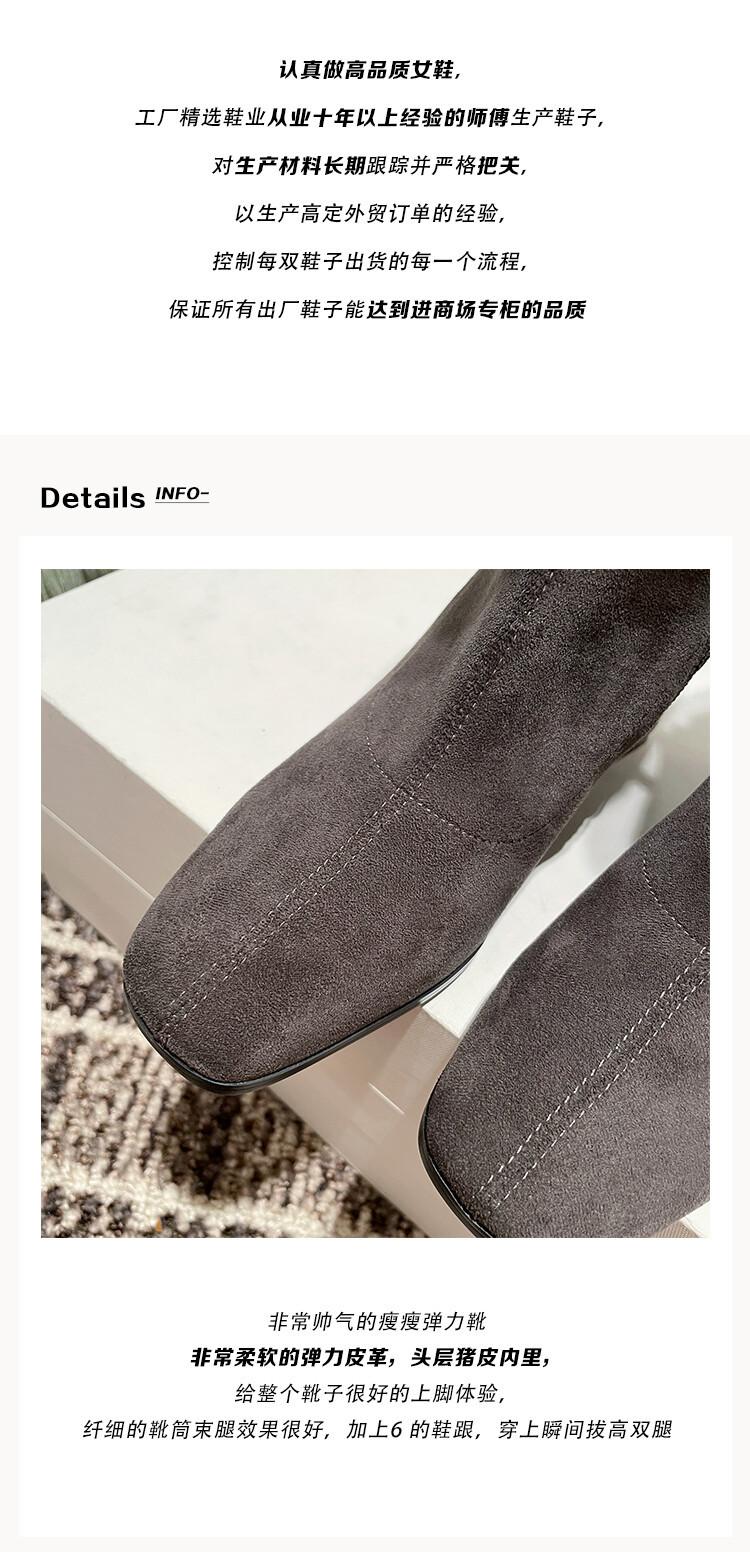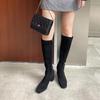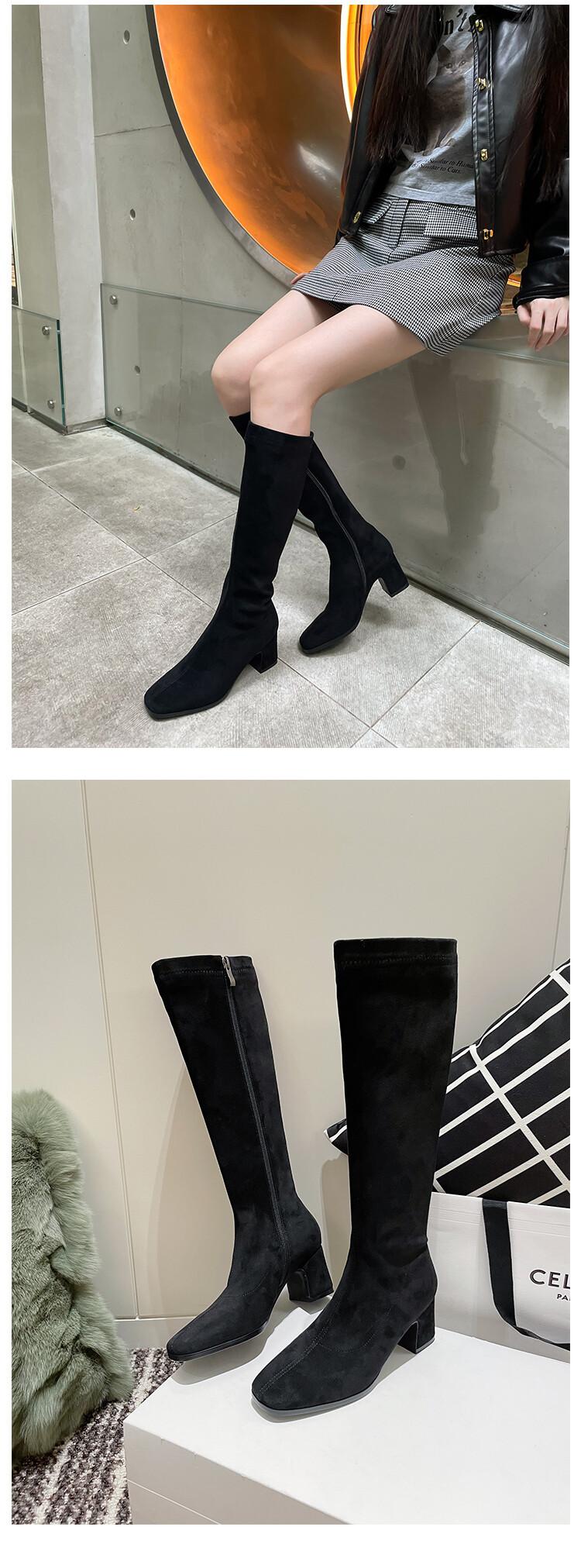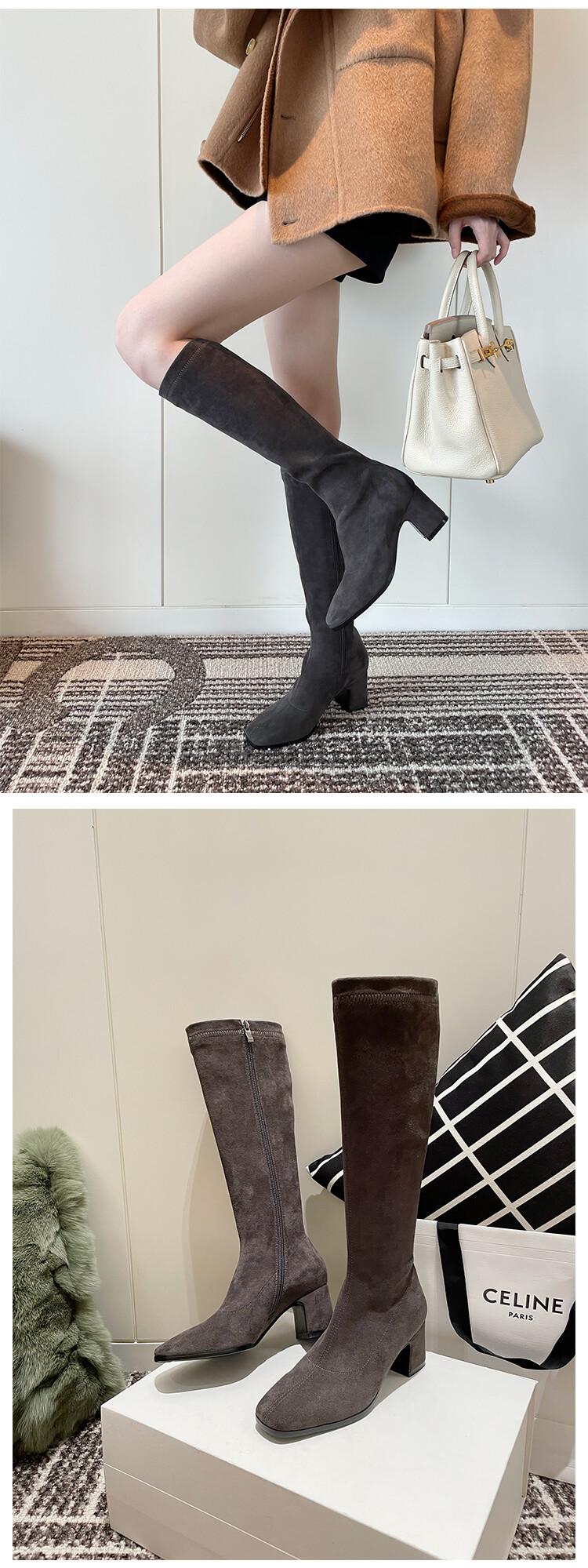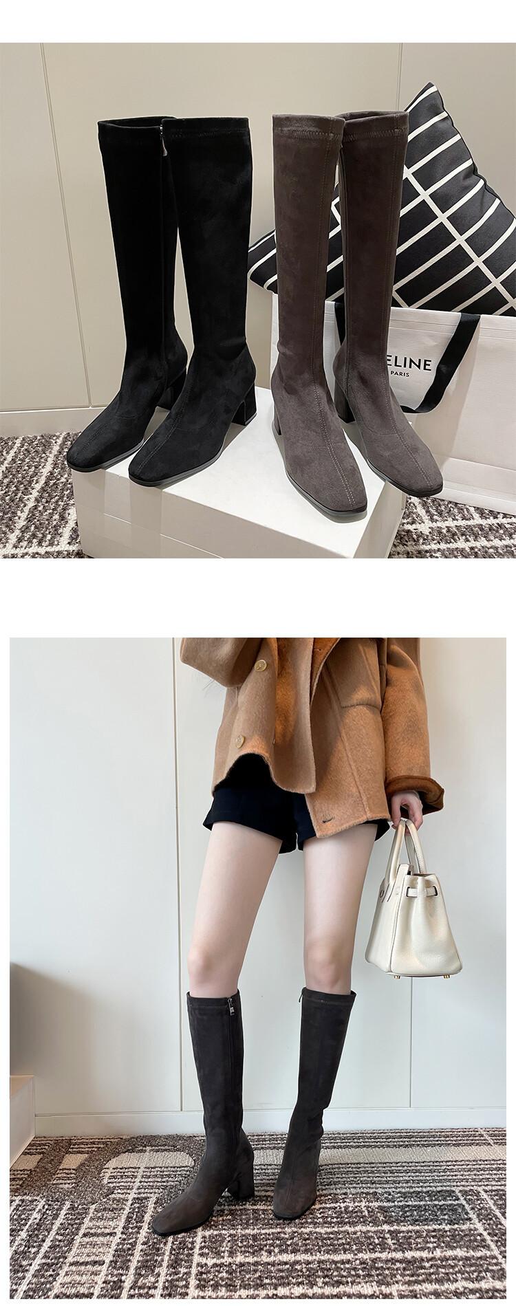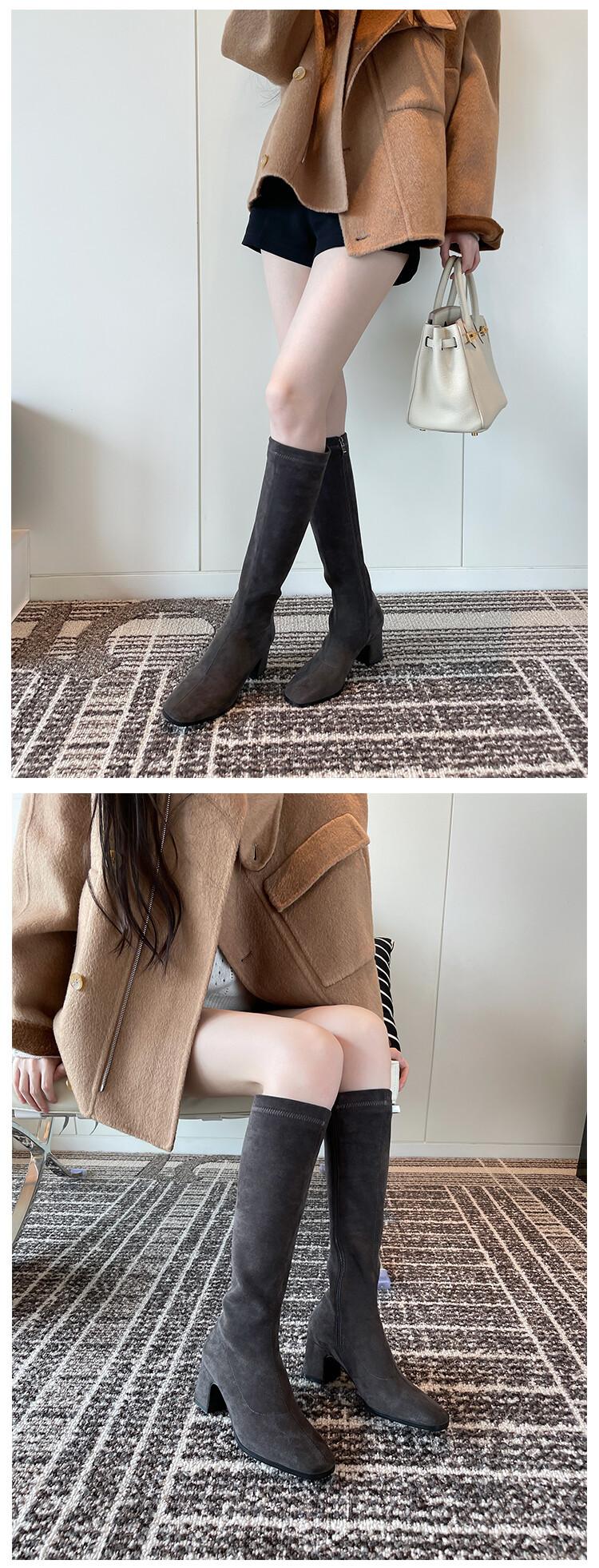 Botas elásticas para mujer, botas largas de ante con punta cuadrada pequeña y tacón alto, botas vintage de tacón grueso y ajustadas.