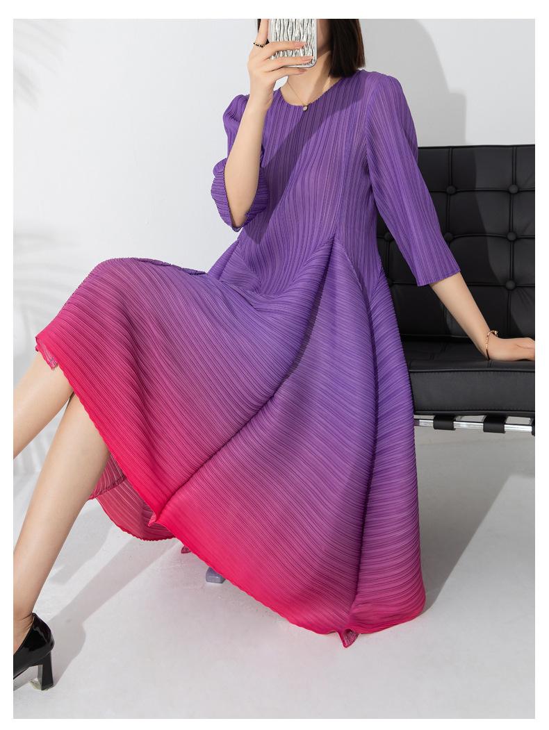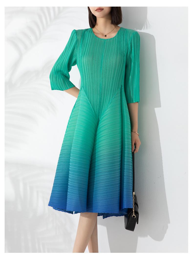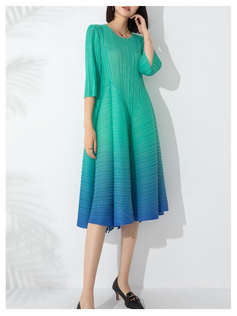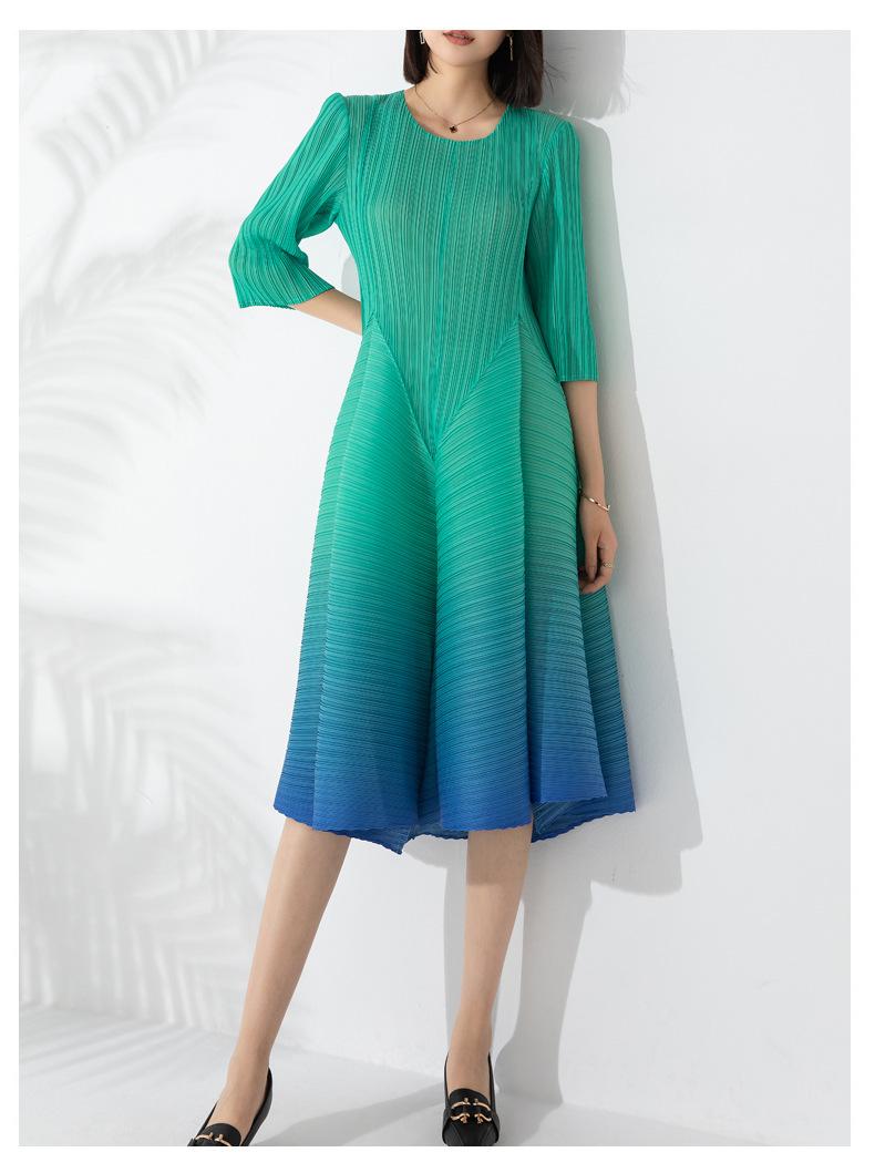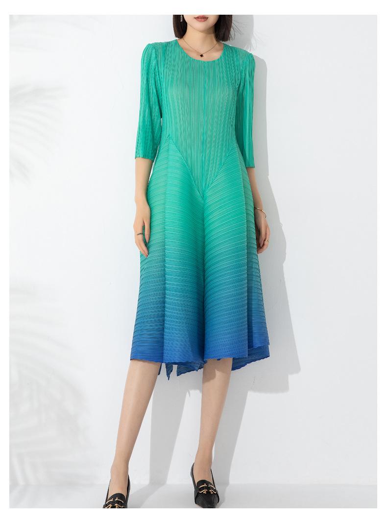 Vestido holgado de talla grande con pliegues estilo europeo y americano, nuevo, de alta gama, elegante, con degradado de color, cuello redondo, mangas de siete puntos y estampado floral.