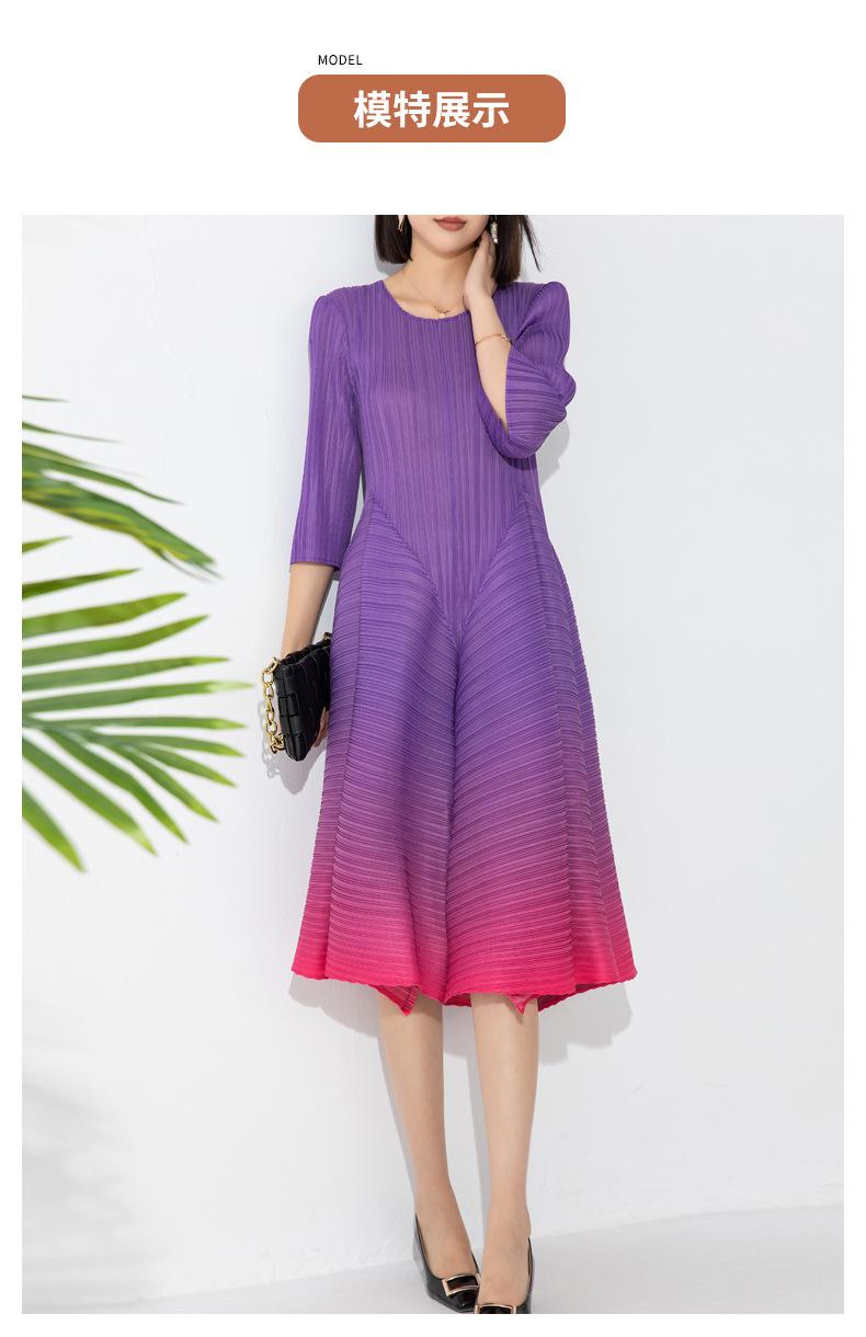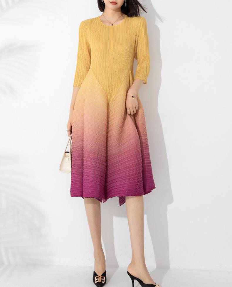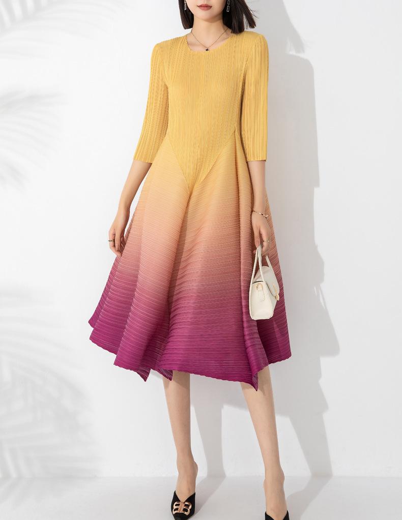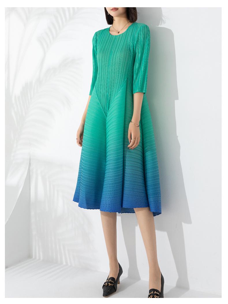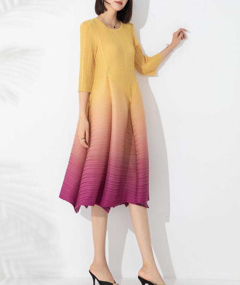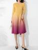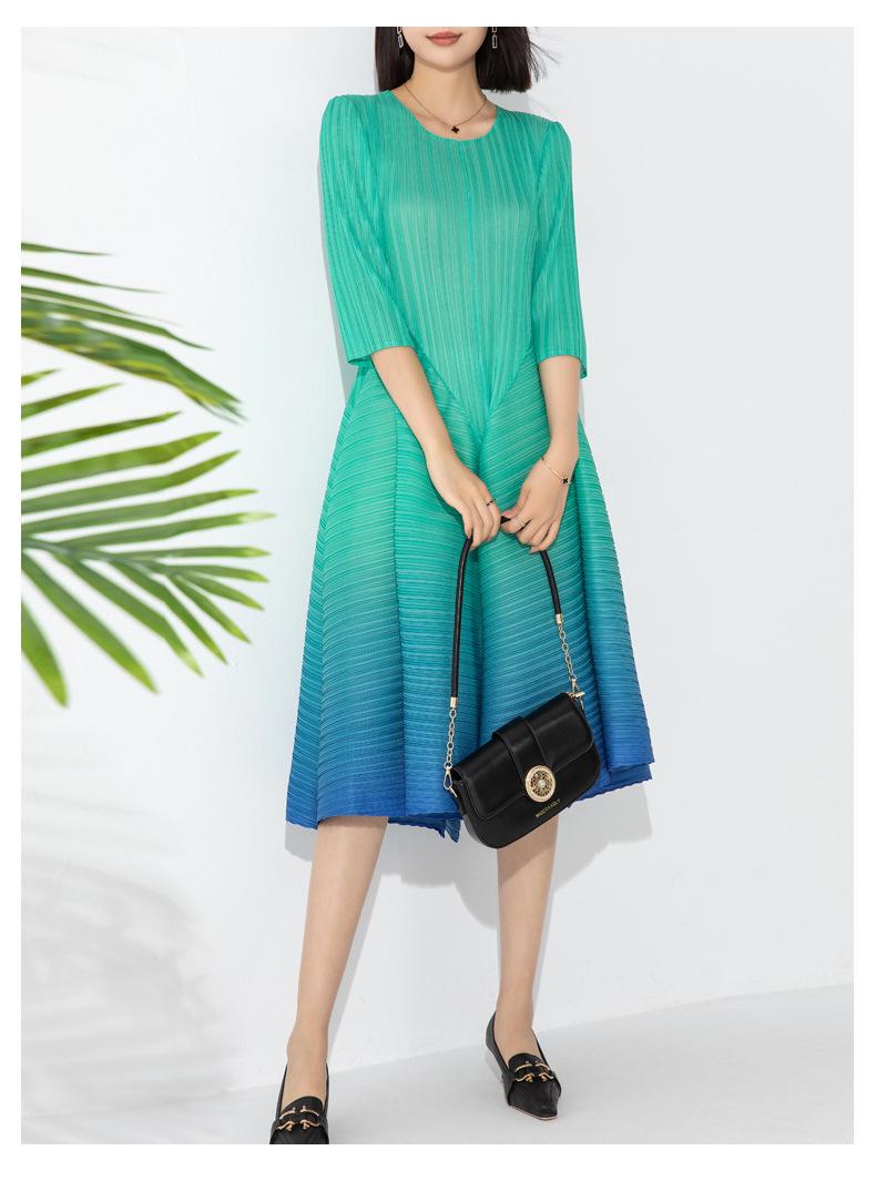 Vestido holgado de talla grande con pliegues estilo europeo y americano, nuevo, de alta gama, elegante, con degradado de color, cuello redondo, mangas de siete puntos y estampado floral.