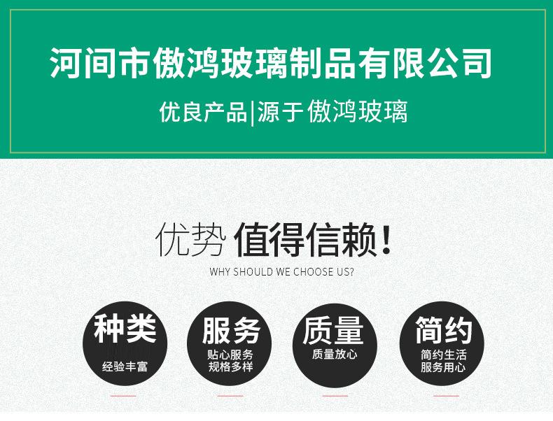 Hejian Aohong Glass Products Co., Ltd. produce y procesa vasos de media luna, vasos Guanshan, vasos de diamante, vasos de vidrio para hervidor de agua fría y otros productos. Cuenta con un sistema de gestión de calidad científico. La integridad, la resistencia y la calidad de sus productos han sido elogiadas por la industria. Invitamos a amigos de todos los ámbitos a visitarnos, guiarnos y negociar.