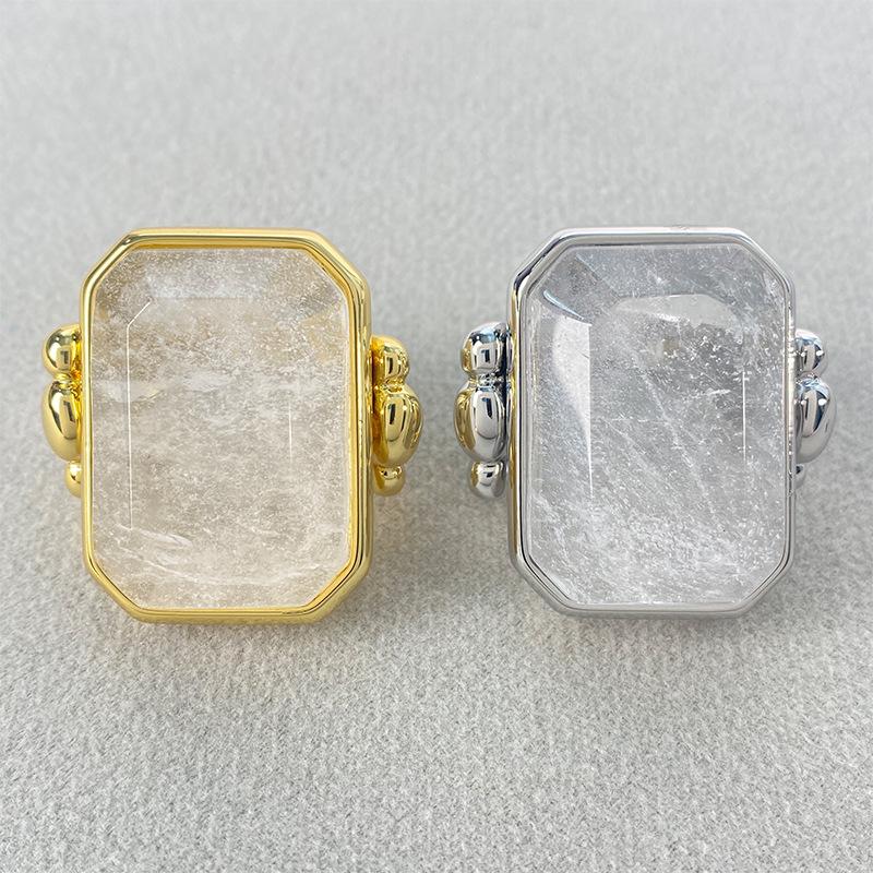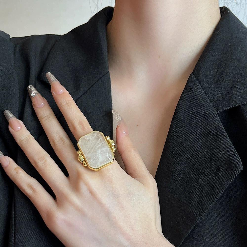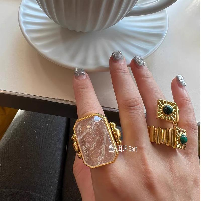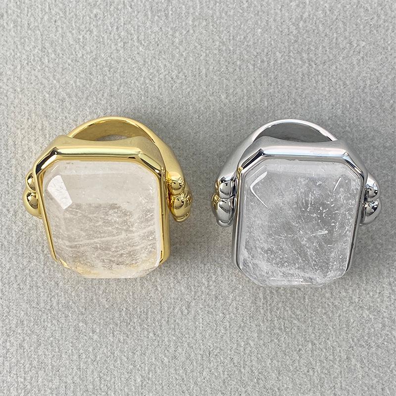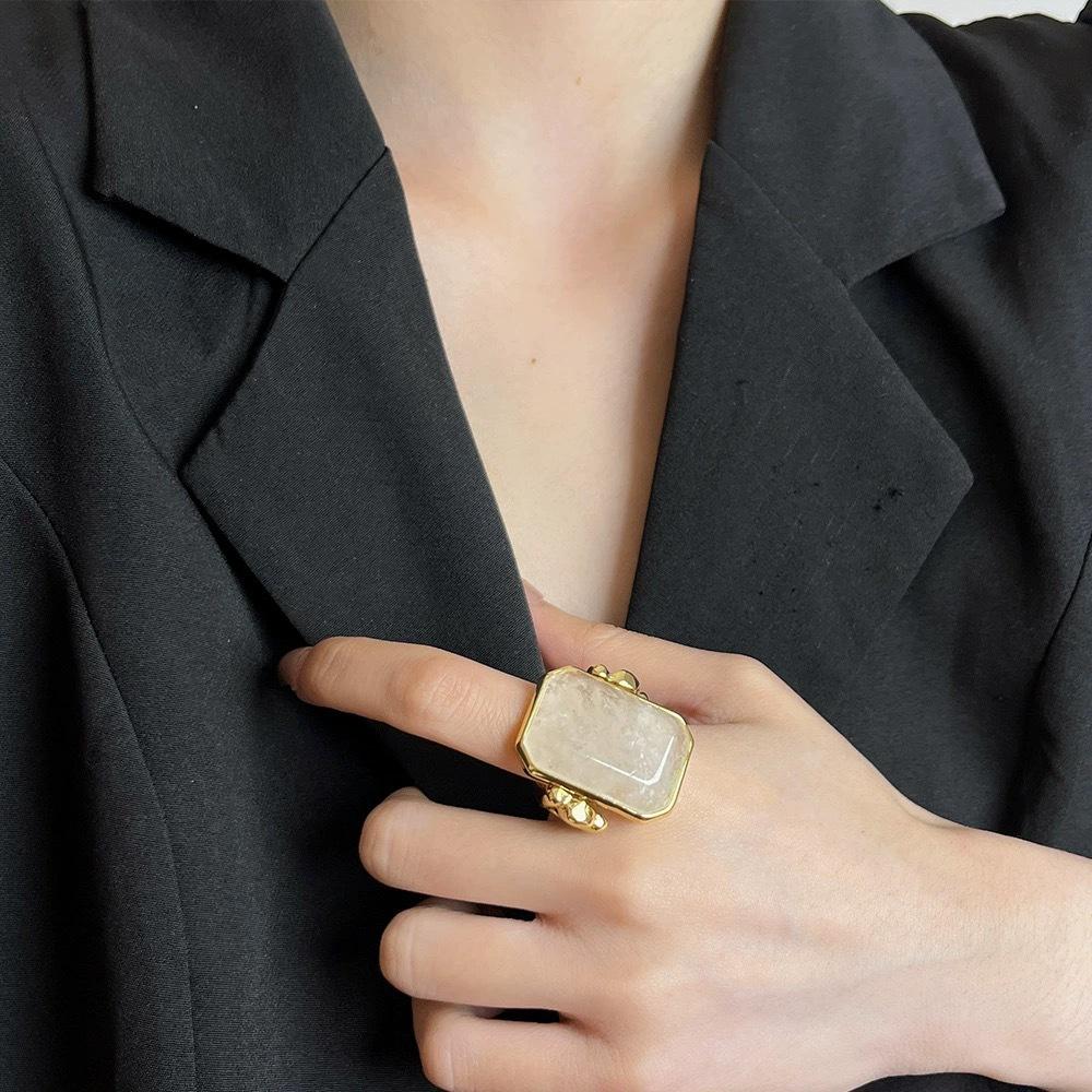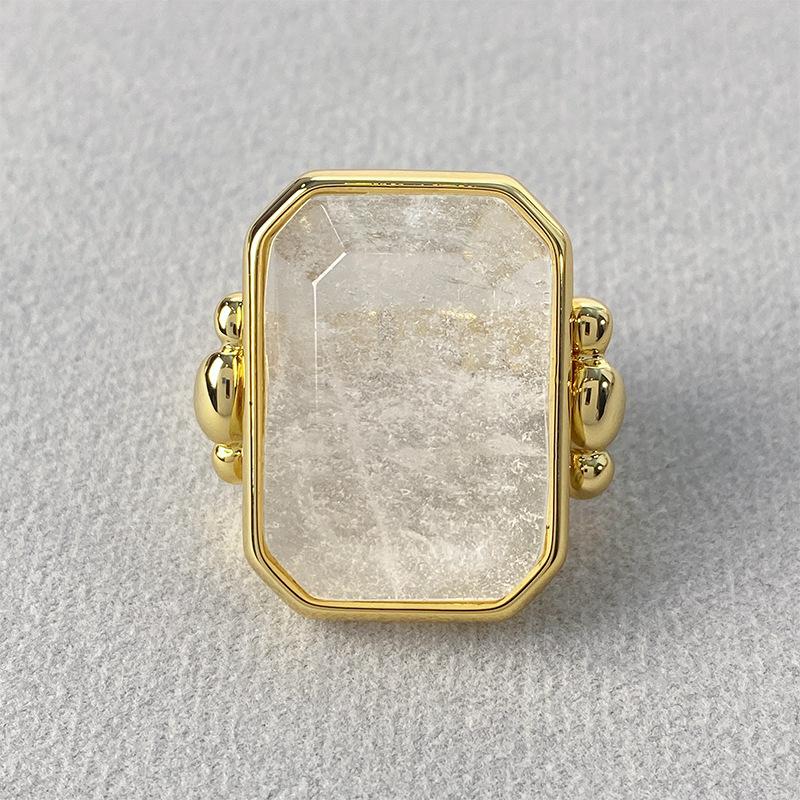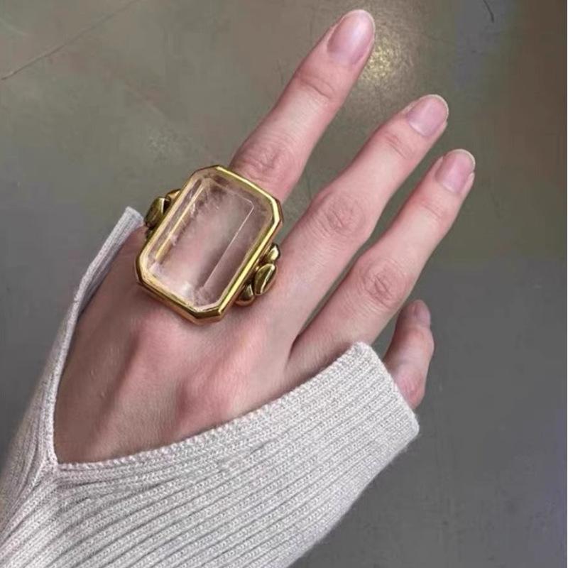 Anillo de Cristal de Piedra Natural Cuadrado de Moda Vintage Francés Personalidad Exagerada Chapado en Oro al Vacío Sensación de Alta Gama