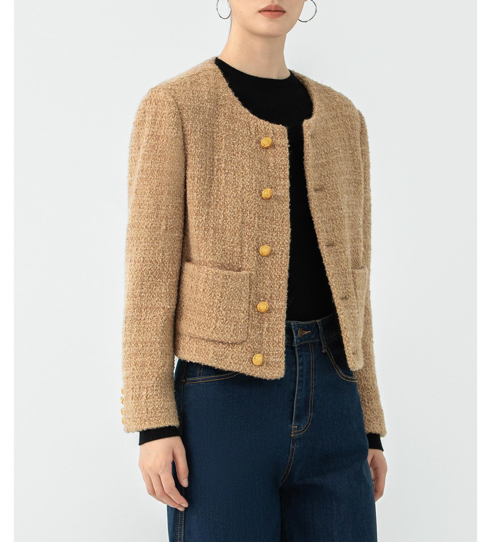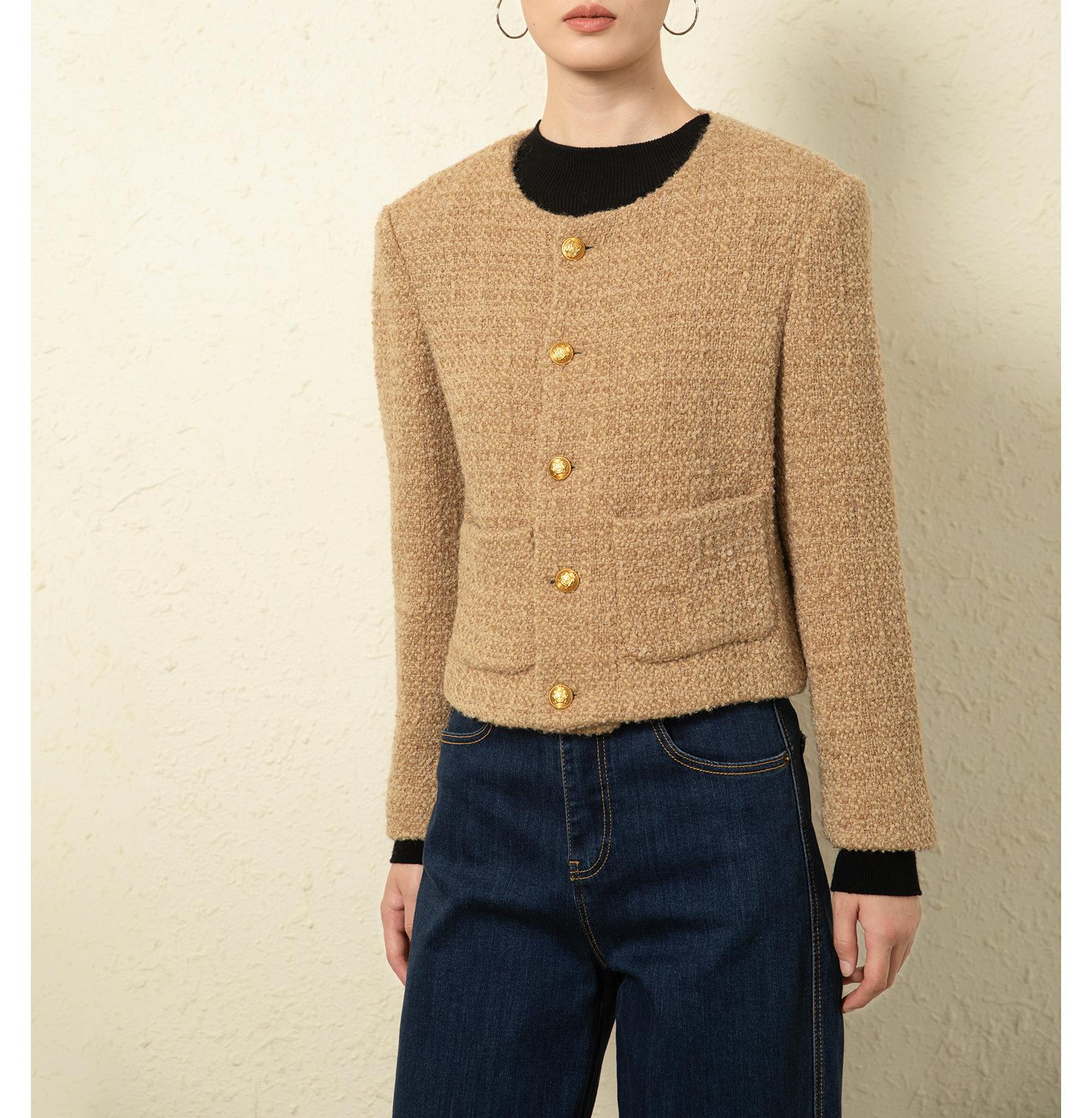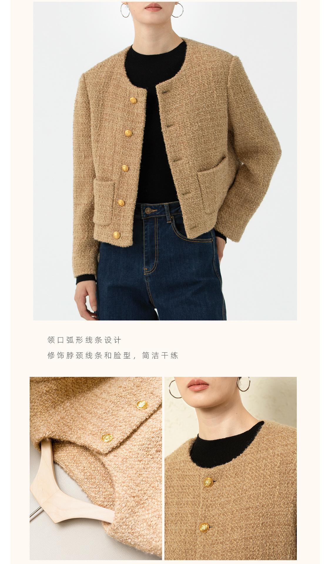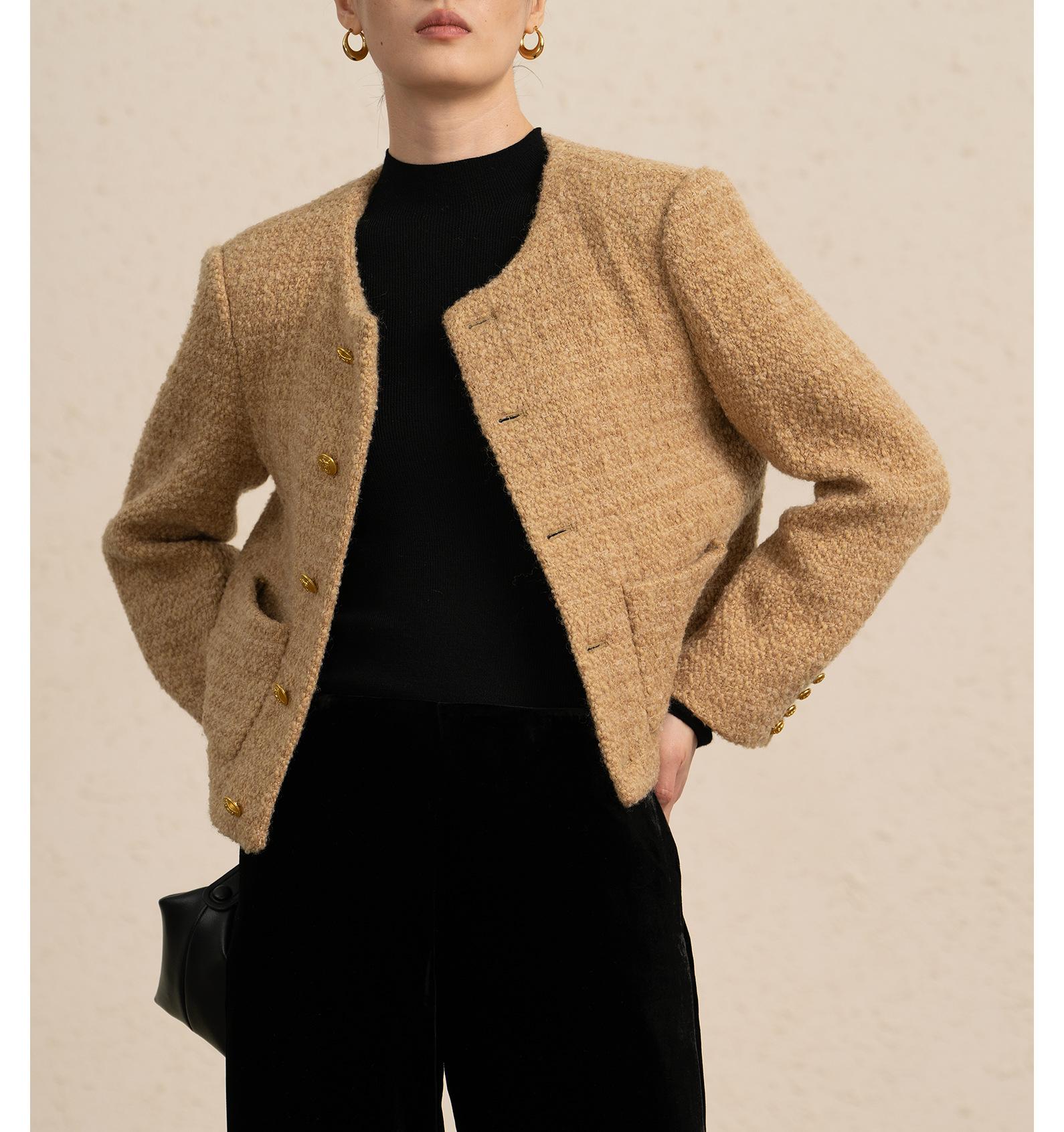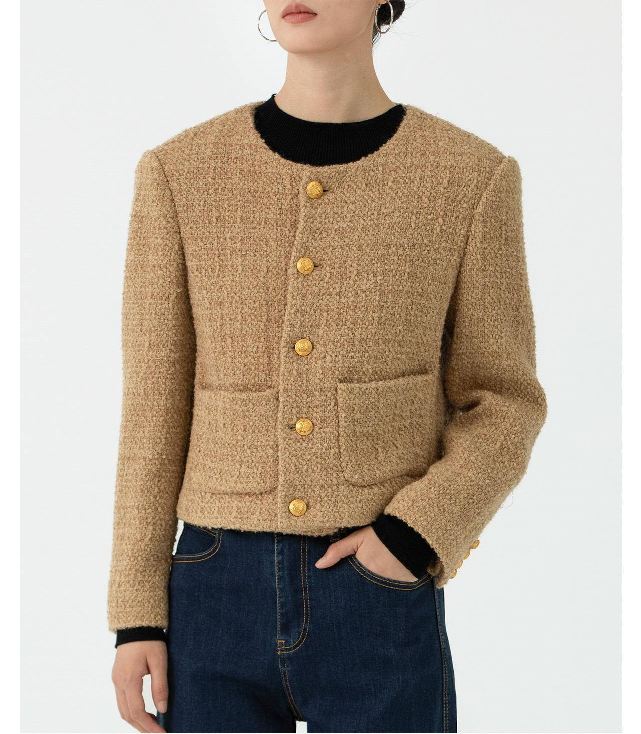Chaqueta de Tweed de Lana Estilo Francés de Otoño Temprano de Cuello Redondo Corto Estilo Holgado Simple de Un Botón para Mujer