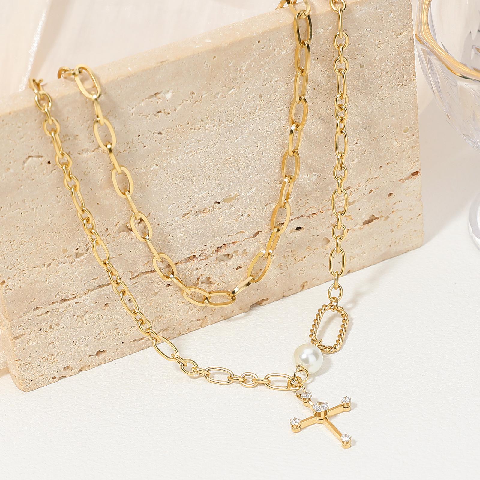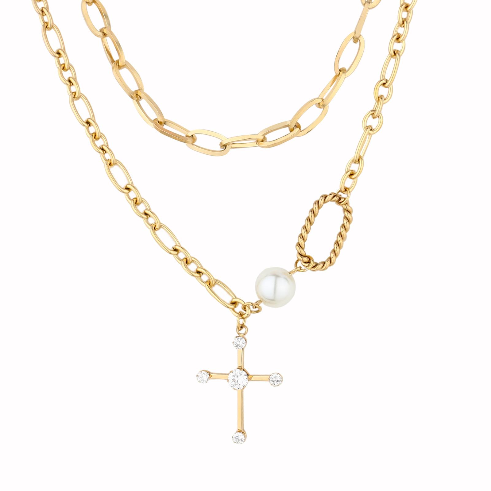Collar largo con colgante de cruz de perla de doble capa, estilo INS transfronterizo europeo y americano, estilo dulce y genial, hecho a mano con AMOR