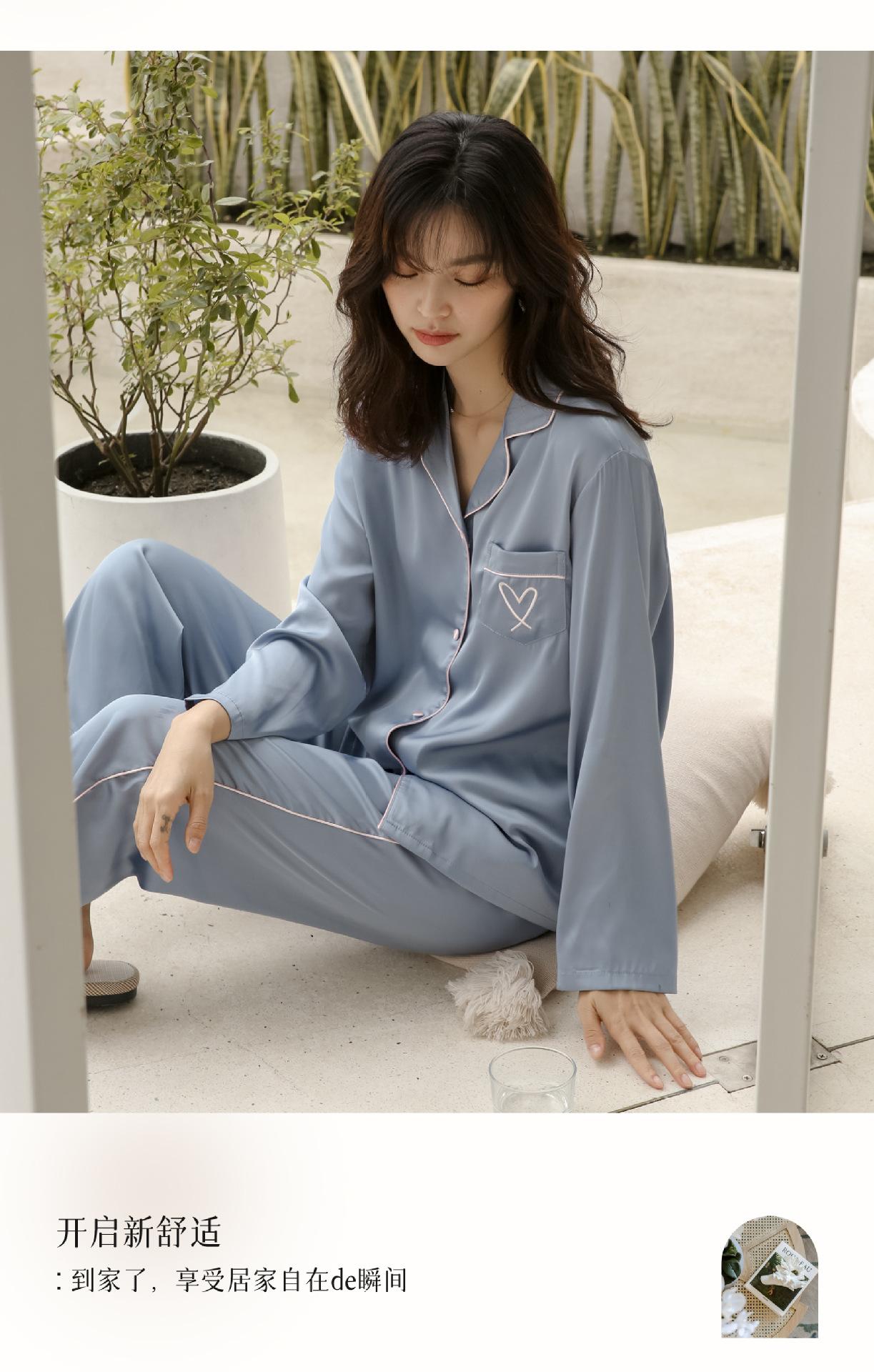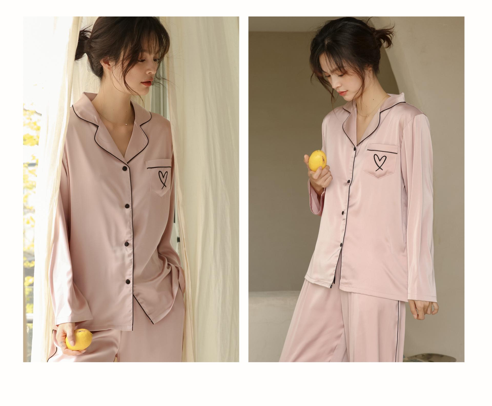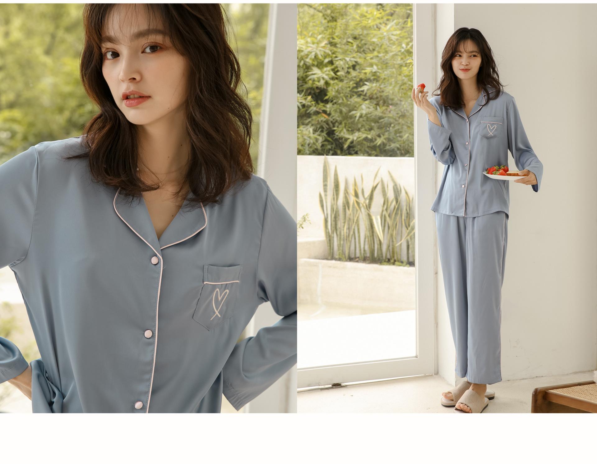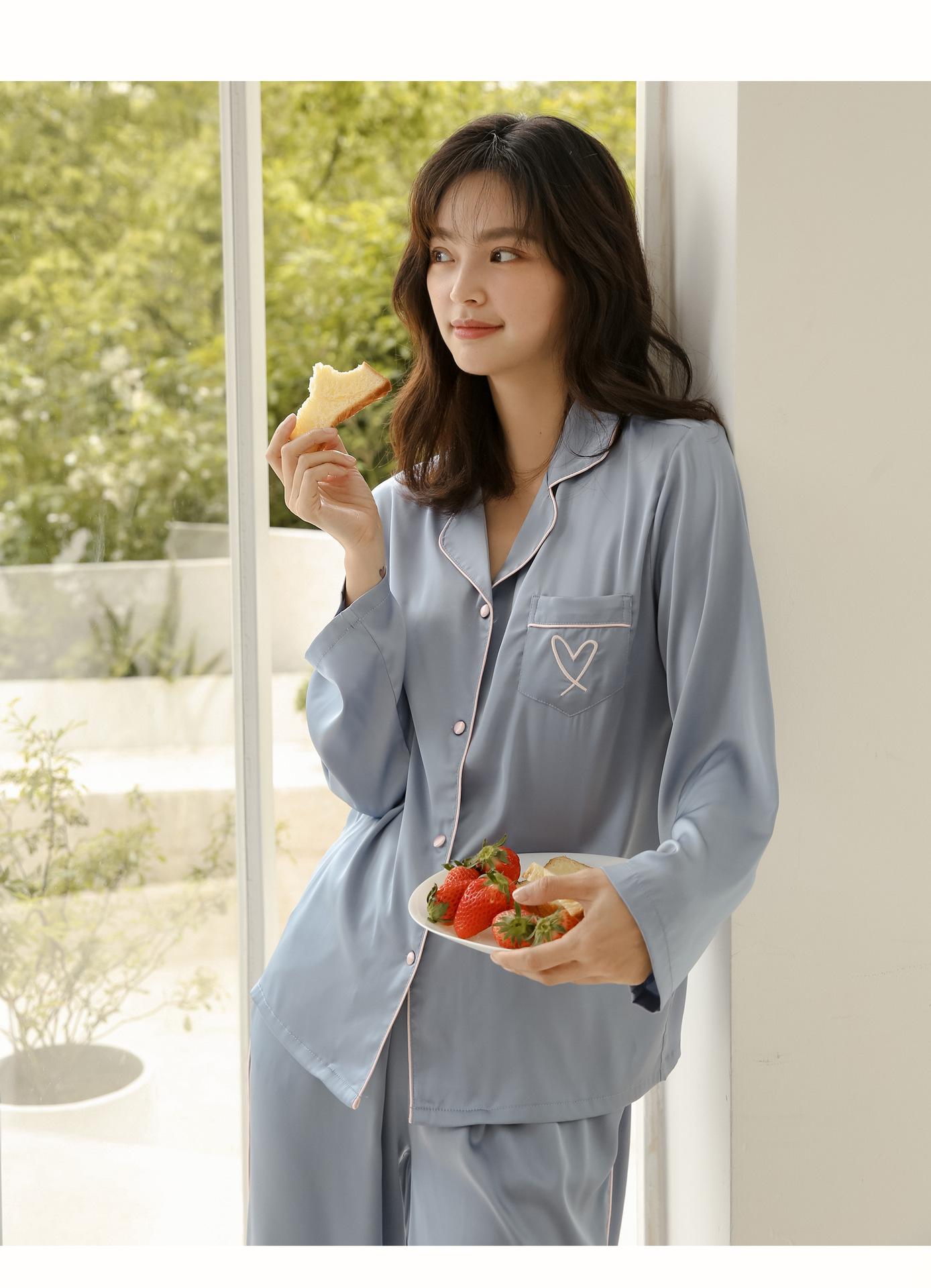 Pijama de Corazón Bordado para Mujer, Pantalón Fino Fresco de Seda de Hielo de Manga Larga, Conjunto de Dos Piezas, Ropa de Descanso Casual de Seda para Mujer